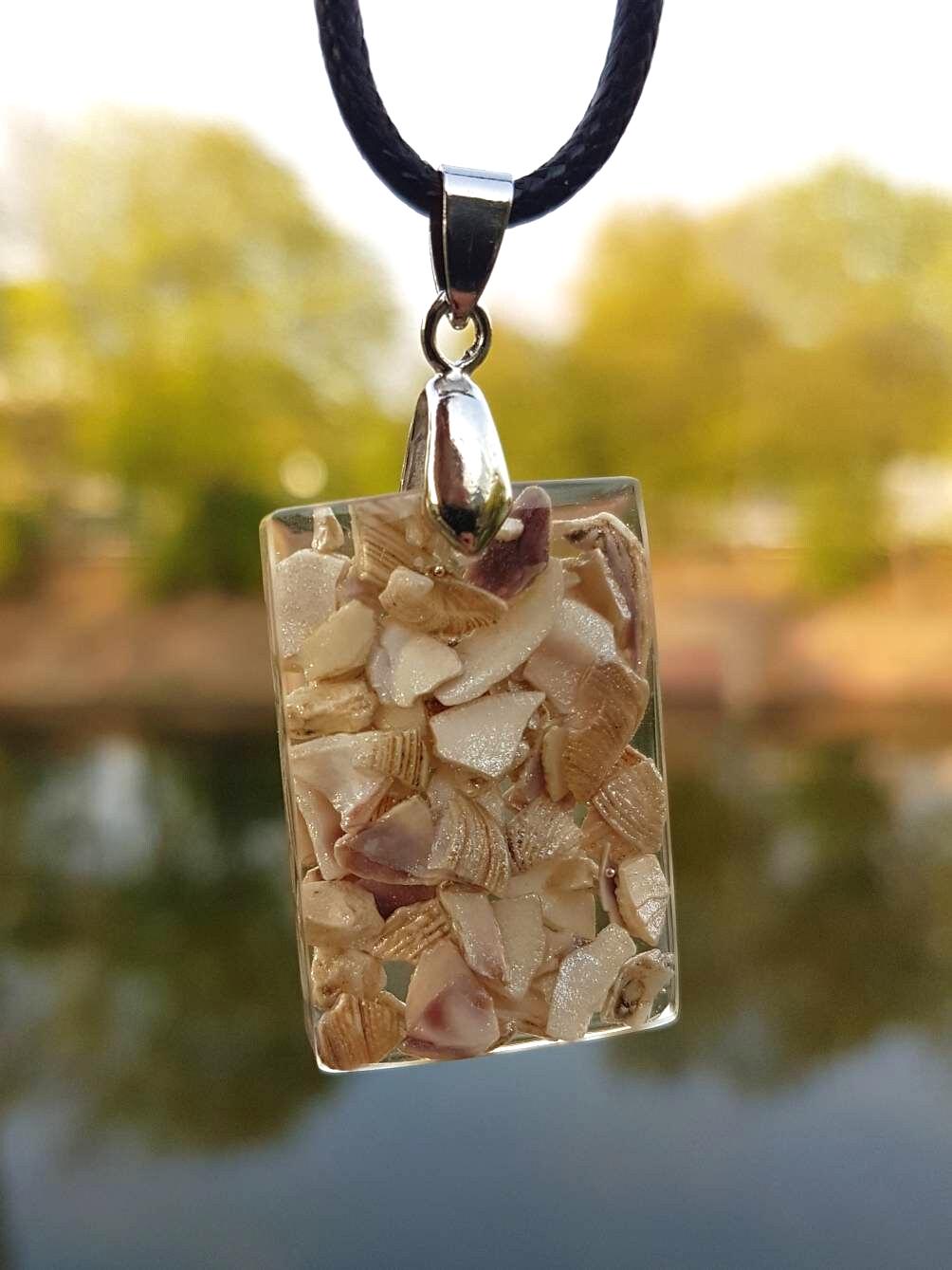Necklace with rectangular pendant with slightly glittering shell fragments in transparent epoxy resin.