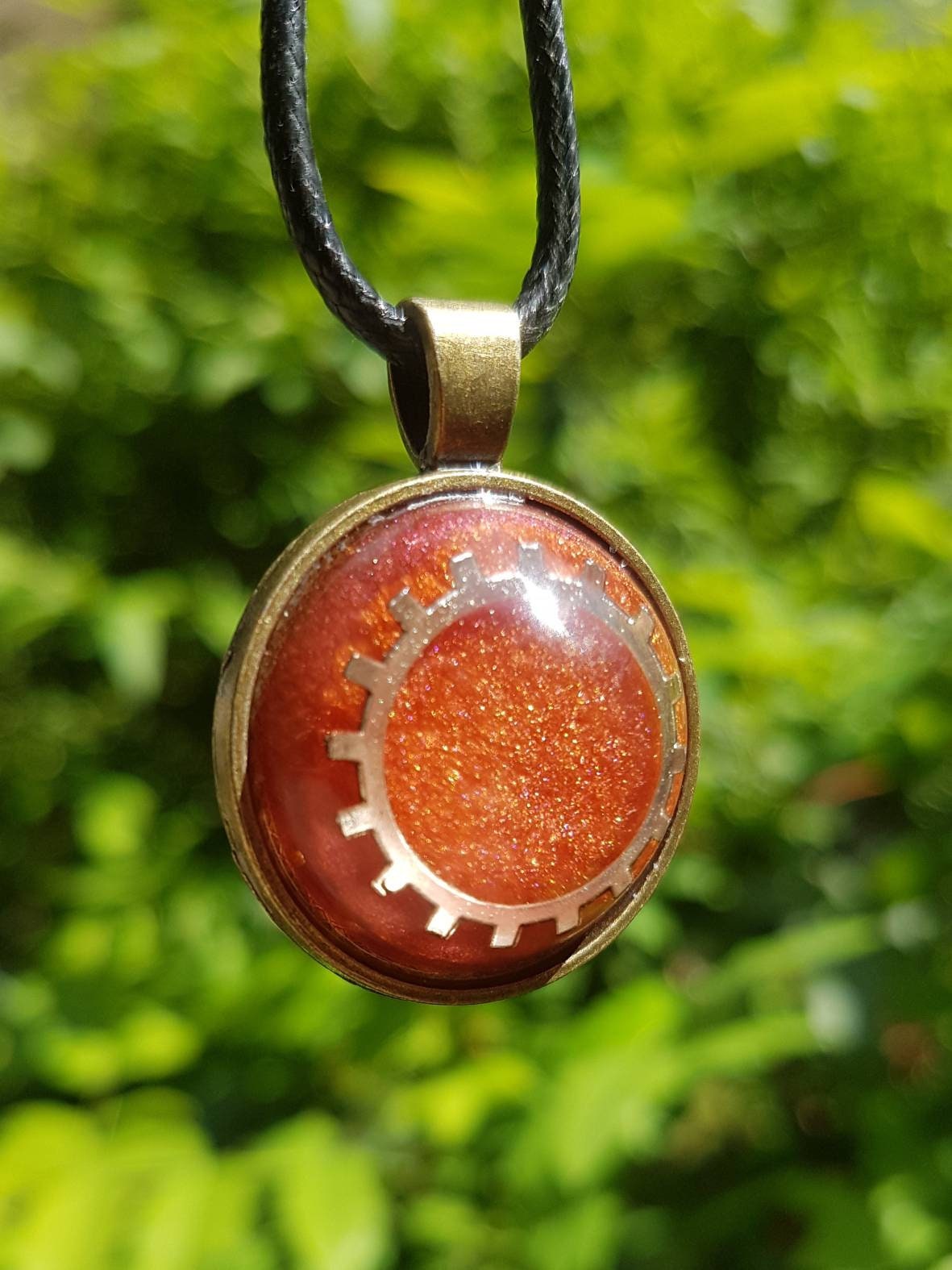 Necklace with round pendant: Amulet with silver gear wheel cast in metallic bronze-colored epoxy resin - setting in antique bronze.
