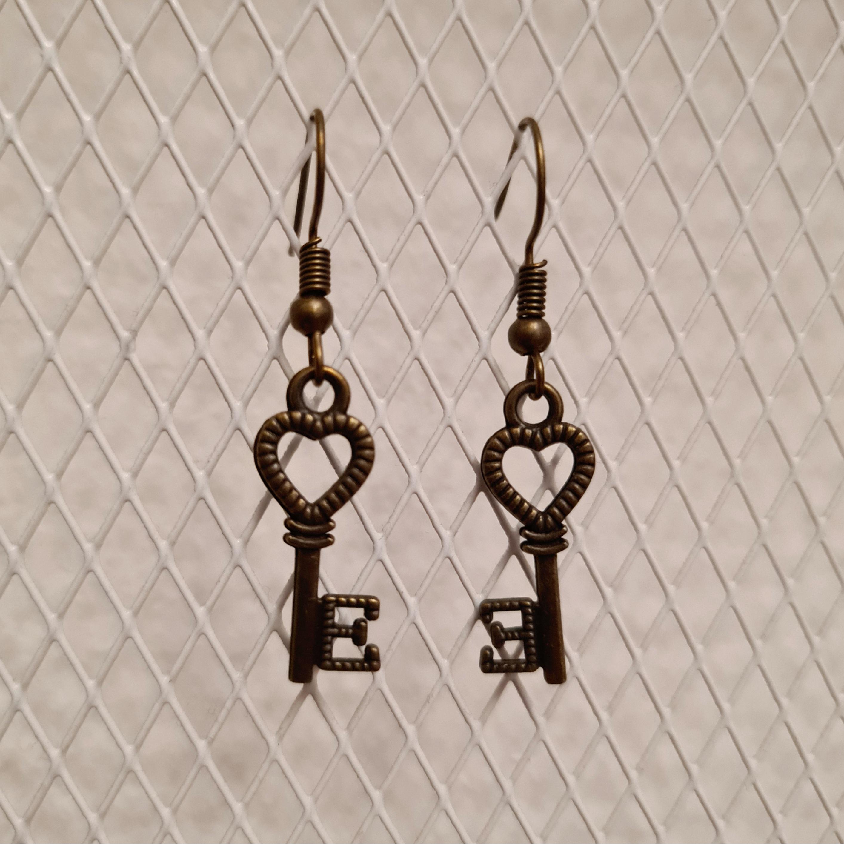 Earrings / ear pendants with small keys in antique gold / antique bronze with hearts and the letter E
