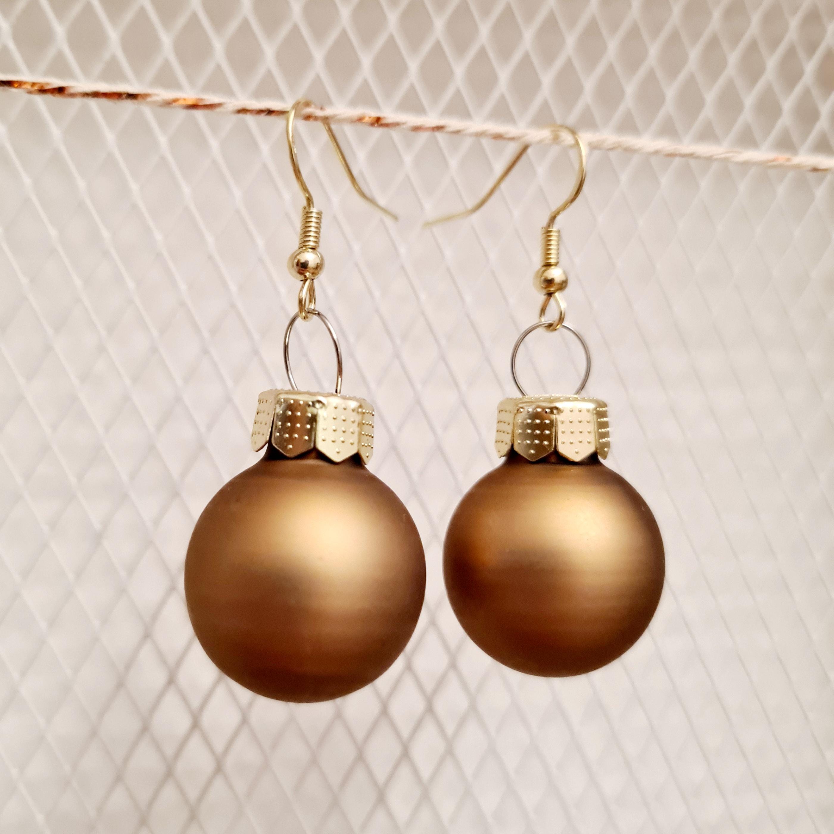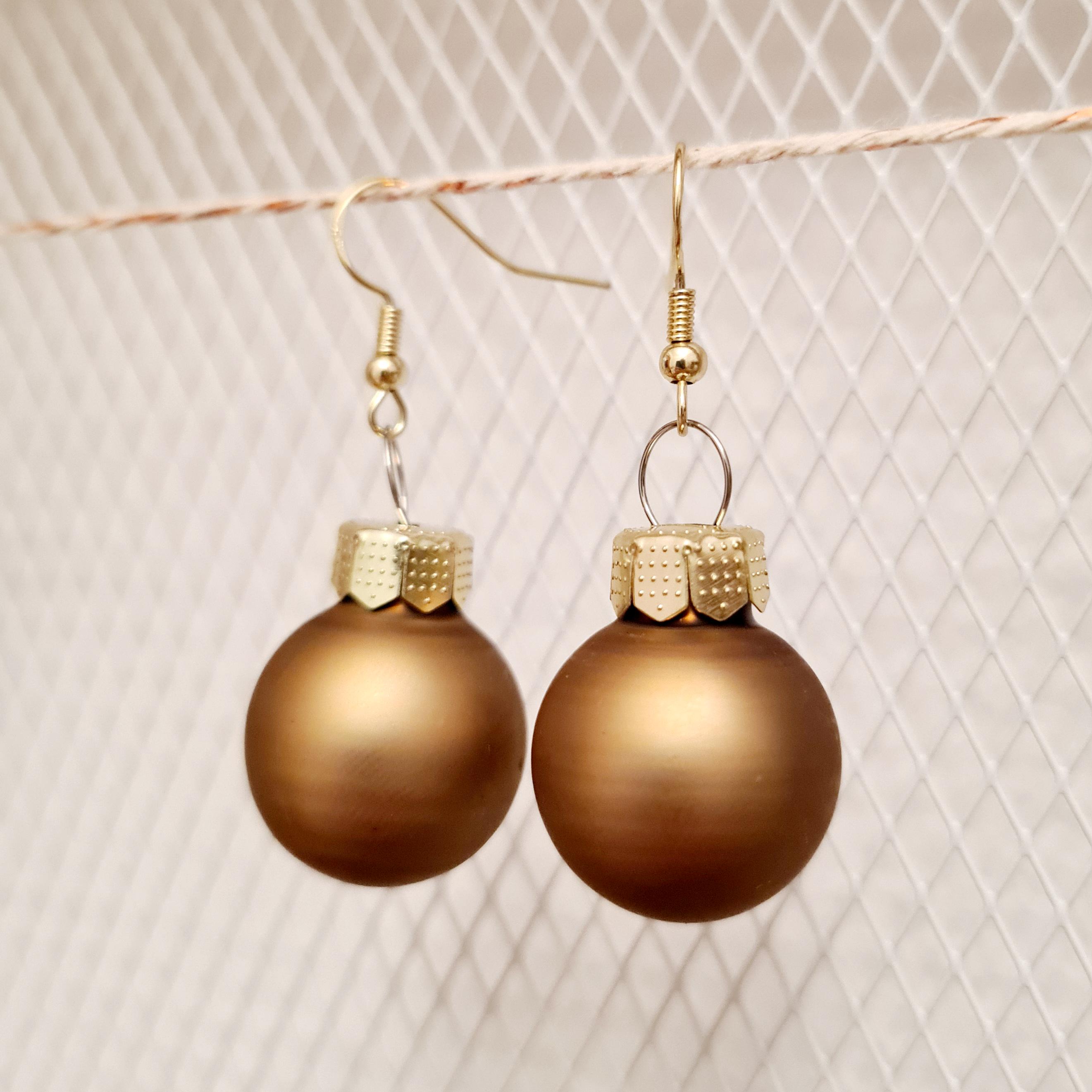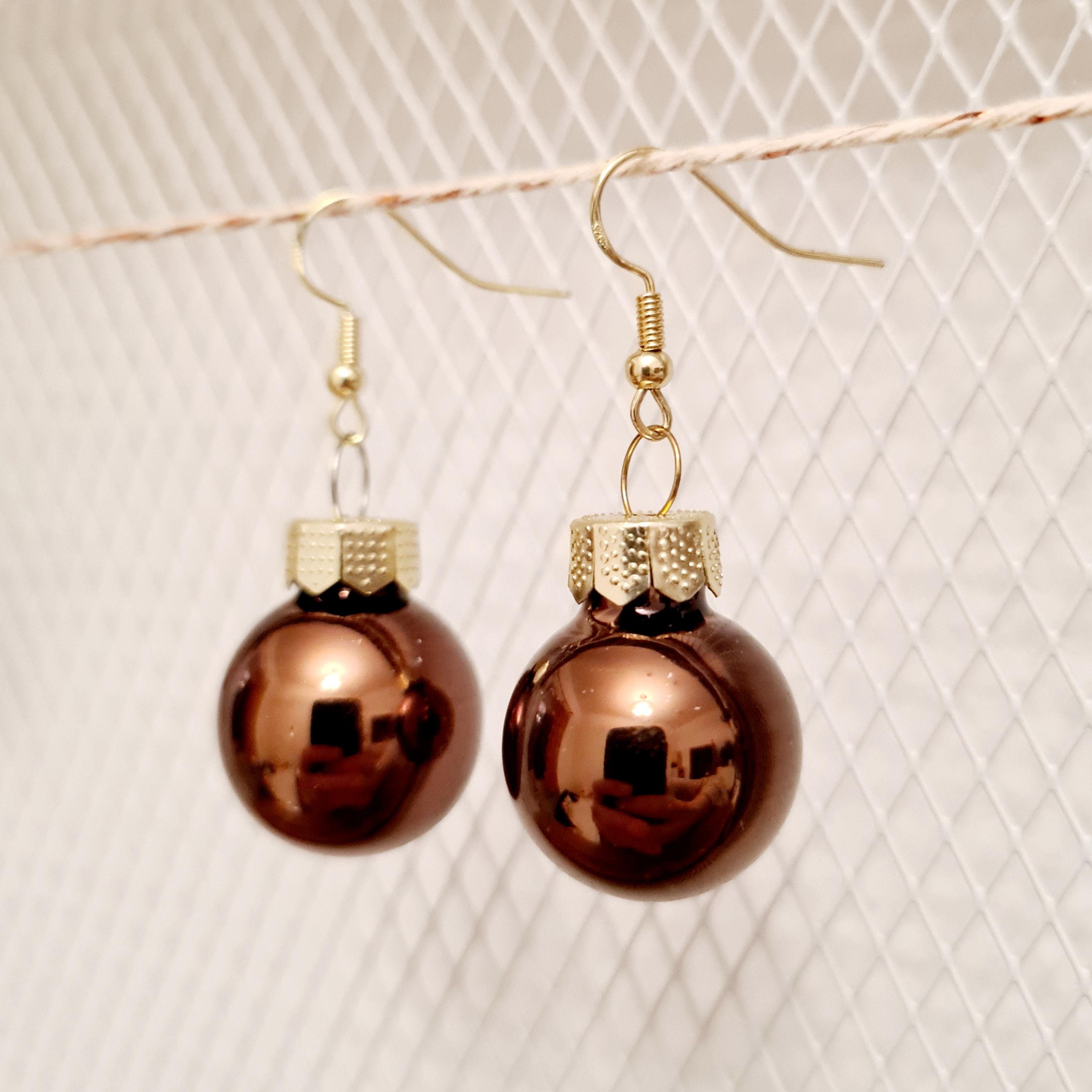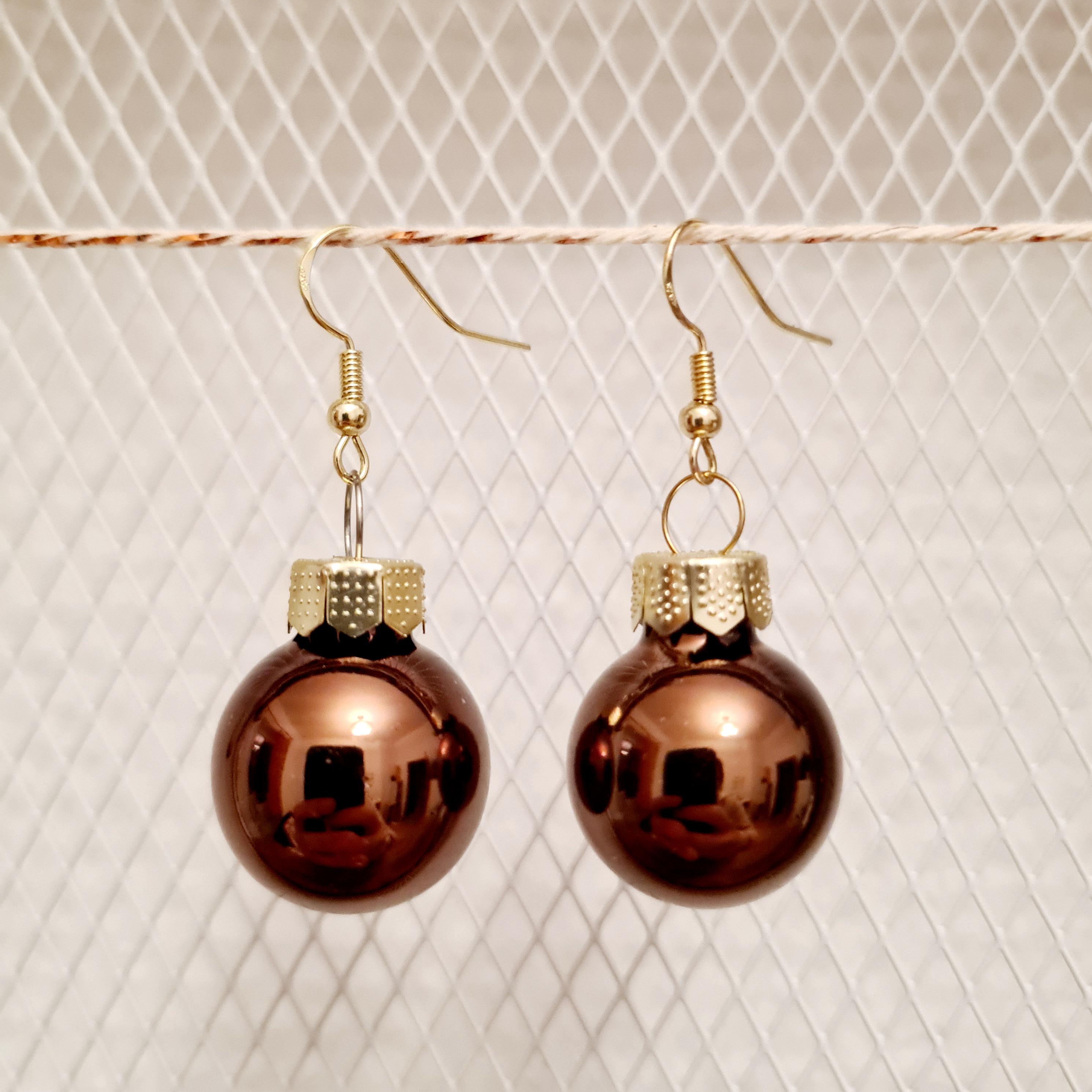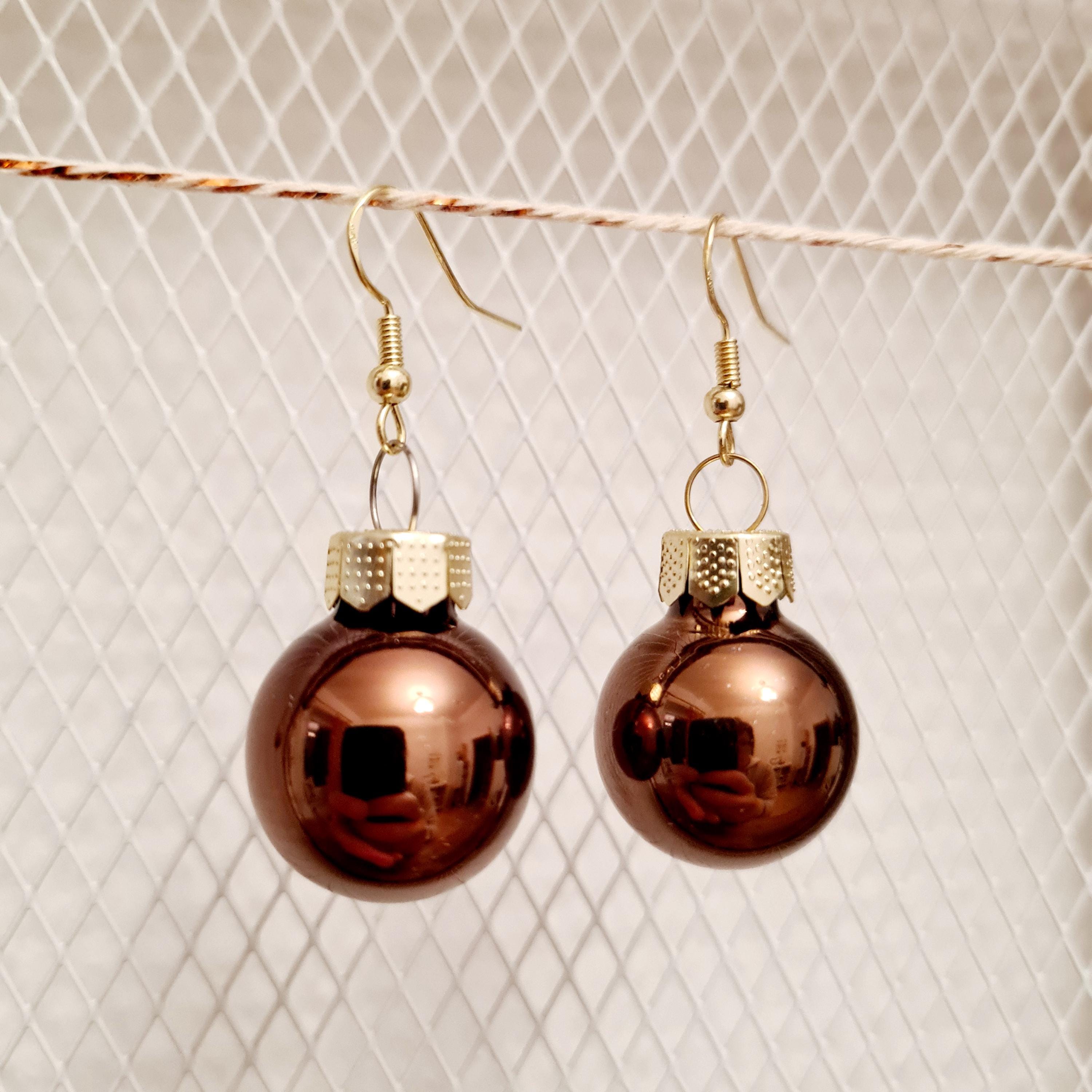 Christmas earrings with brown Christmas tree balls in matte and shiny finish.