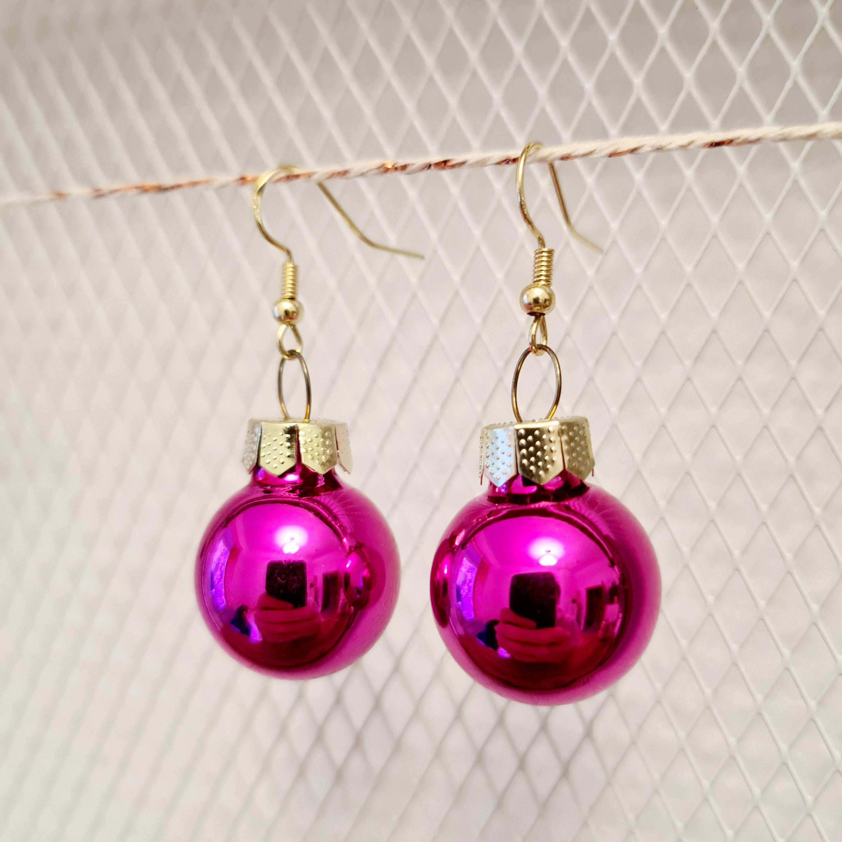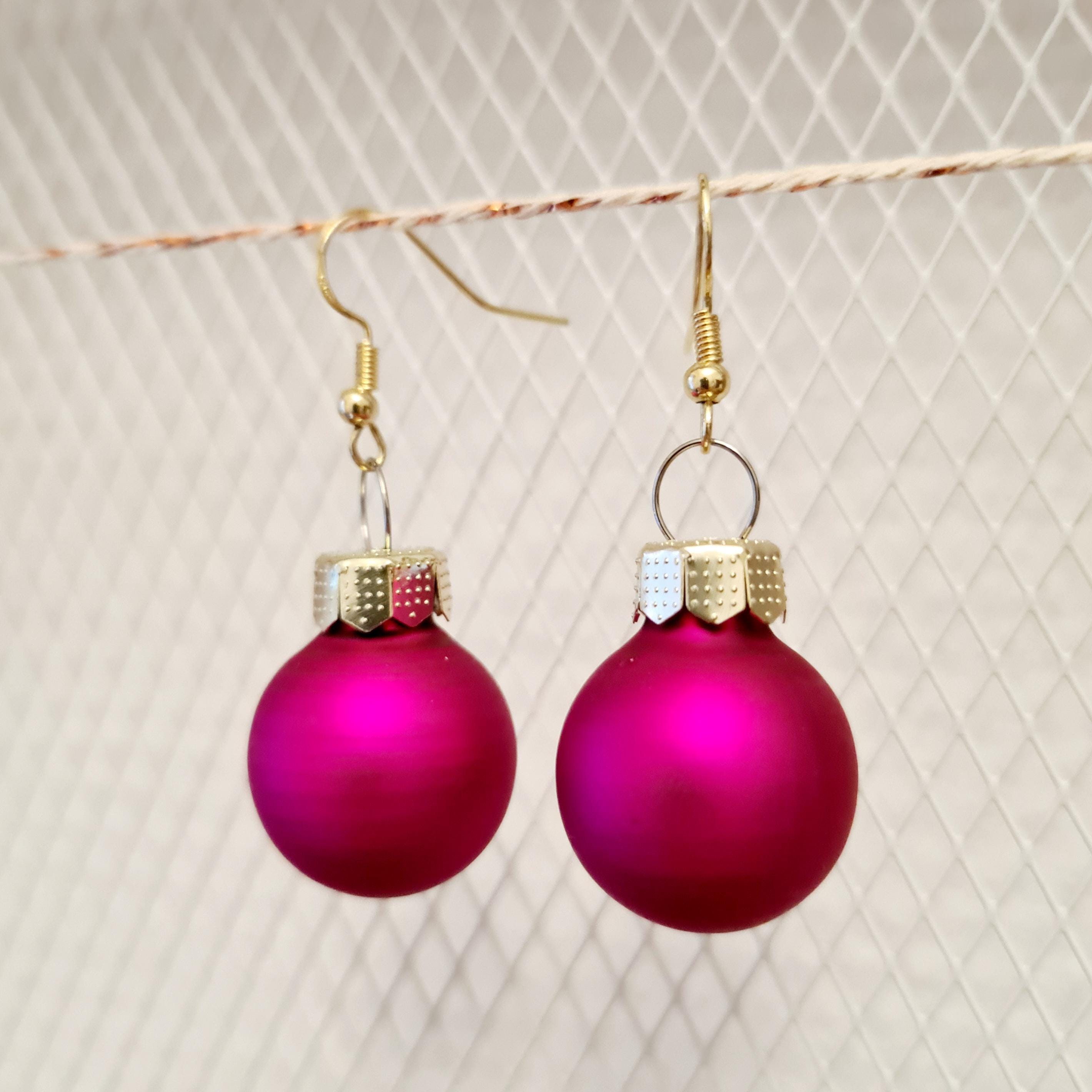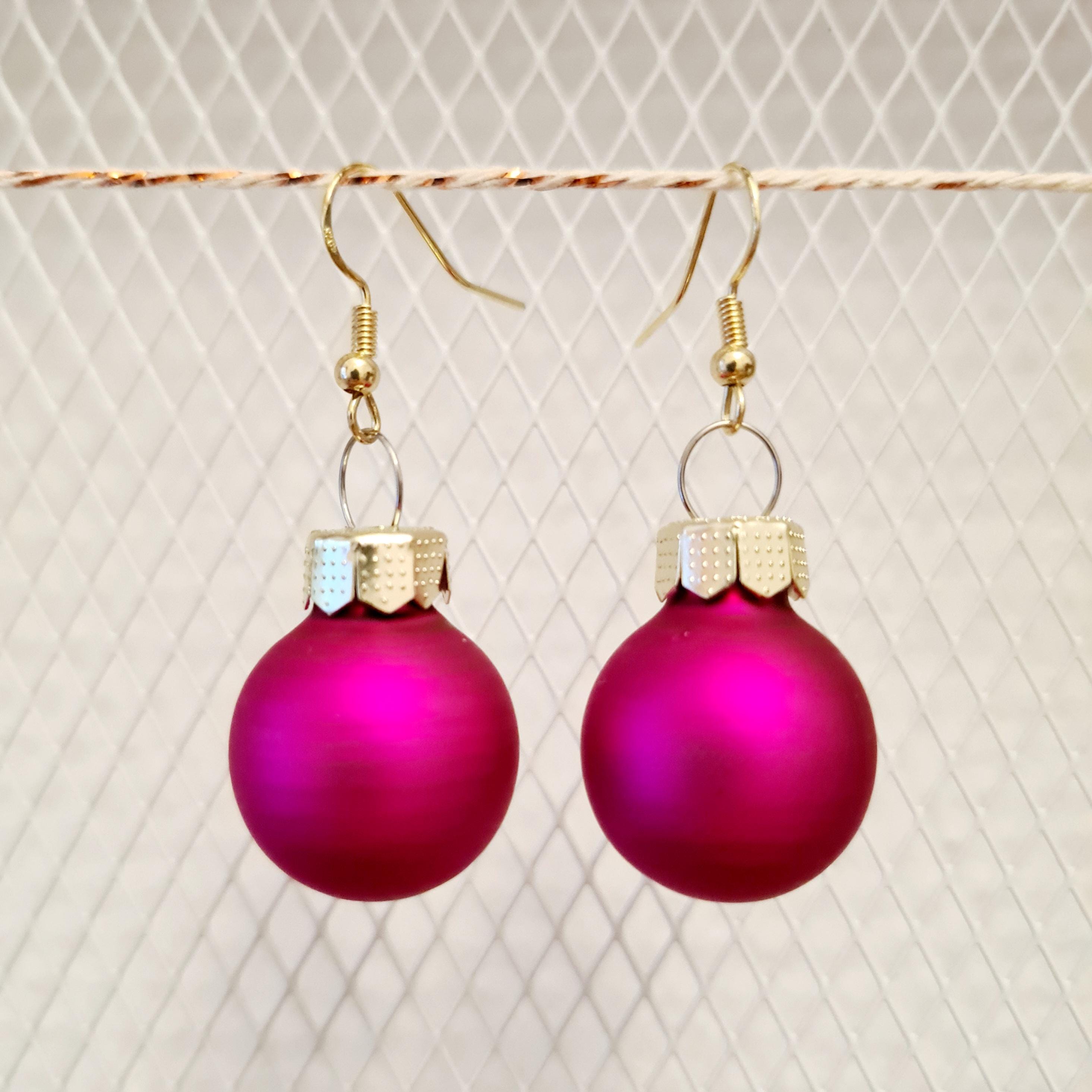 Christmas earrings with pink Christmas tree balls in matte and shiny finish.