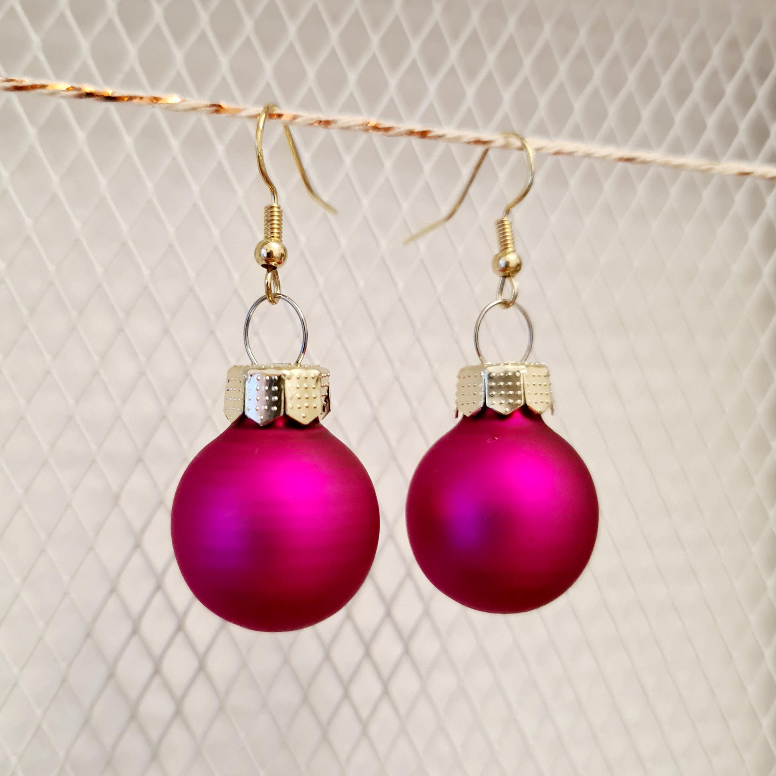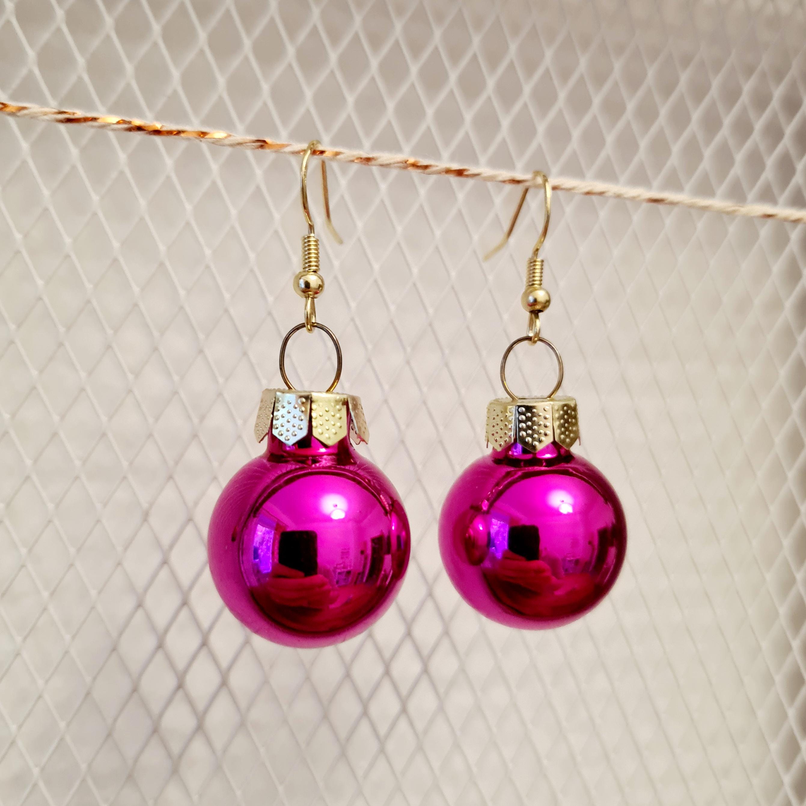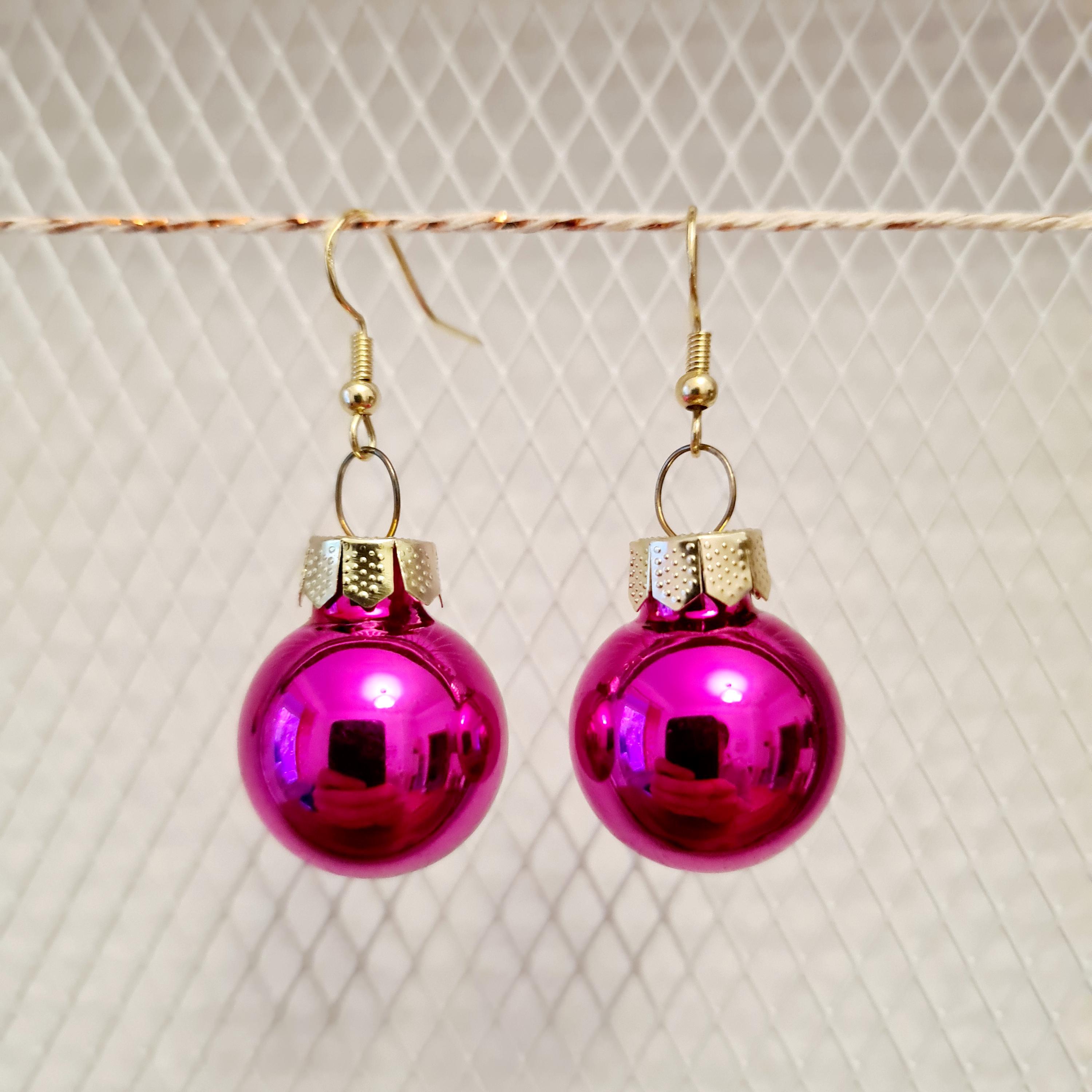 Christmas earrings with pink Christmas tree balls in matte and shiny finish.