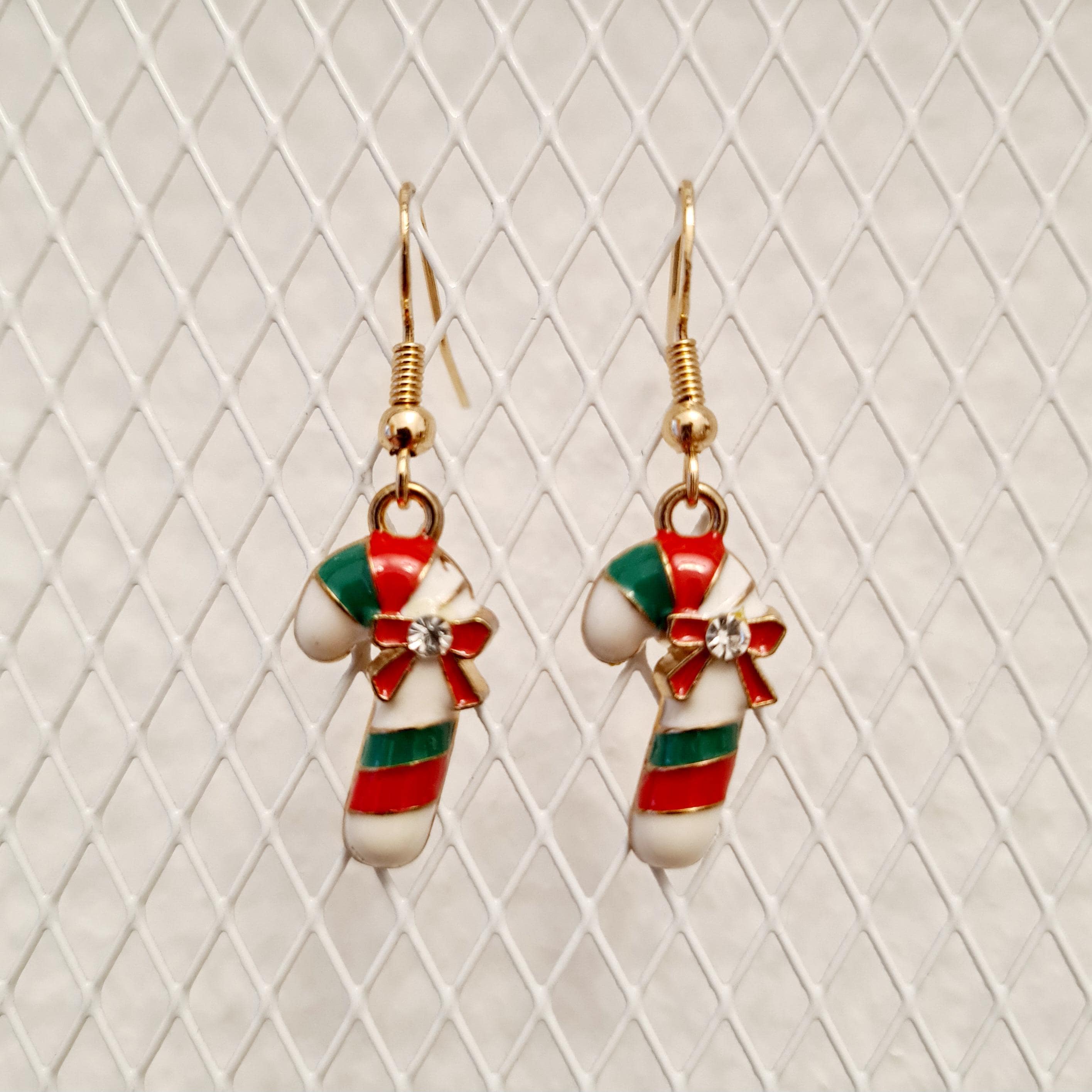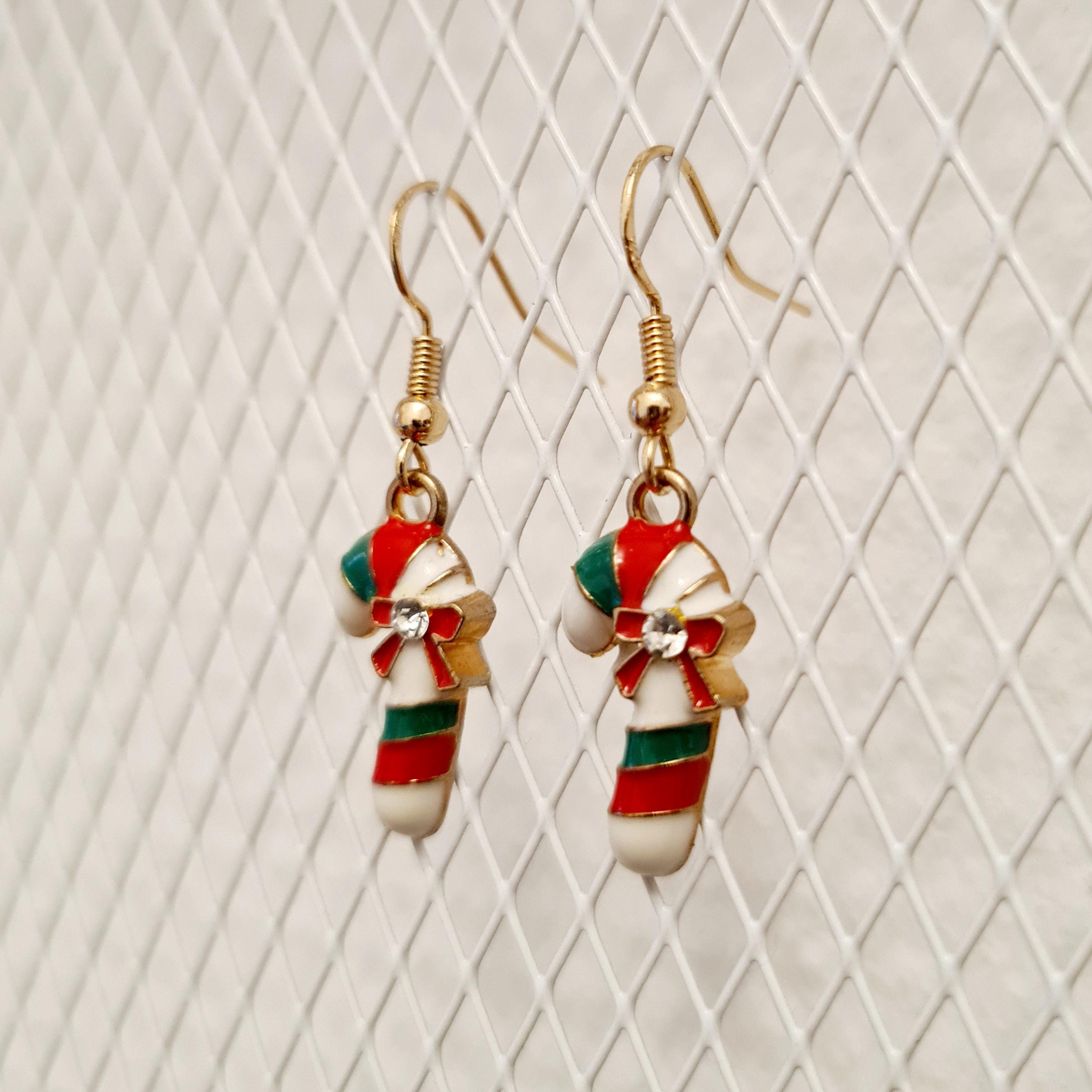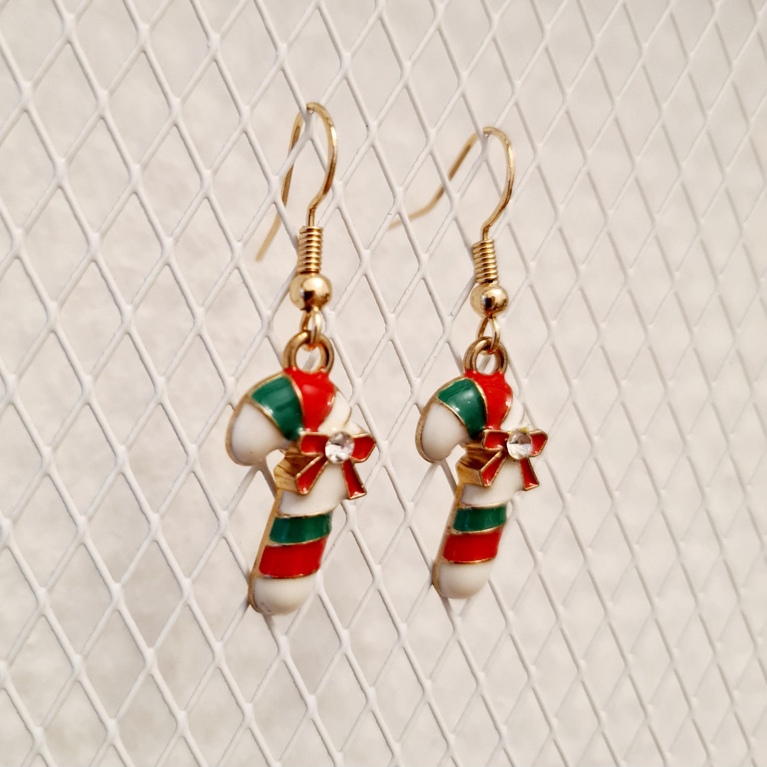 Earrings with small, cute candy canes, a bow, and glitter stones.