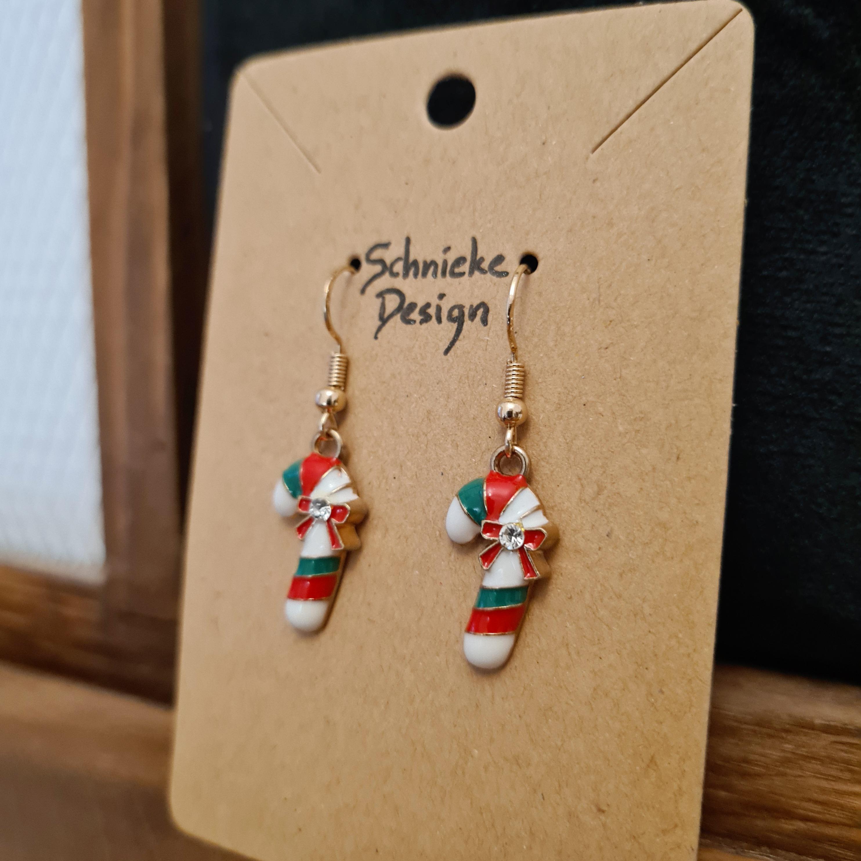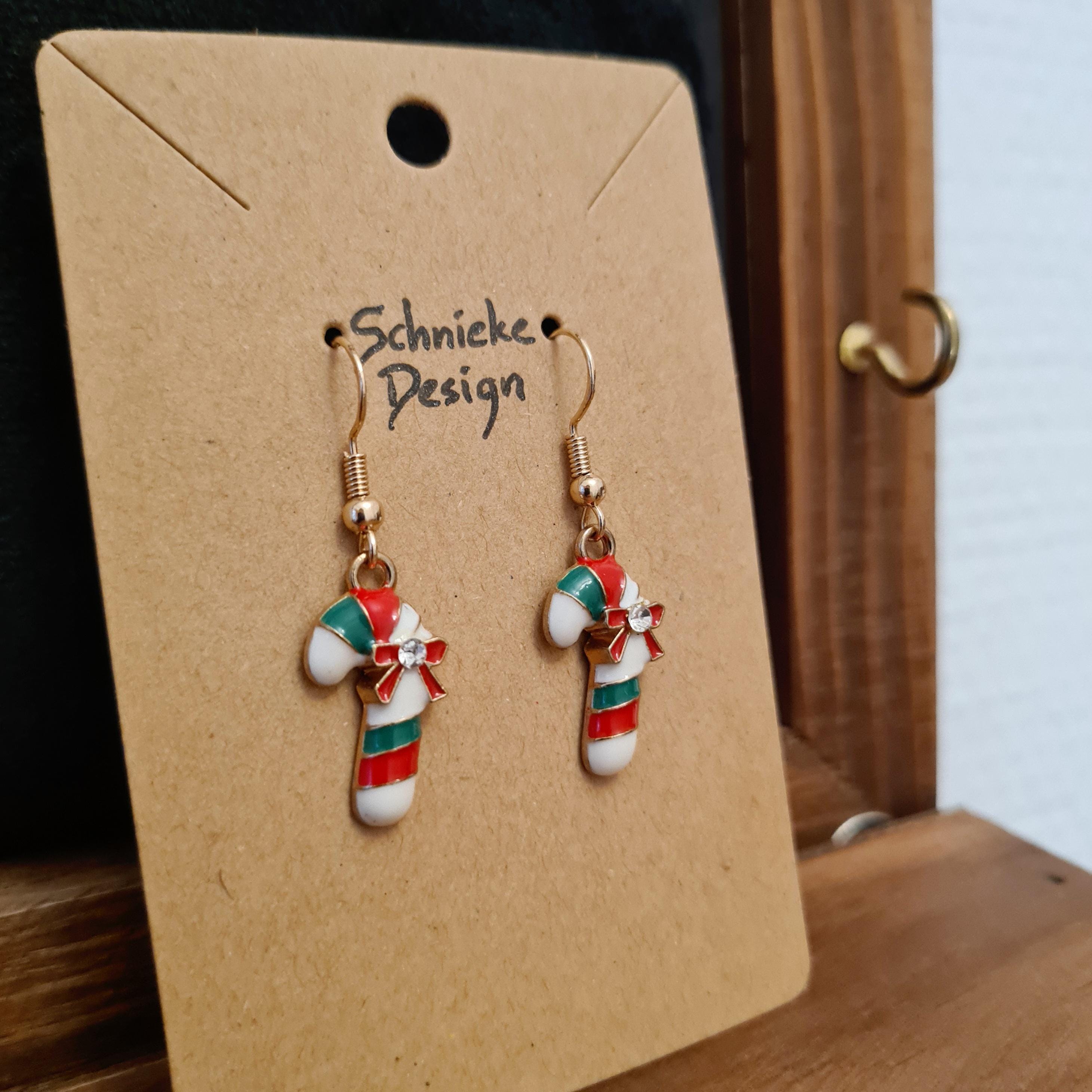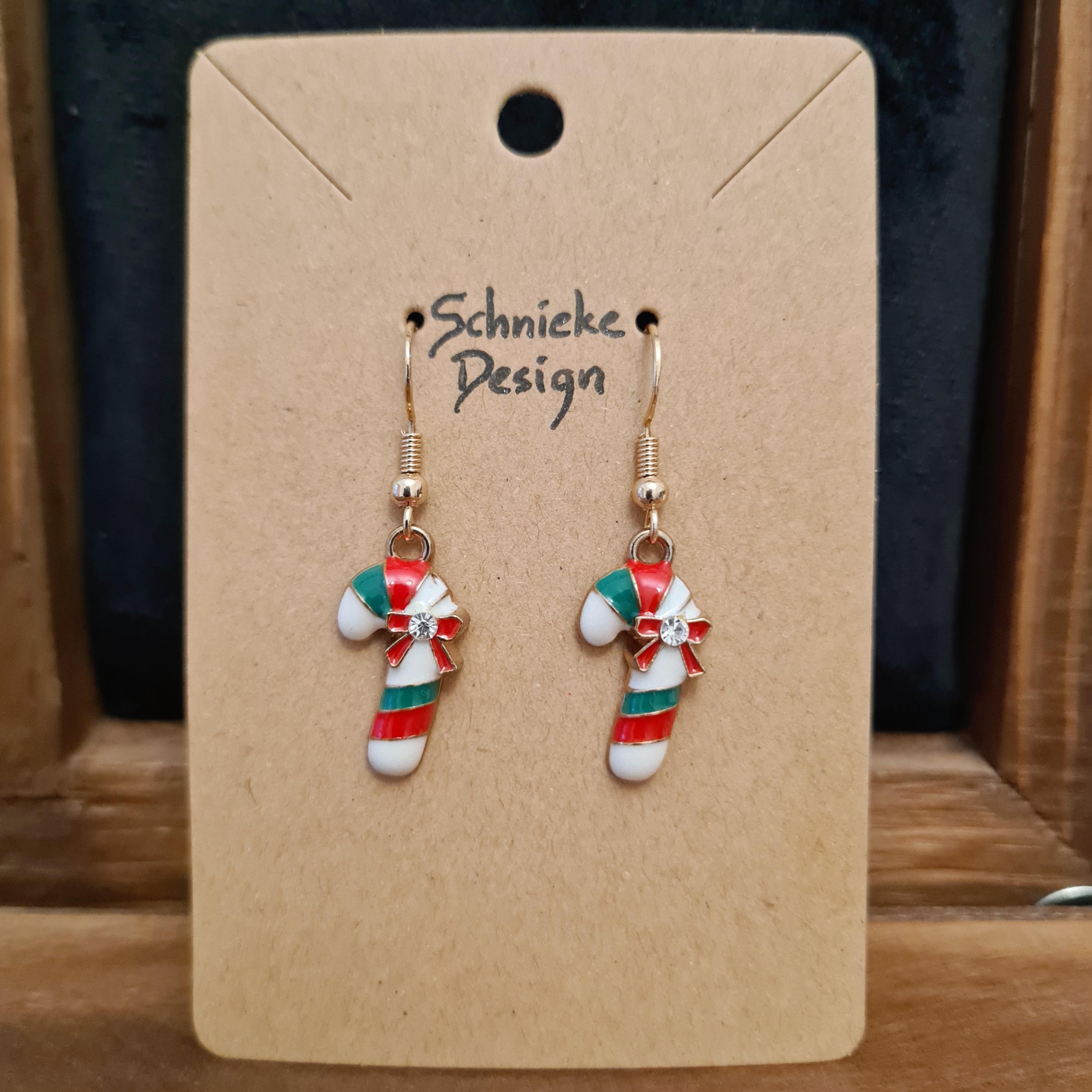 Earrings with small, cute candy canes, a bow, and glitter stones.