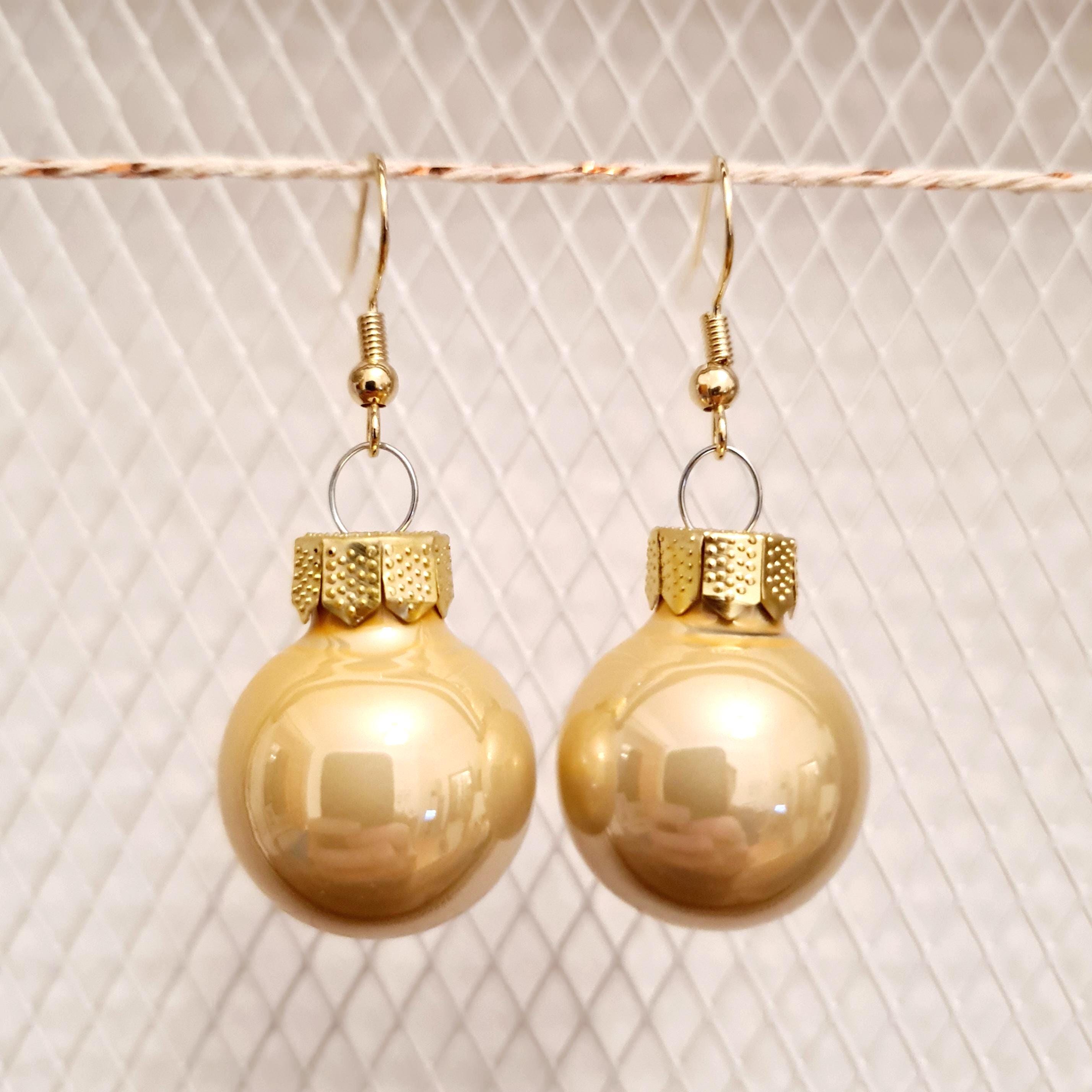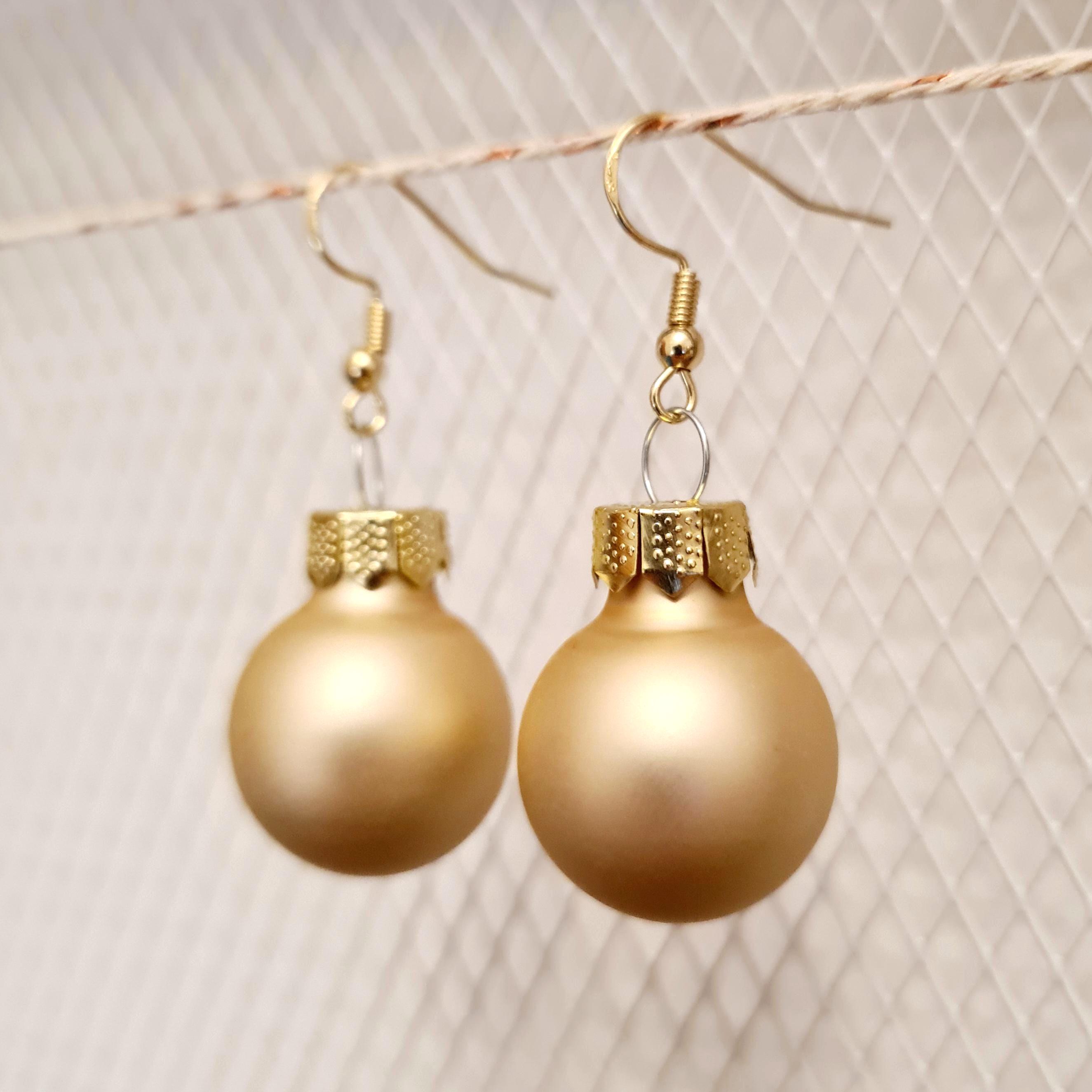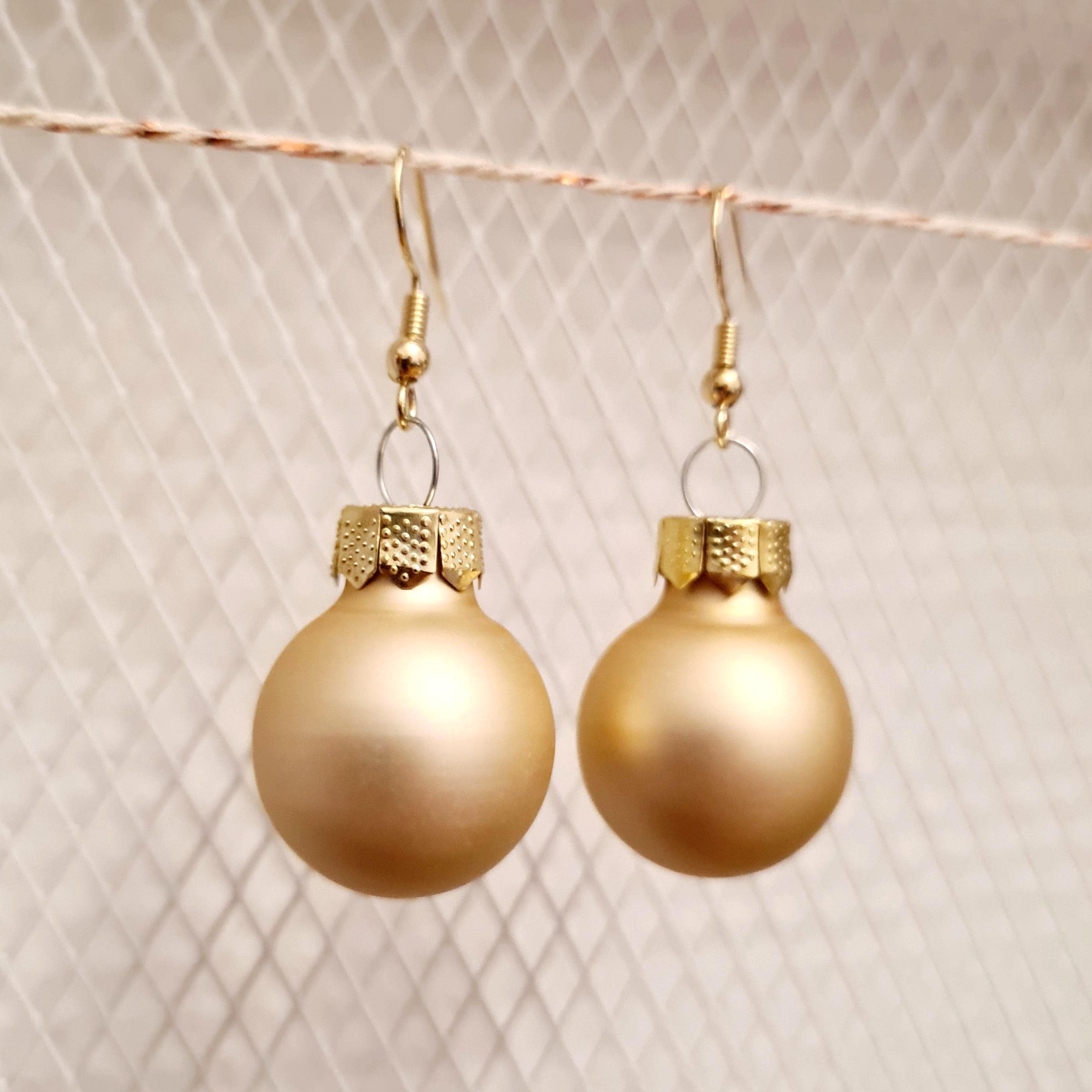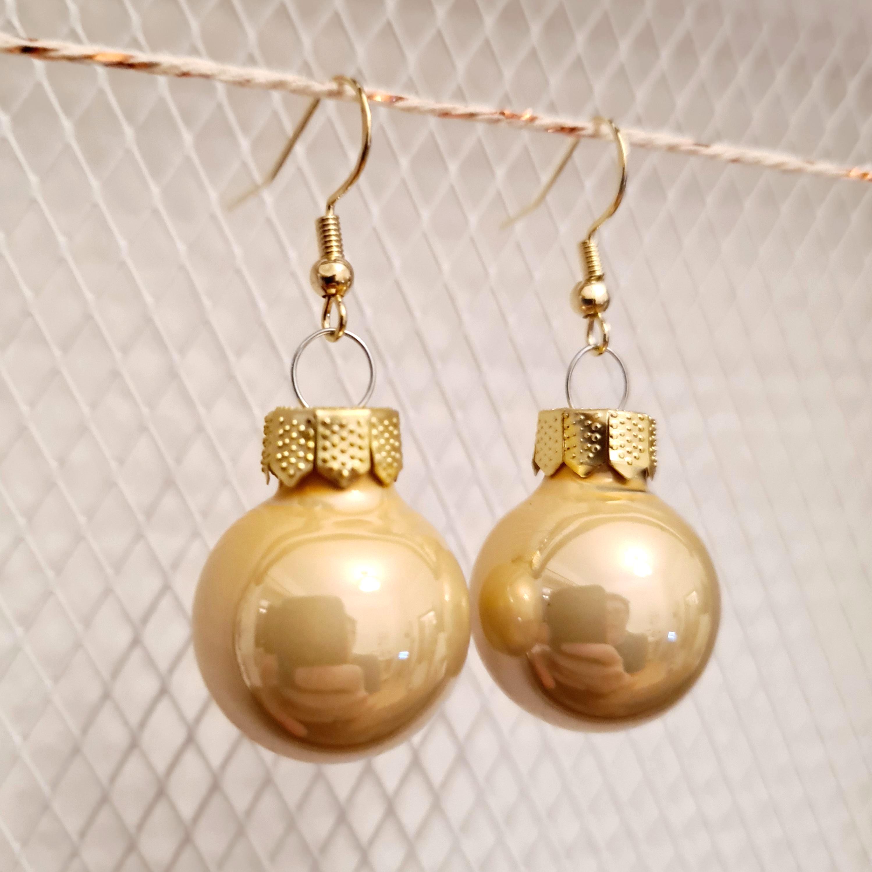 Christmas earrings with champagne-colored Christmas tree baubles in matte or glossy finishes.