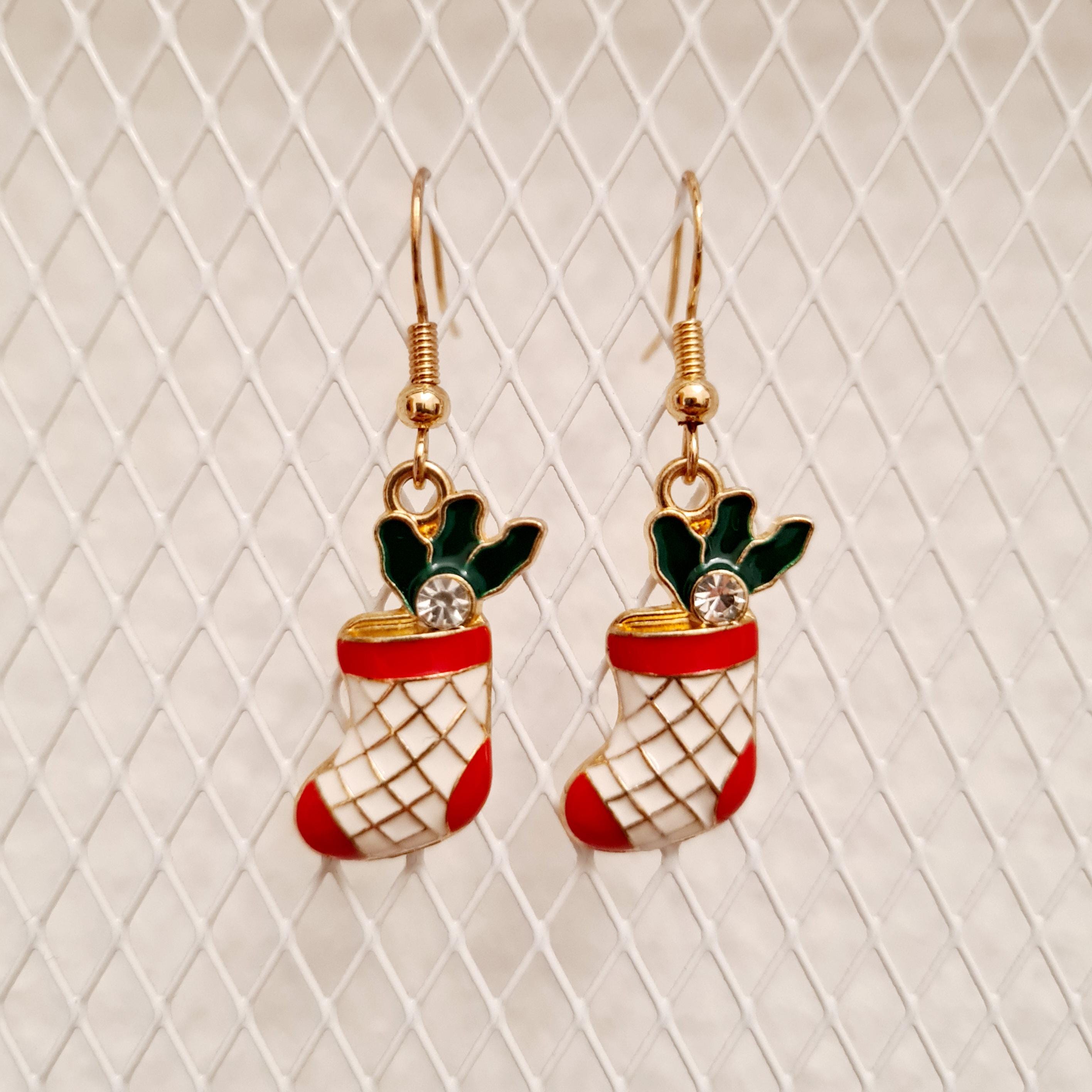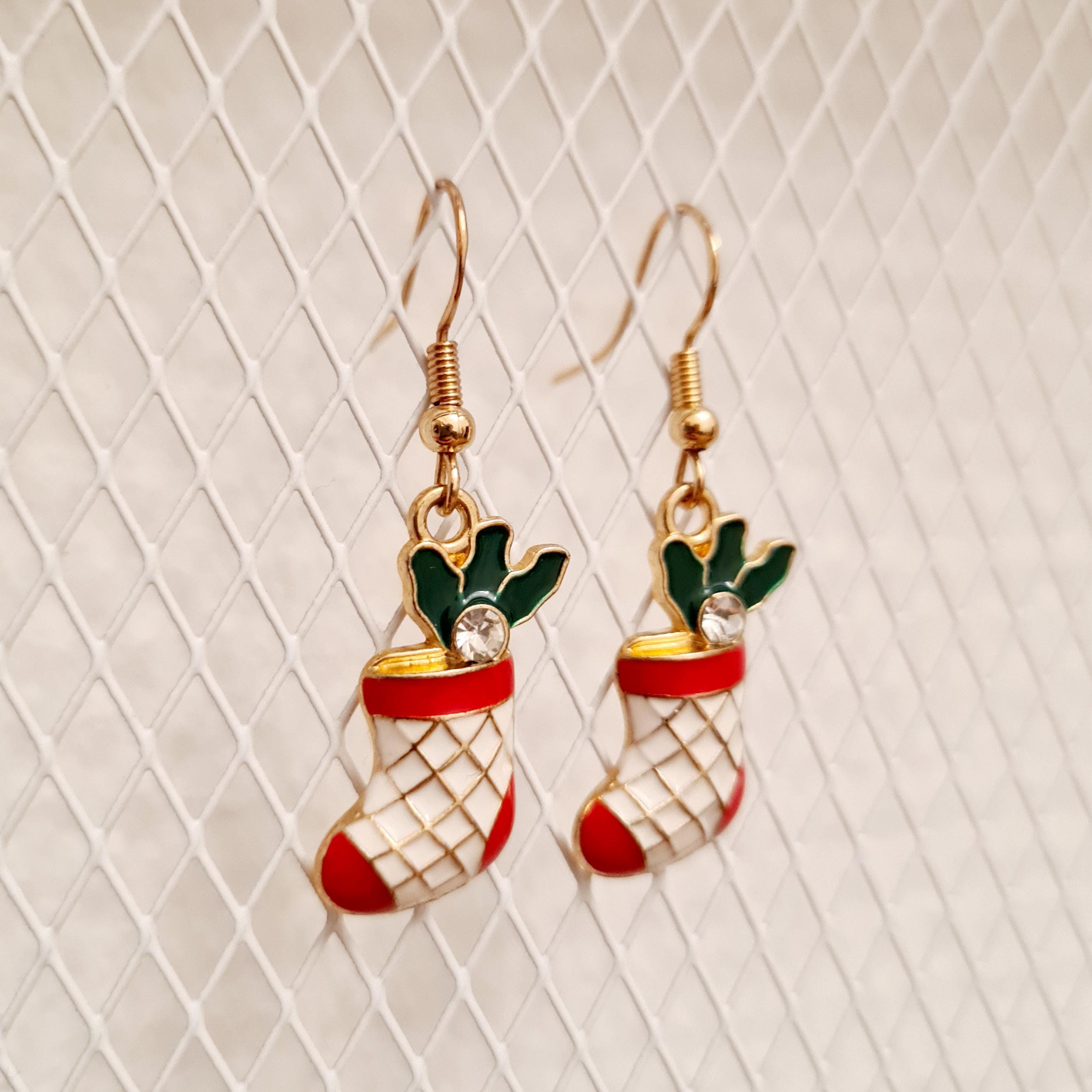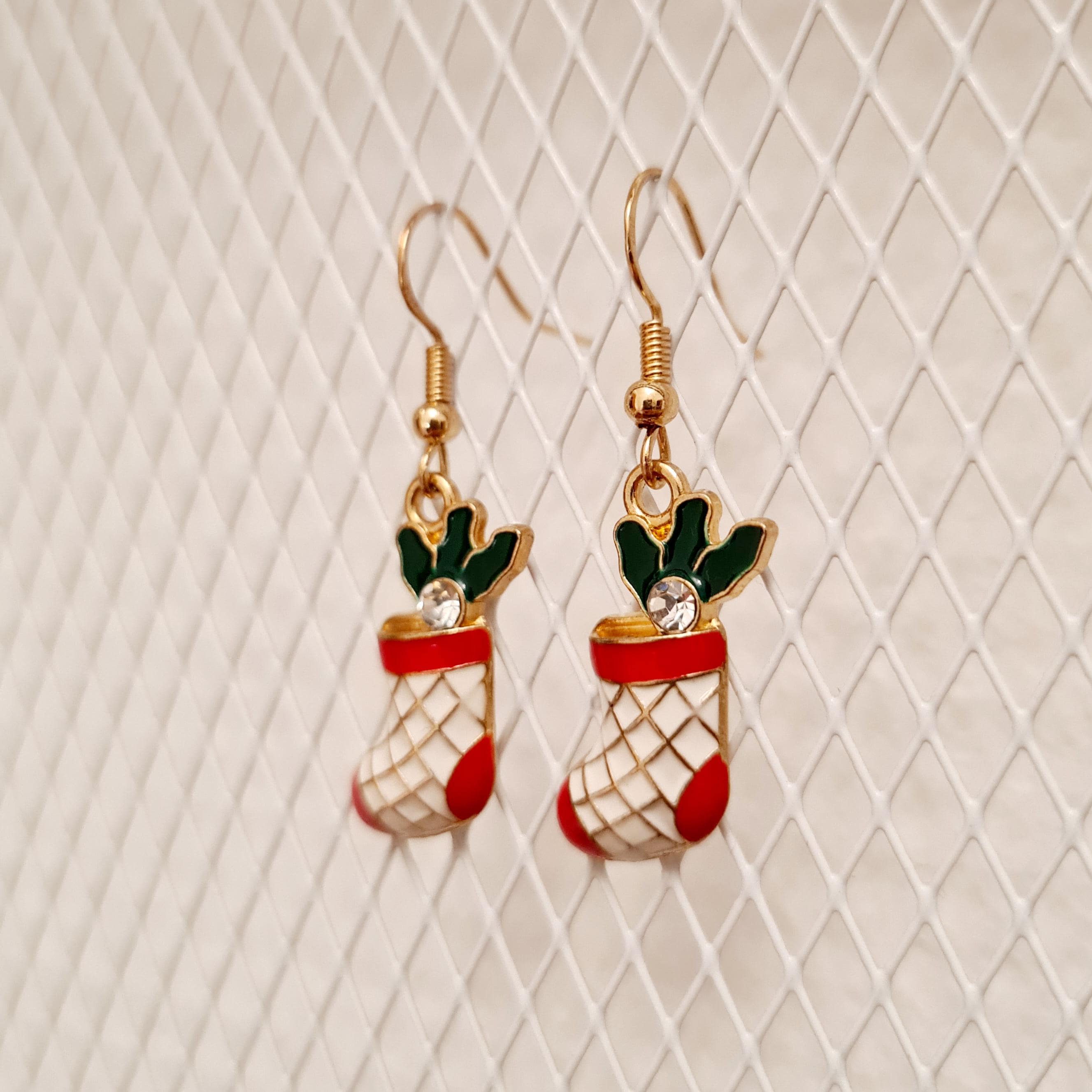 Earrings with festively decorated Christmas stockings and glittering holly berries.