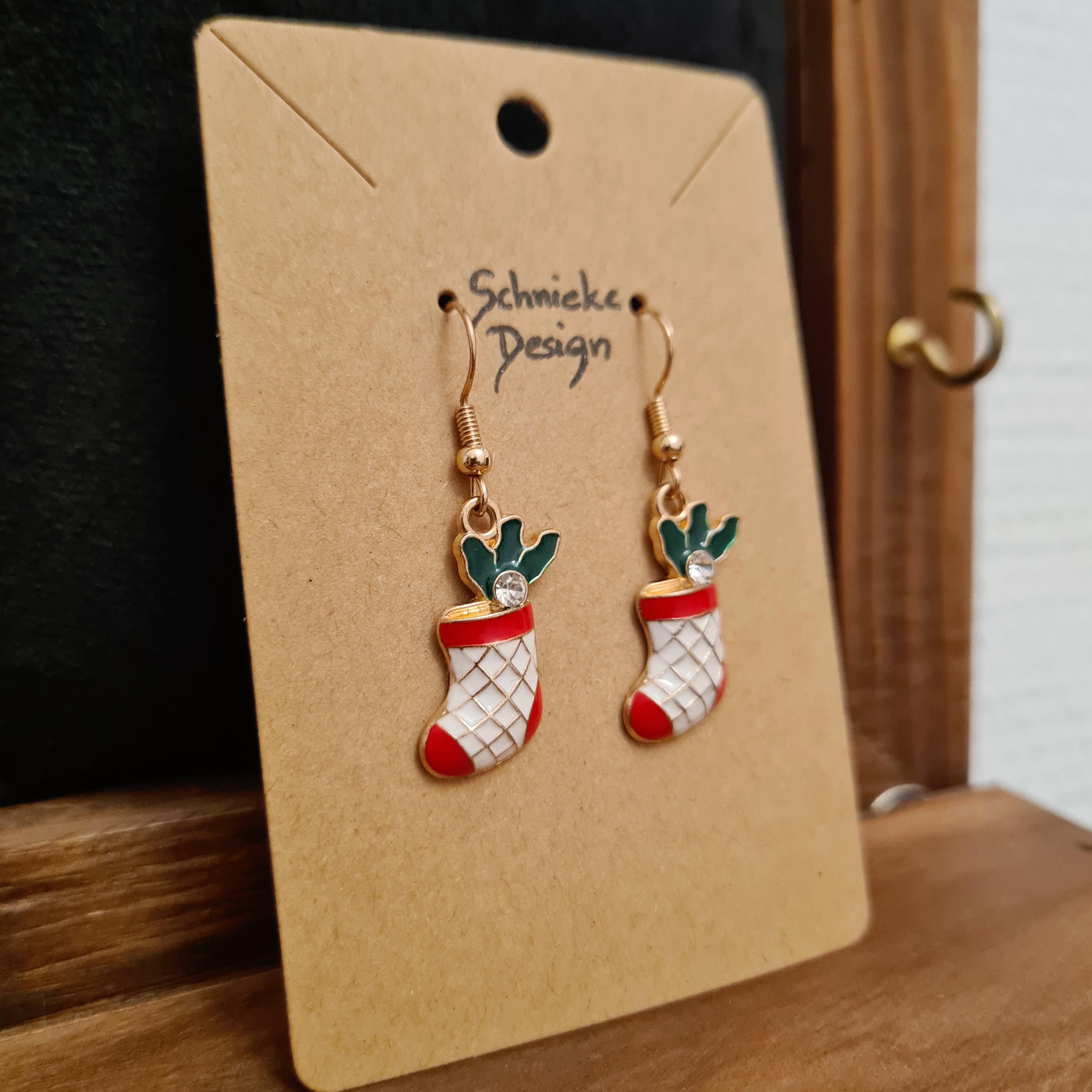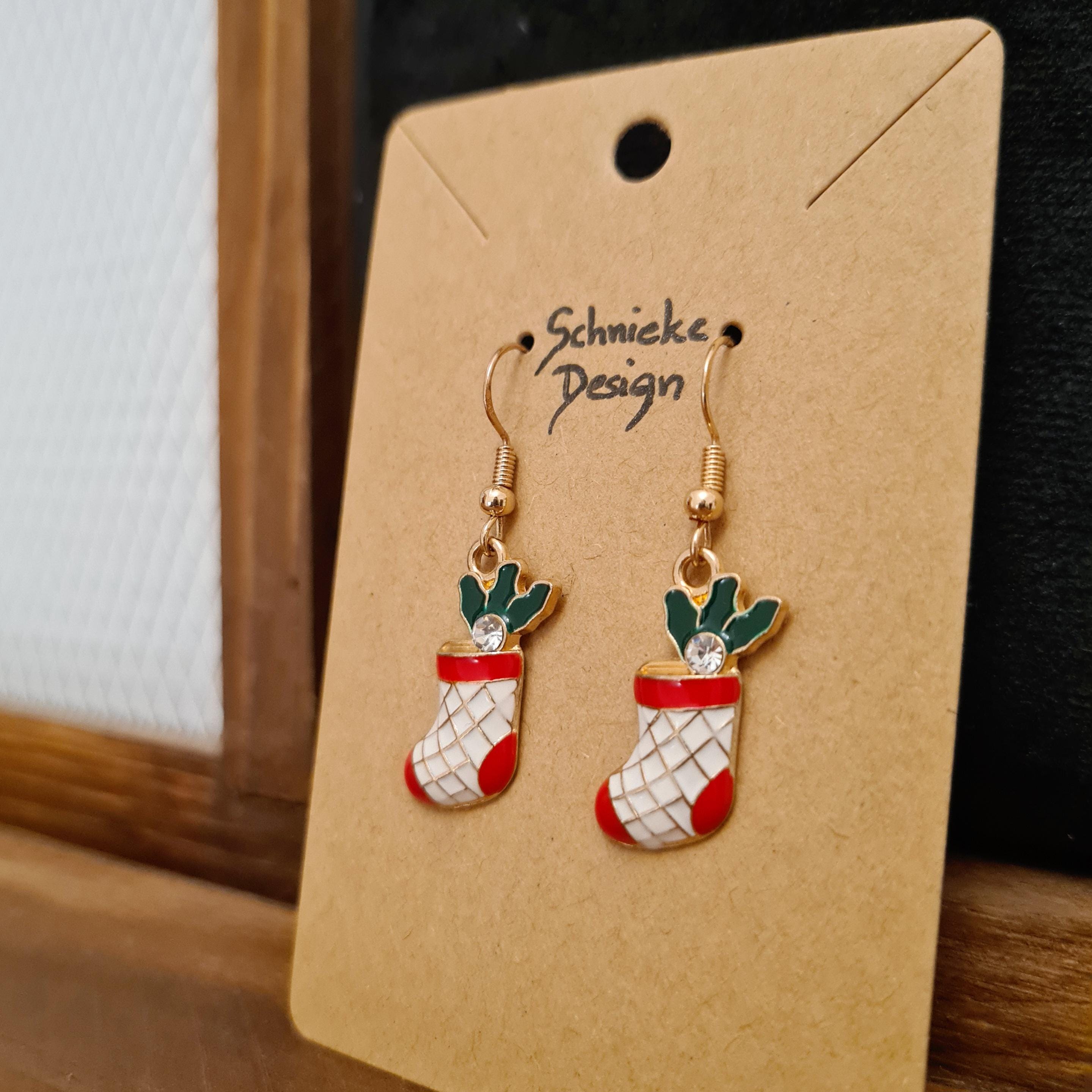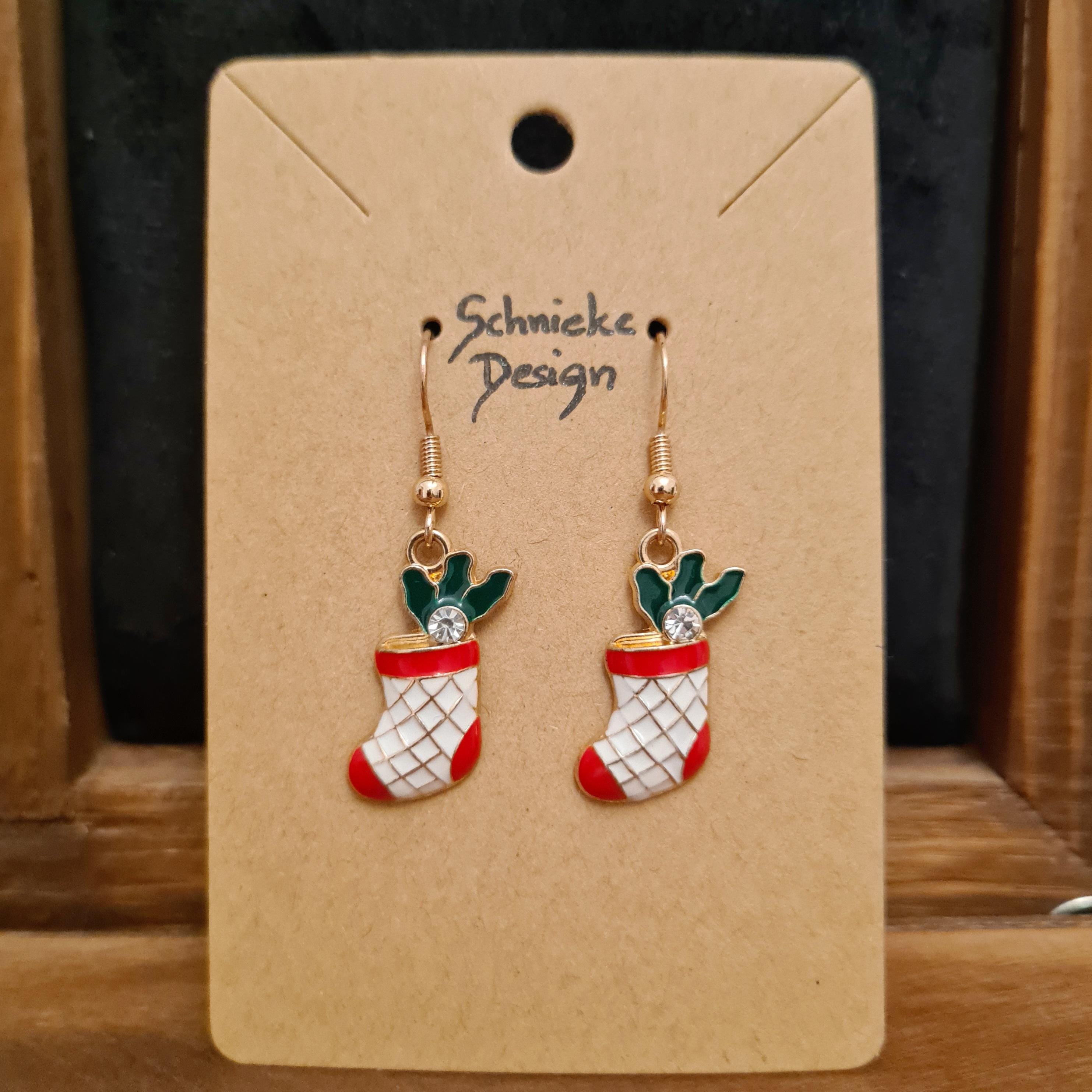 Earrings with festively decorated Christmas stockings and glittering holly berries.