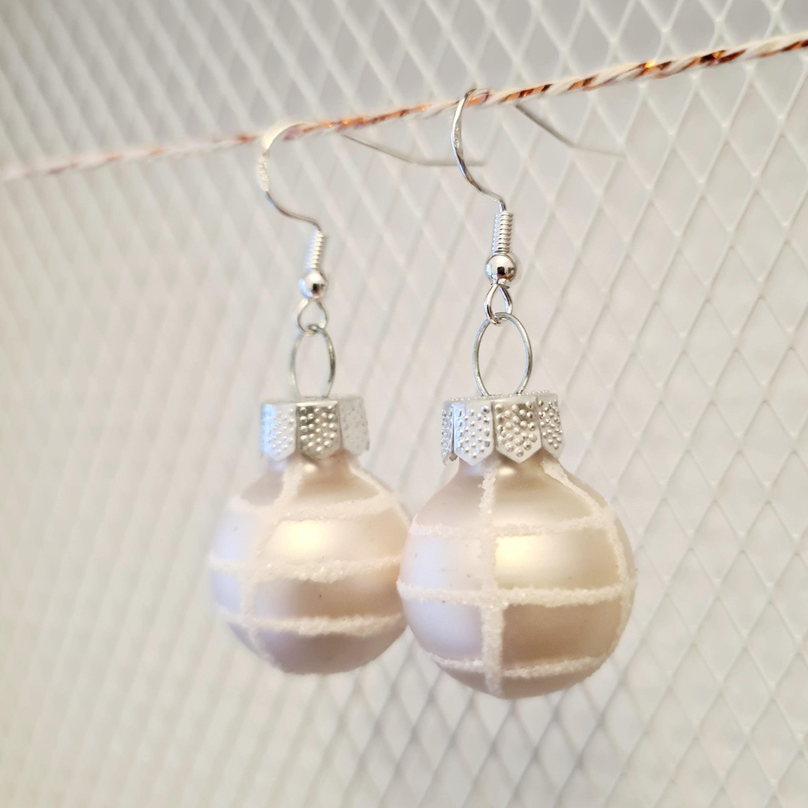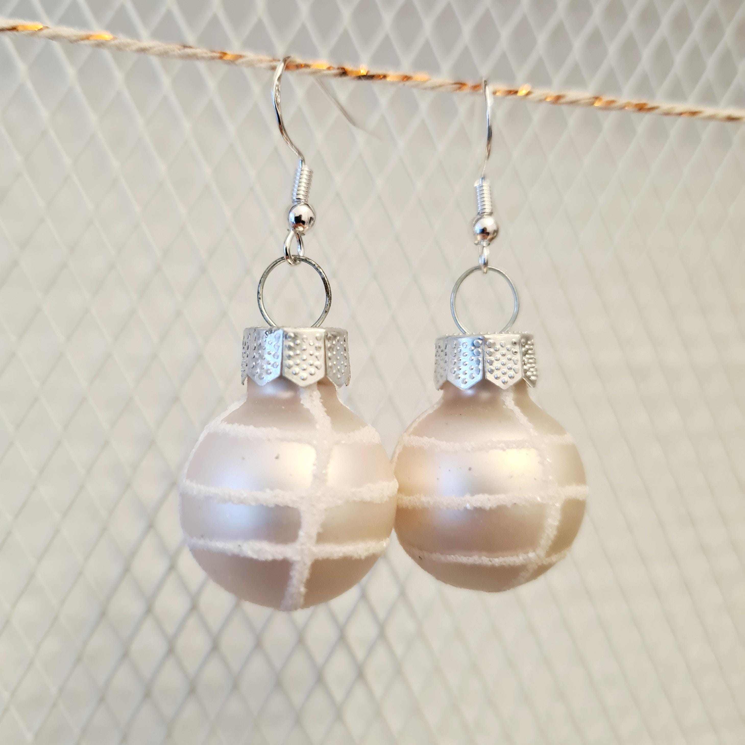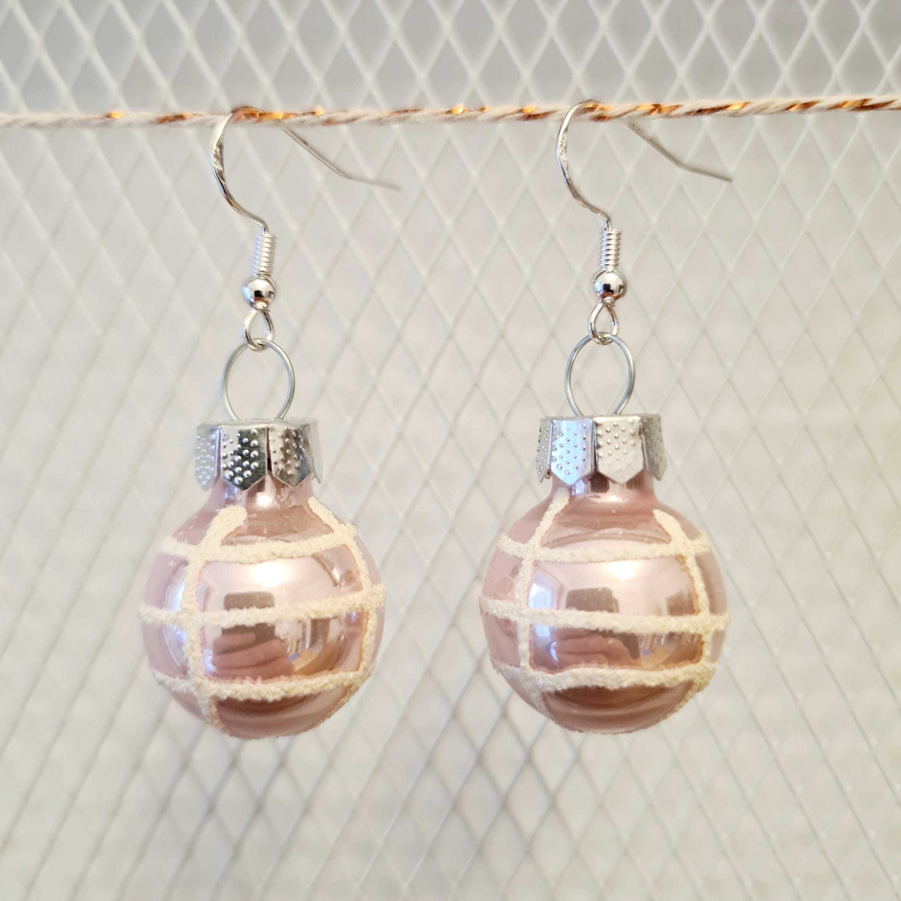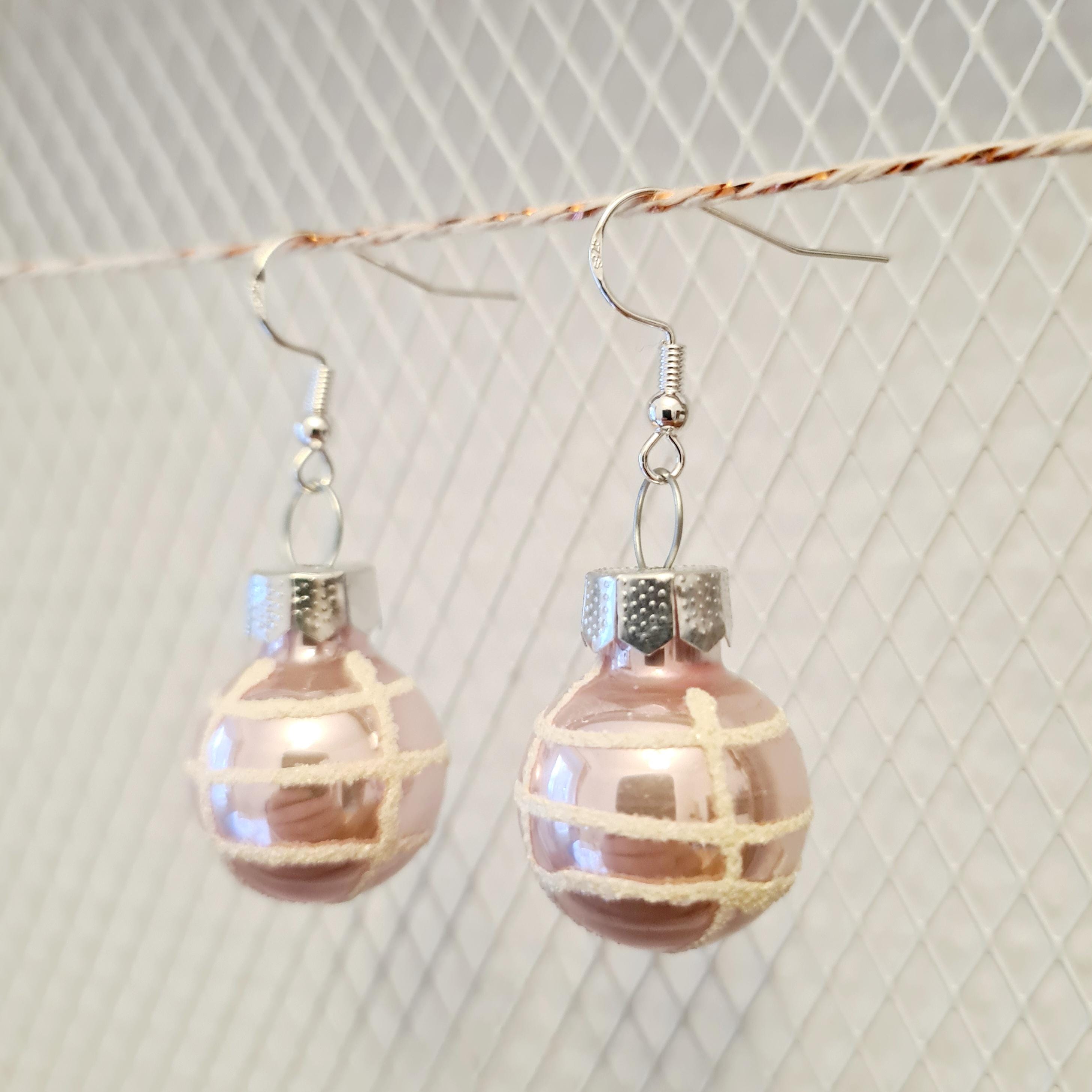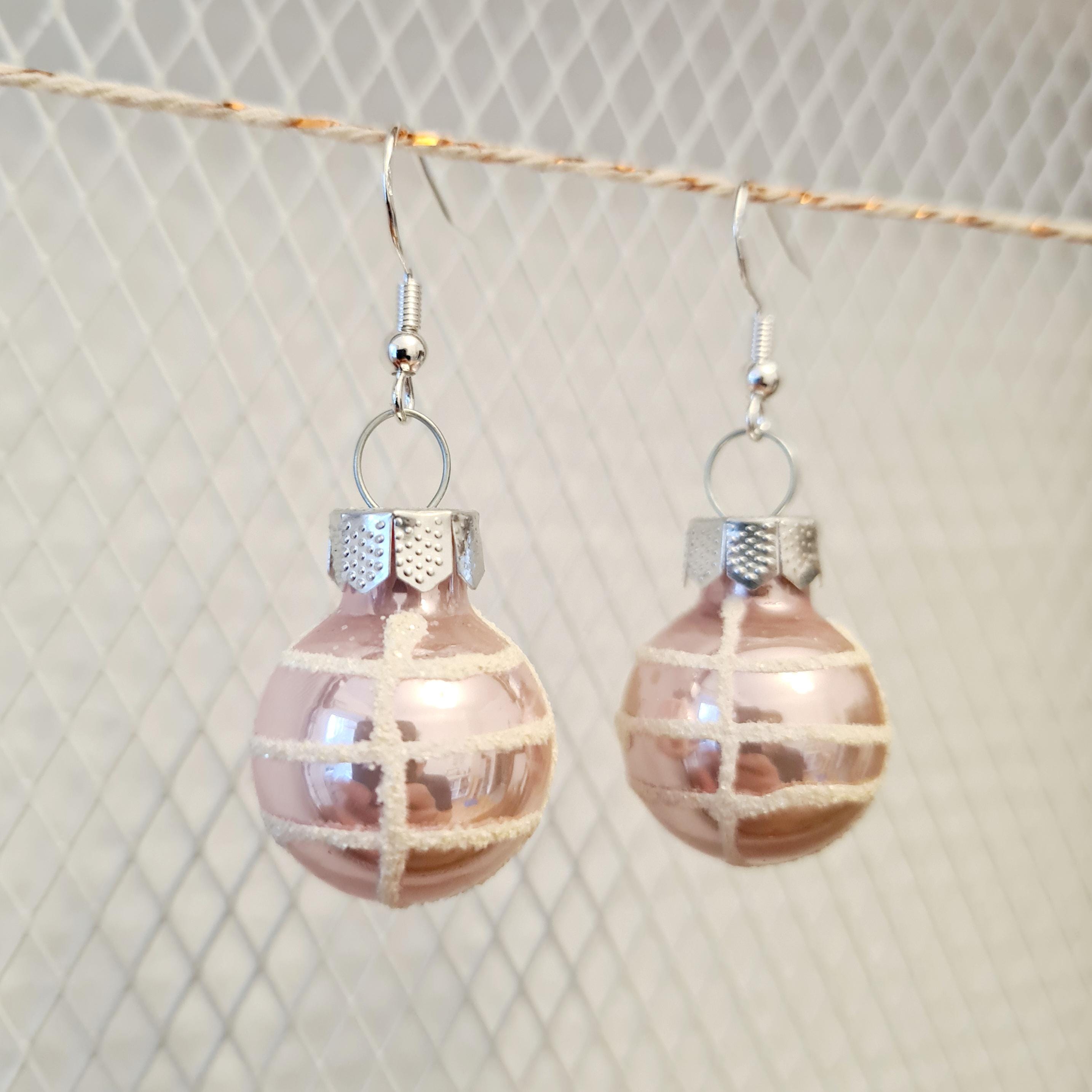 Christmas earrings with light pink Christmas baubles in matte and glossy finishes.