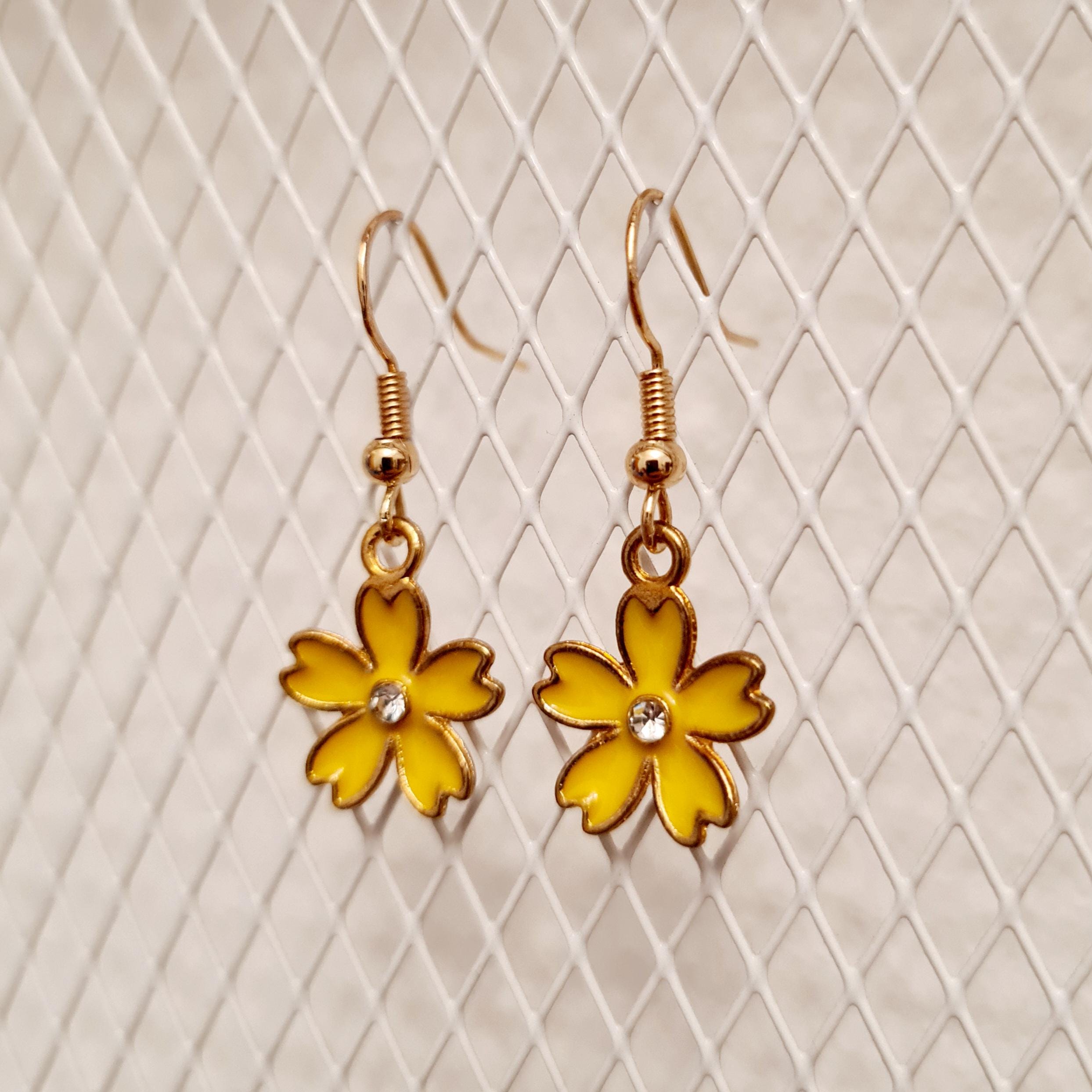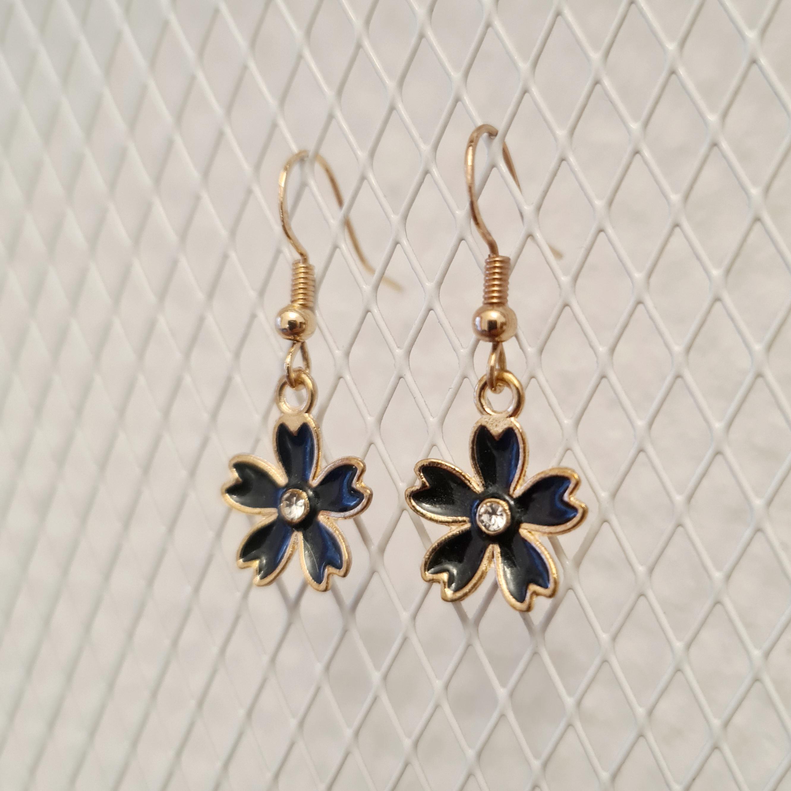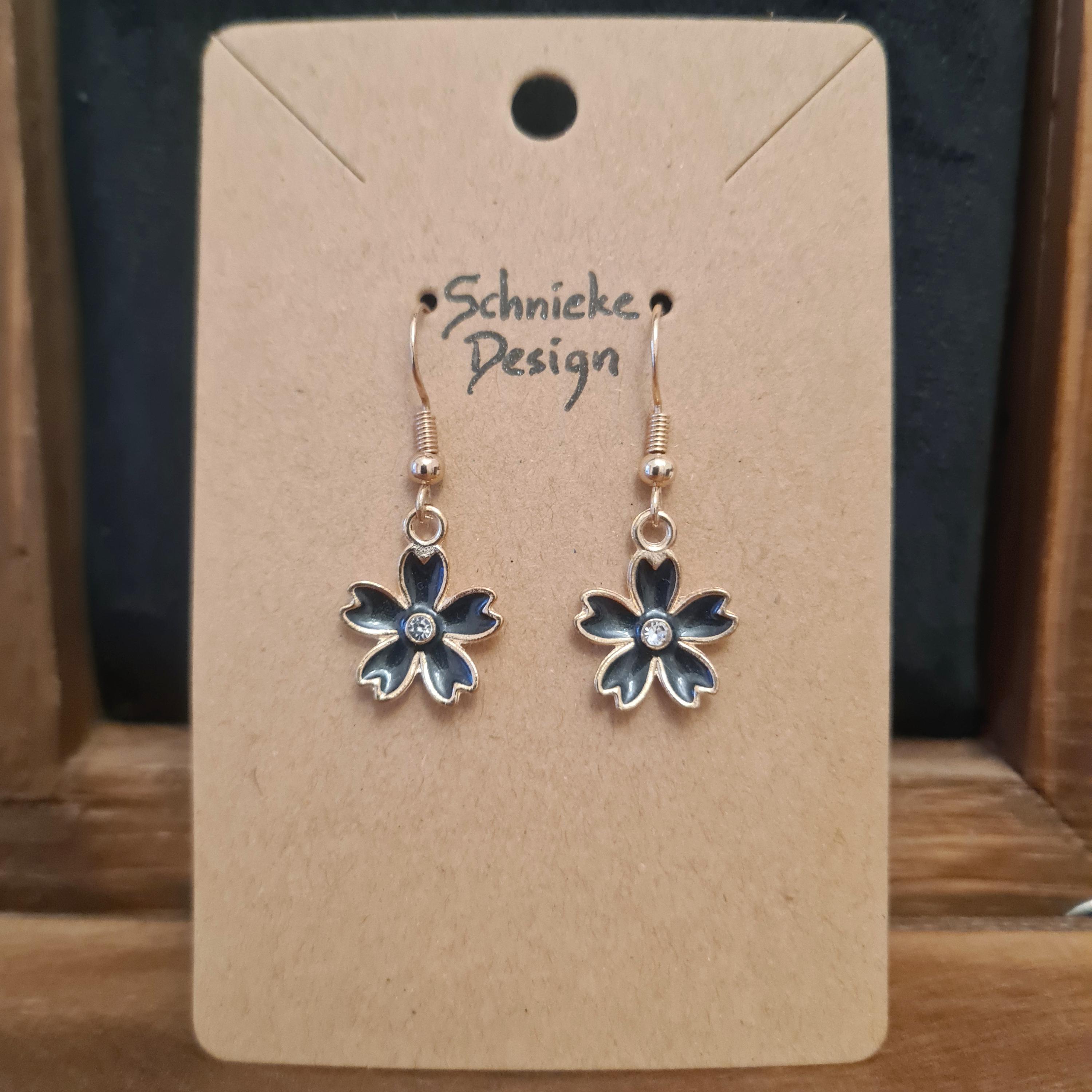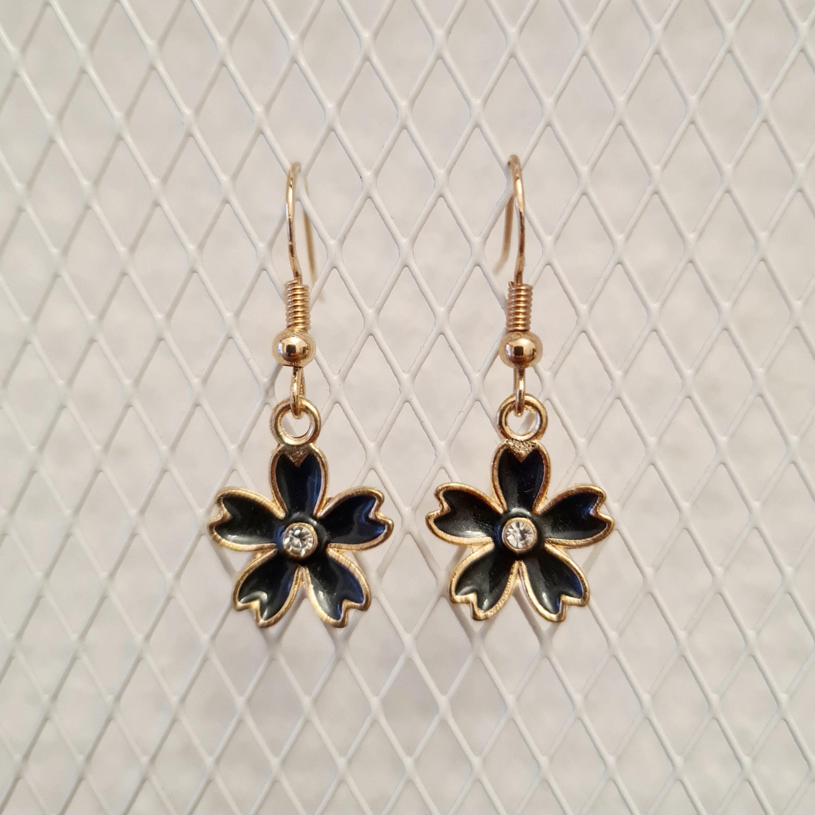Enamel and copper flower earrings with silver glitter stones in blue, yellow, pink or black.