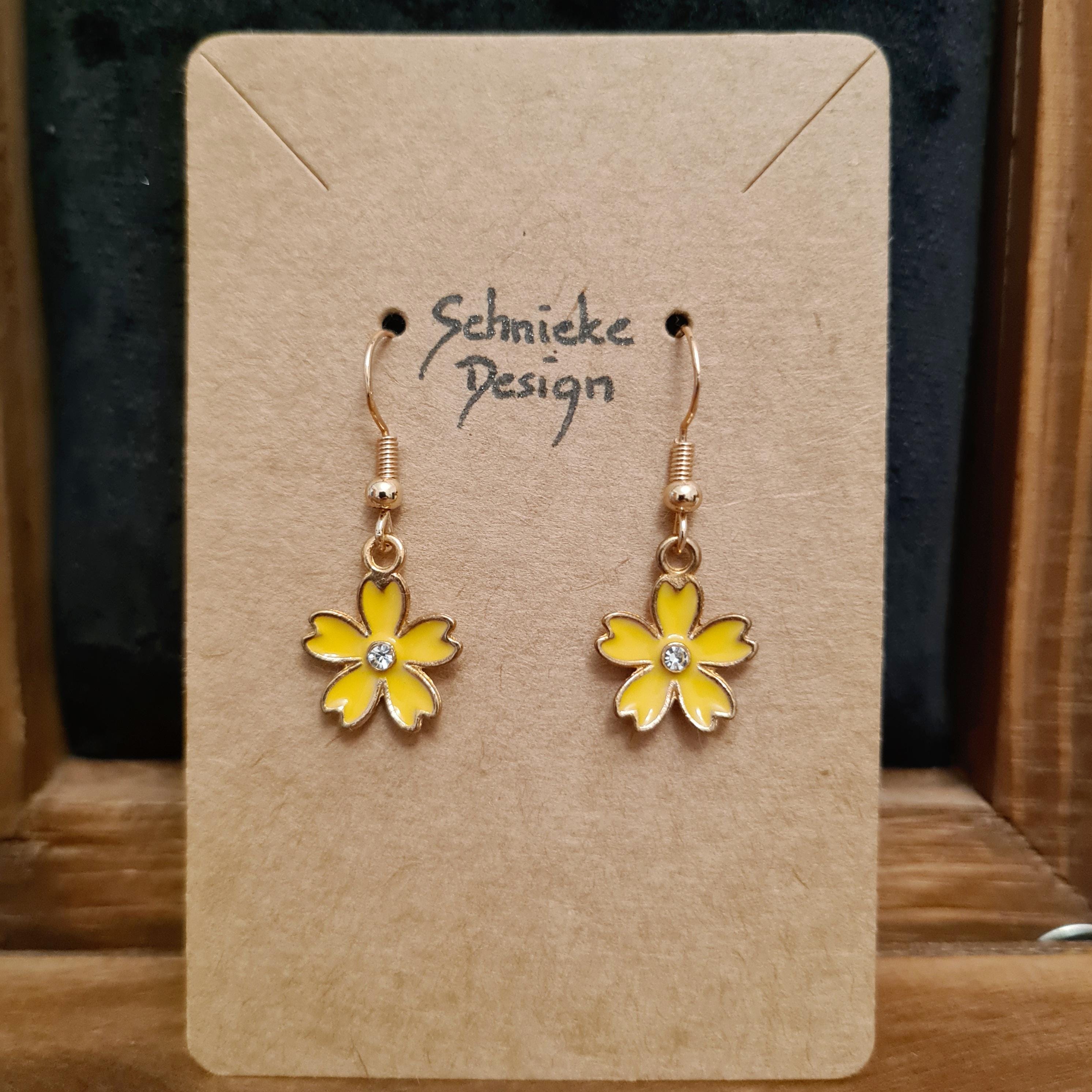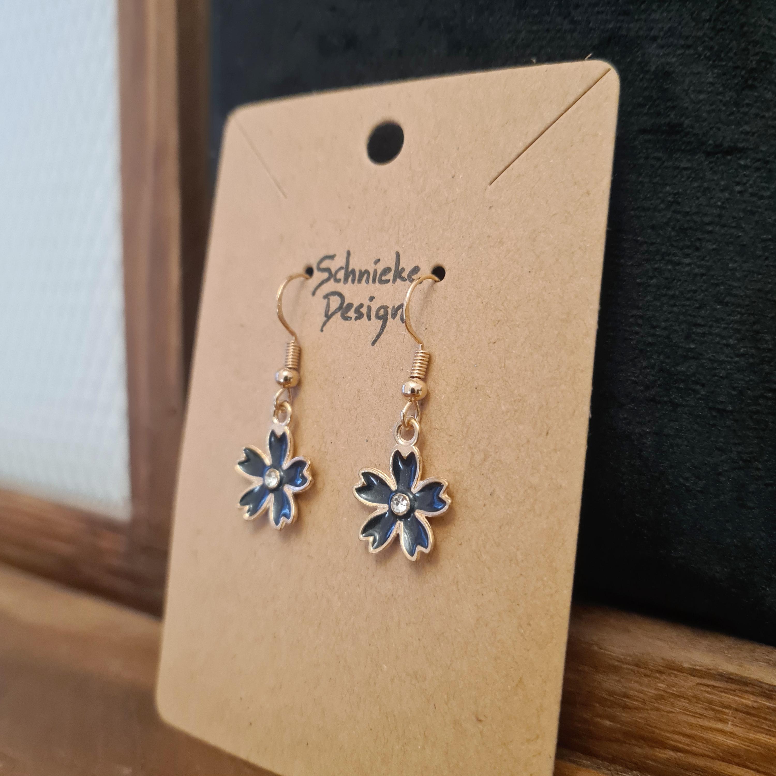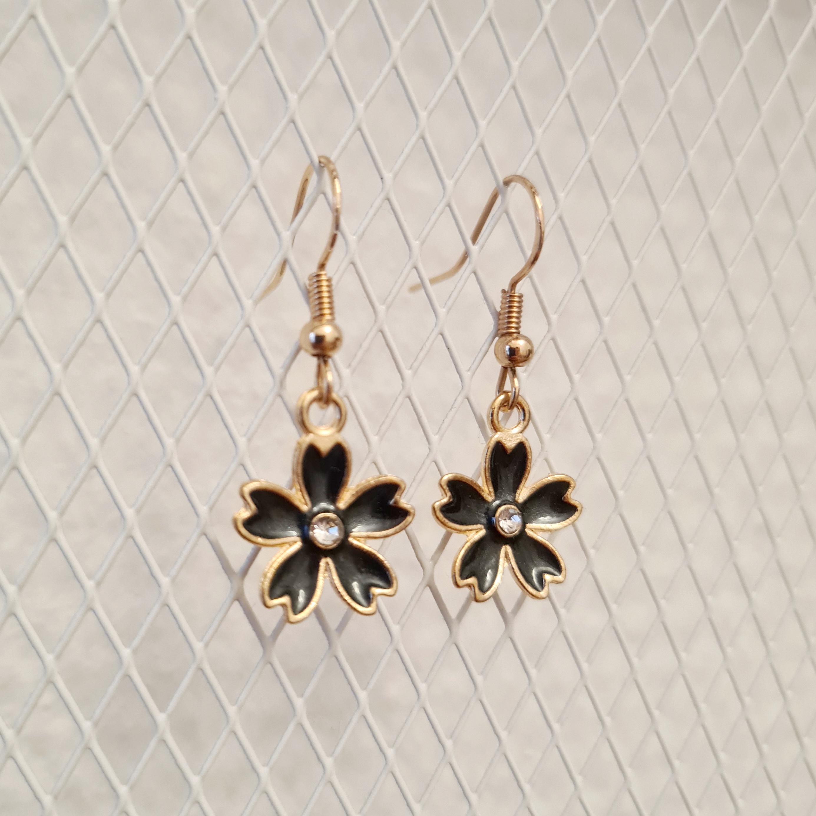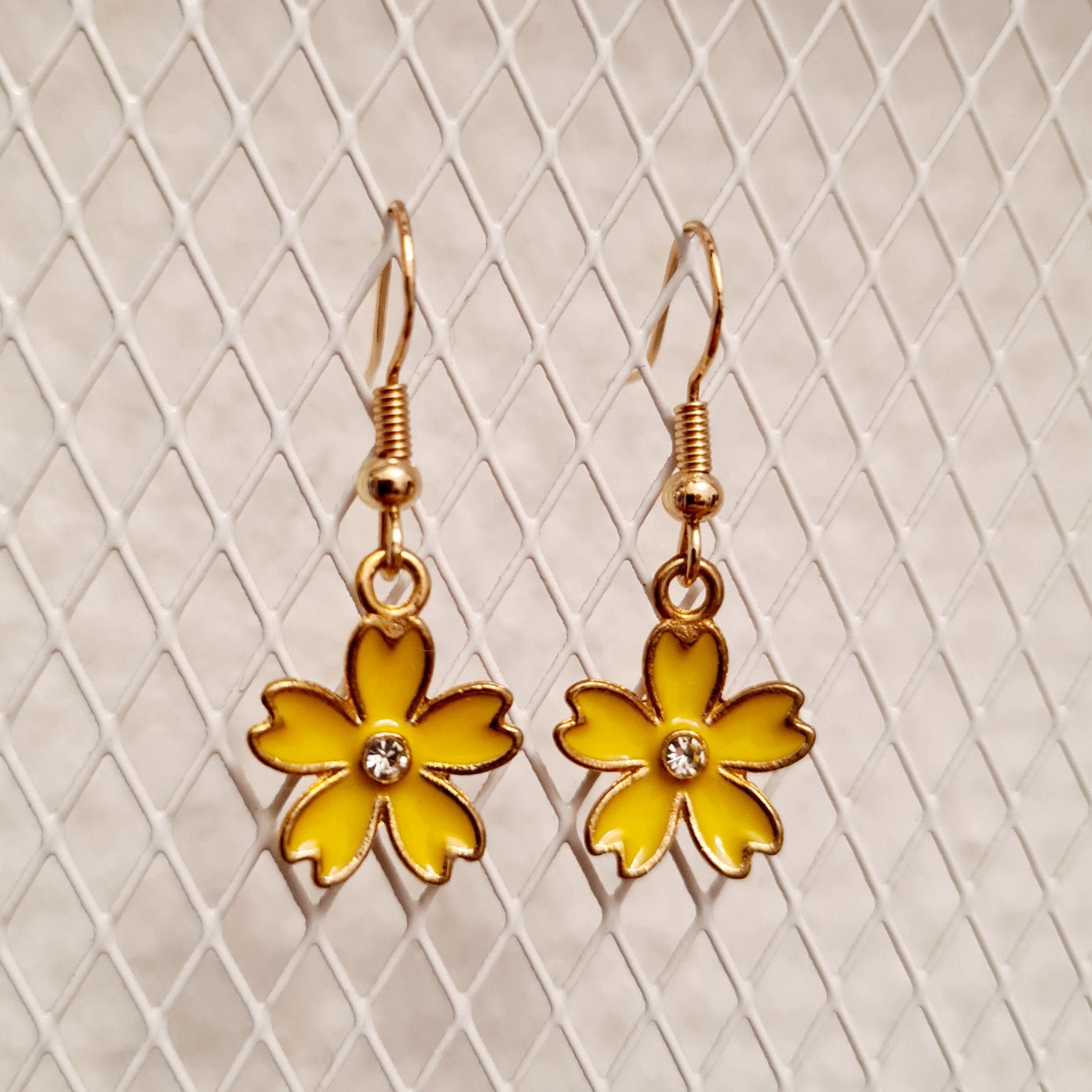 Enamel and copper flower earrings with silver glitter stones in blue, yellow, pink or black.