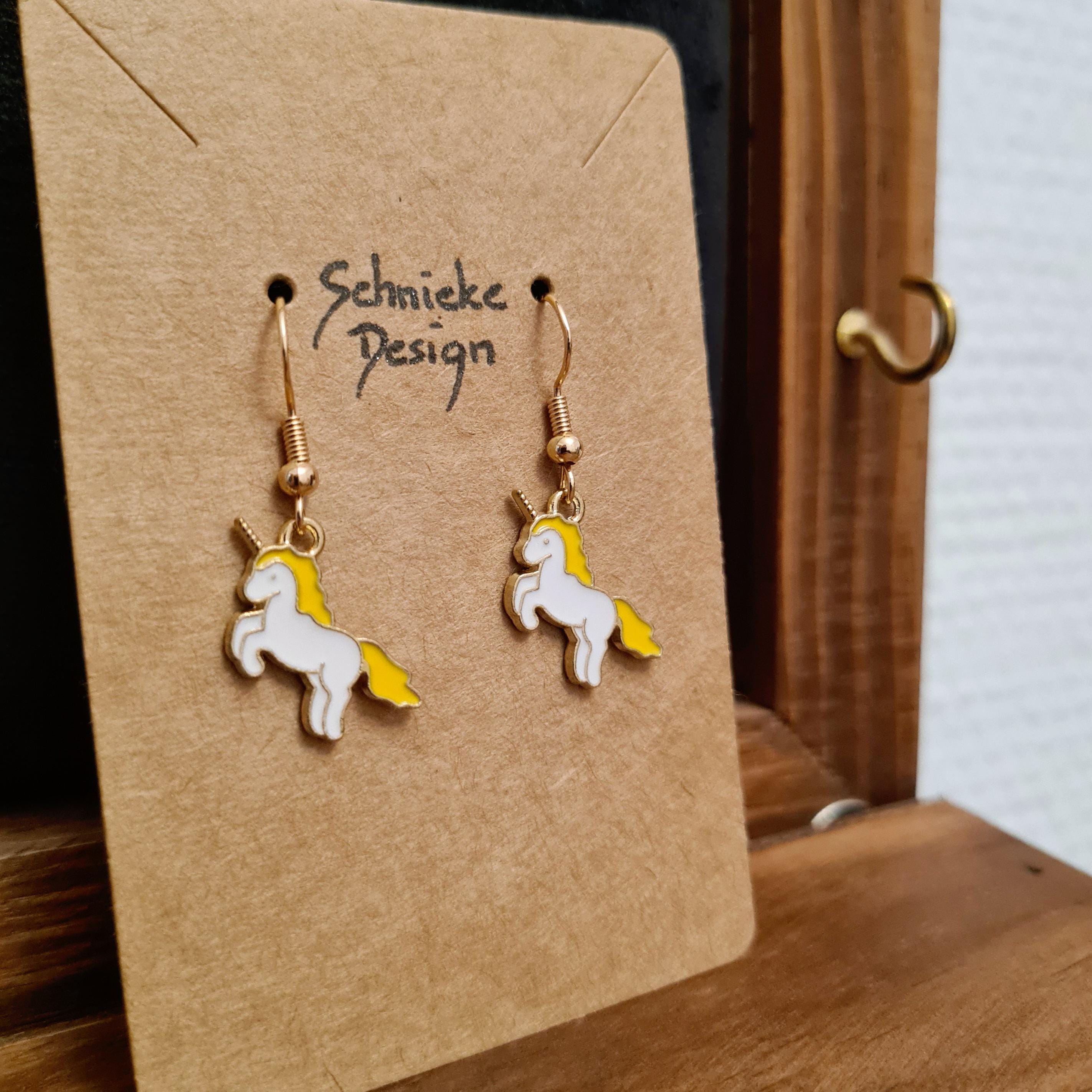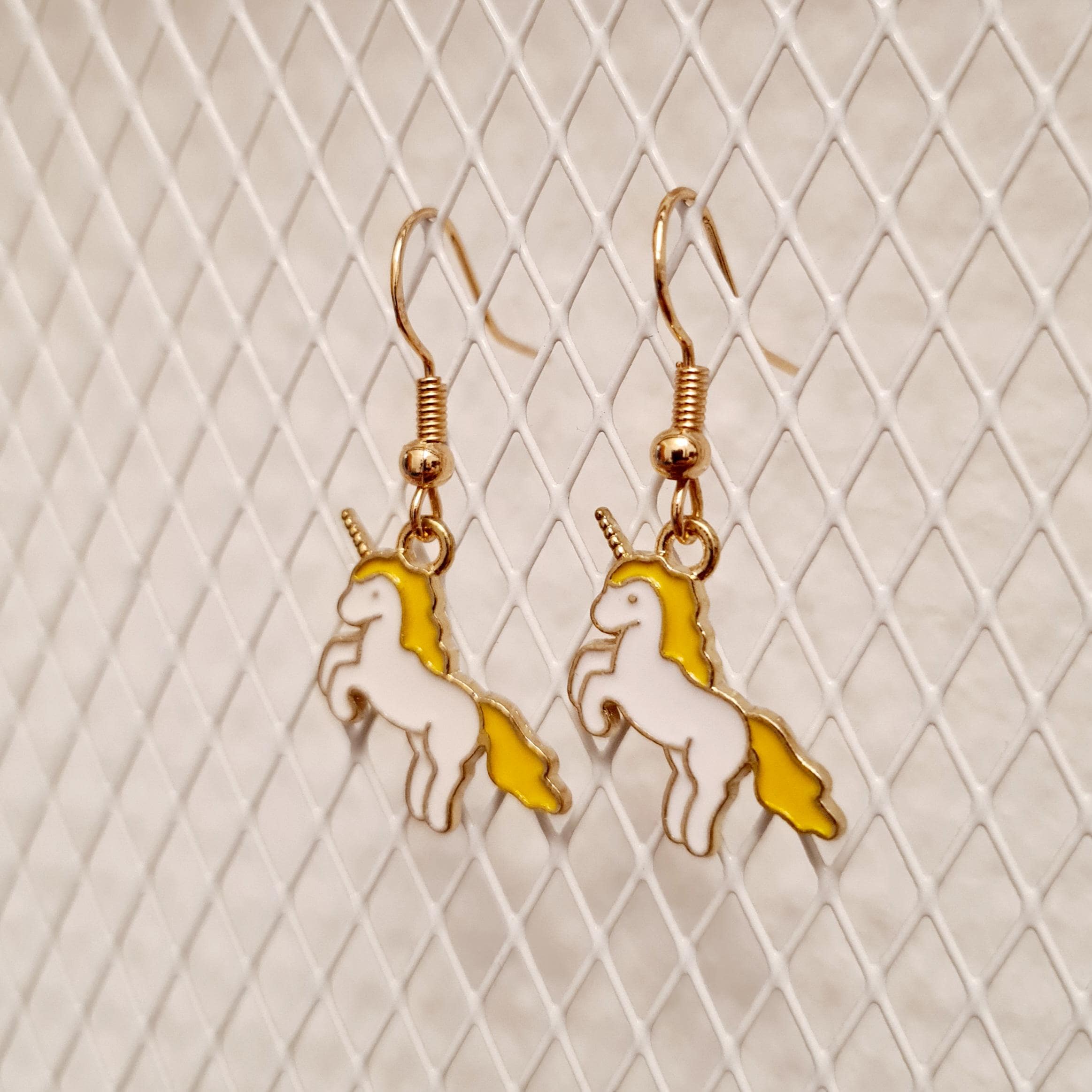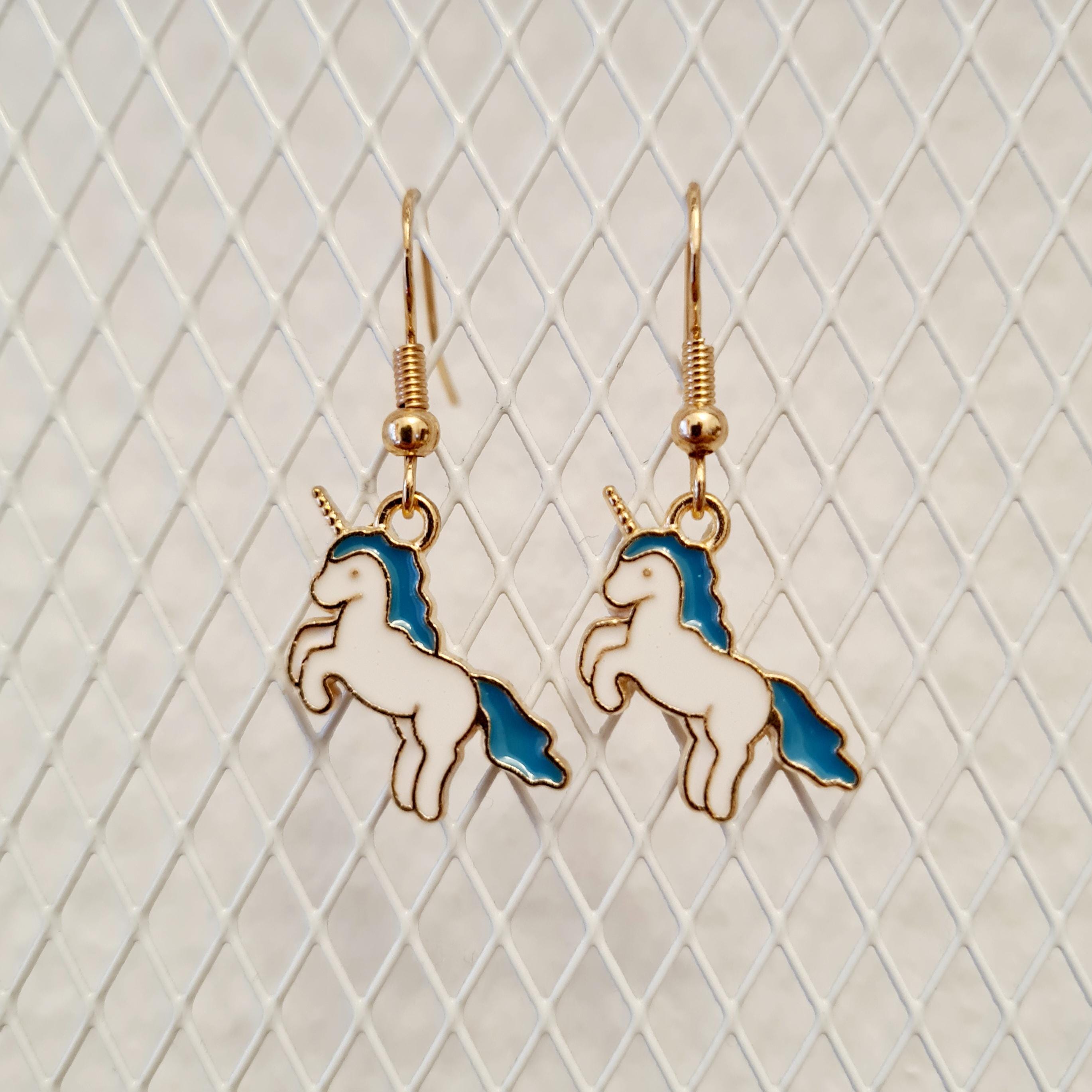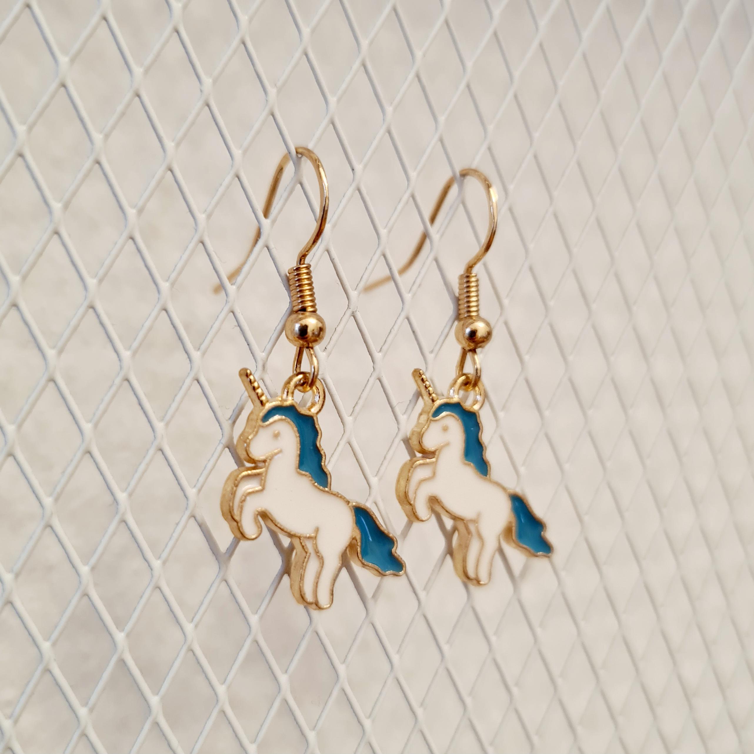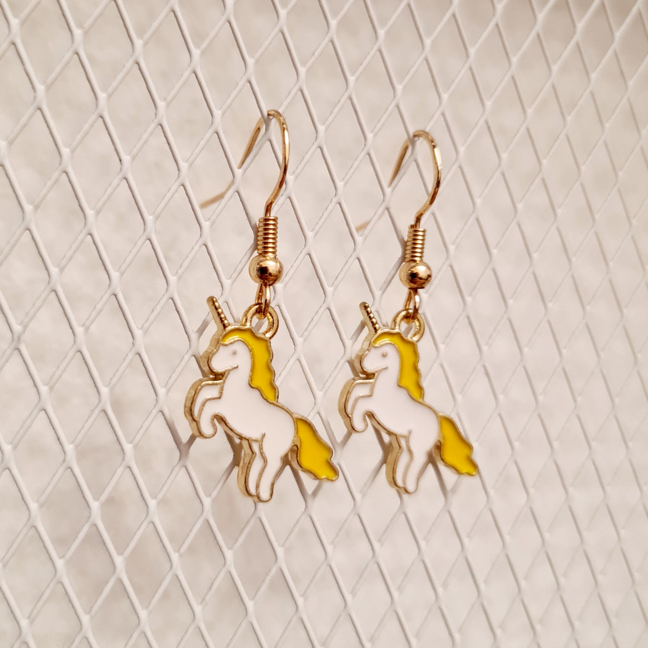 Magical unicorn earrings made of enamel and copper.