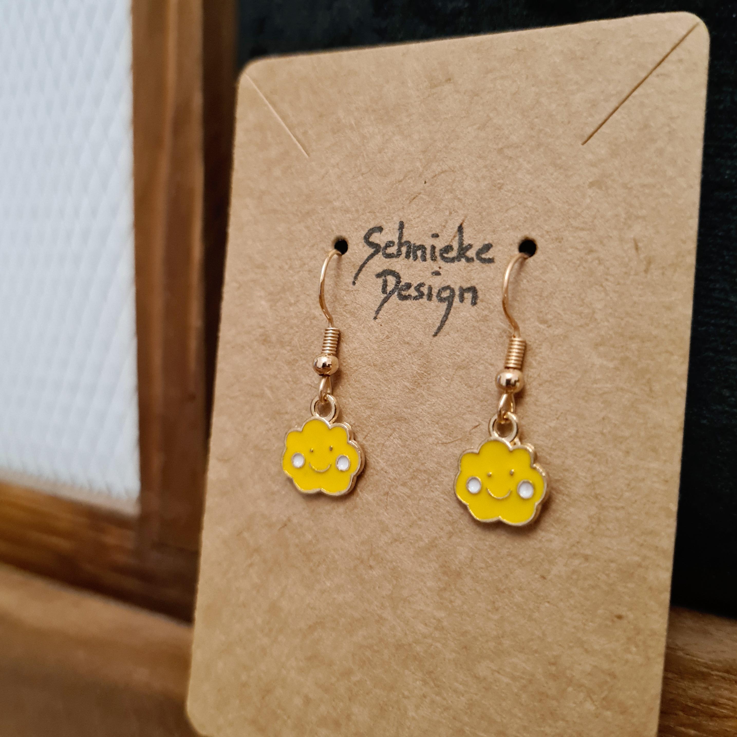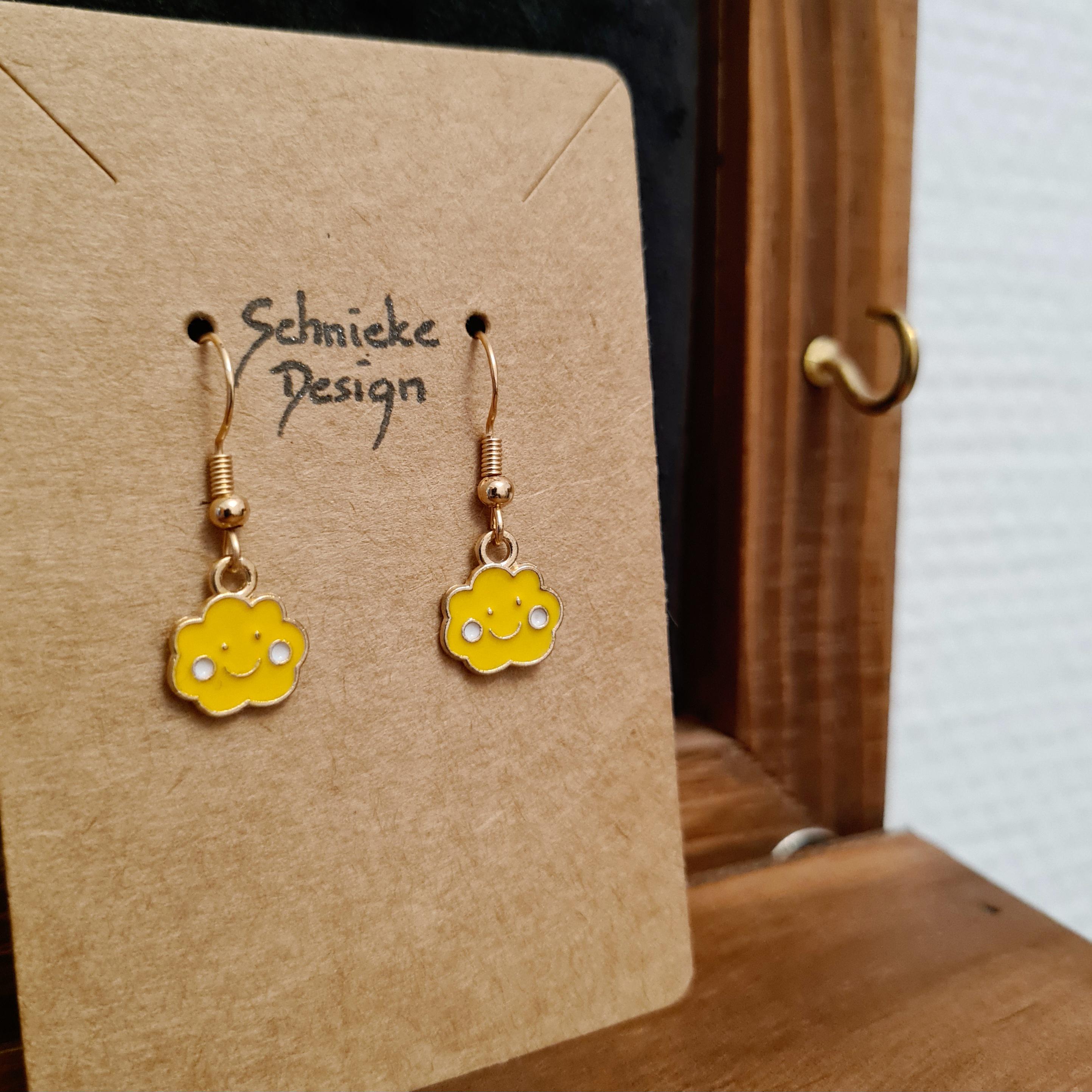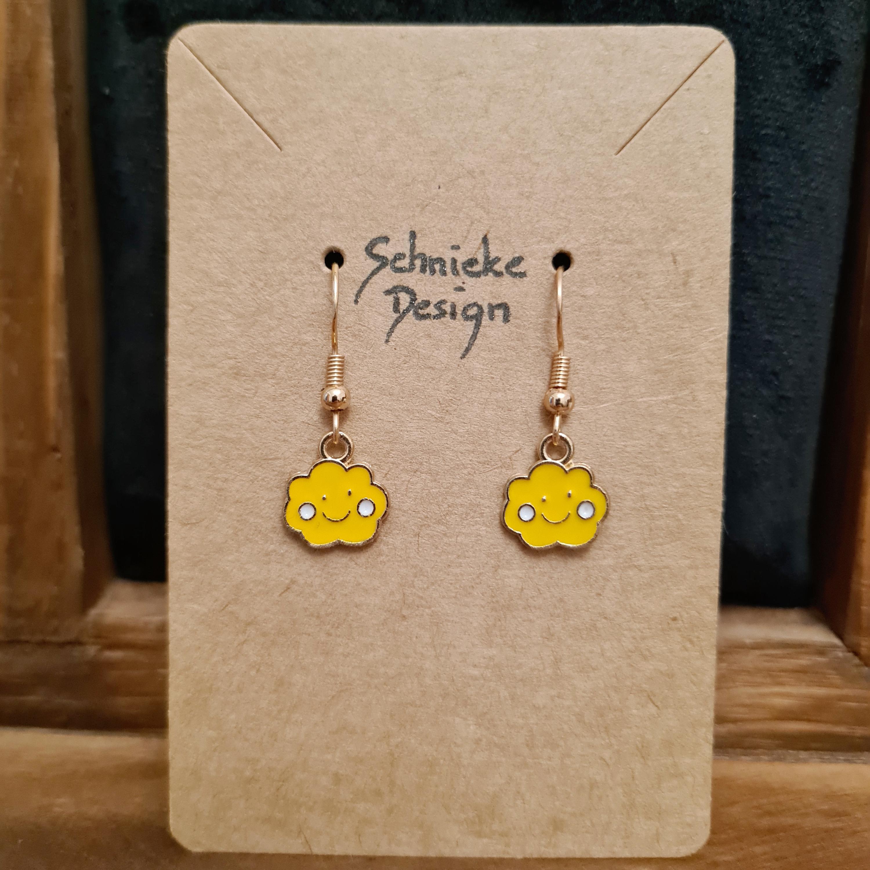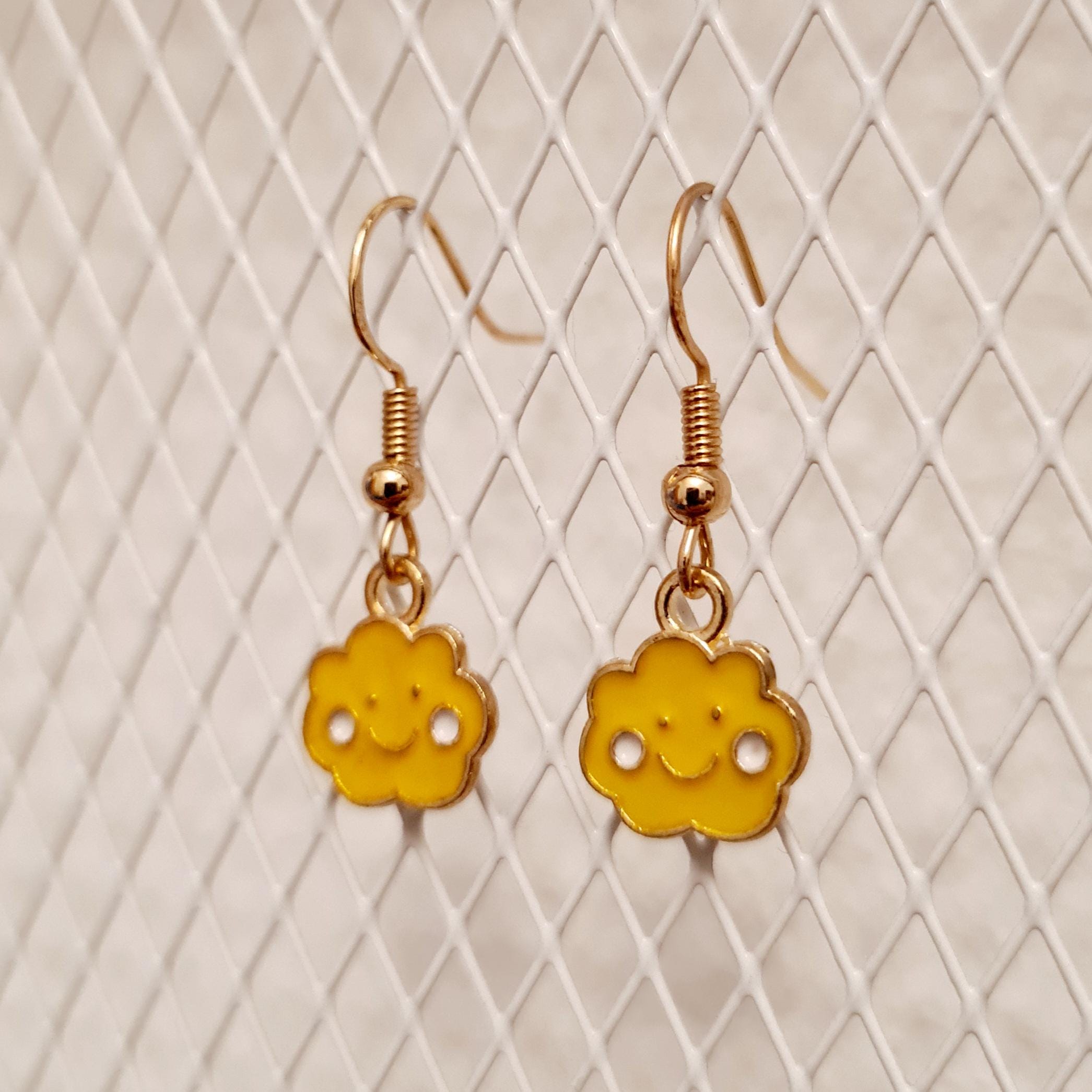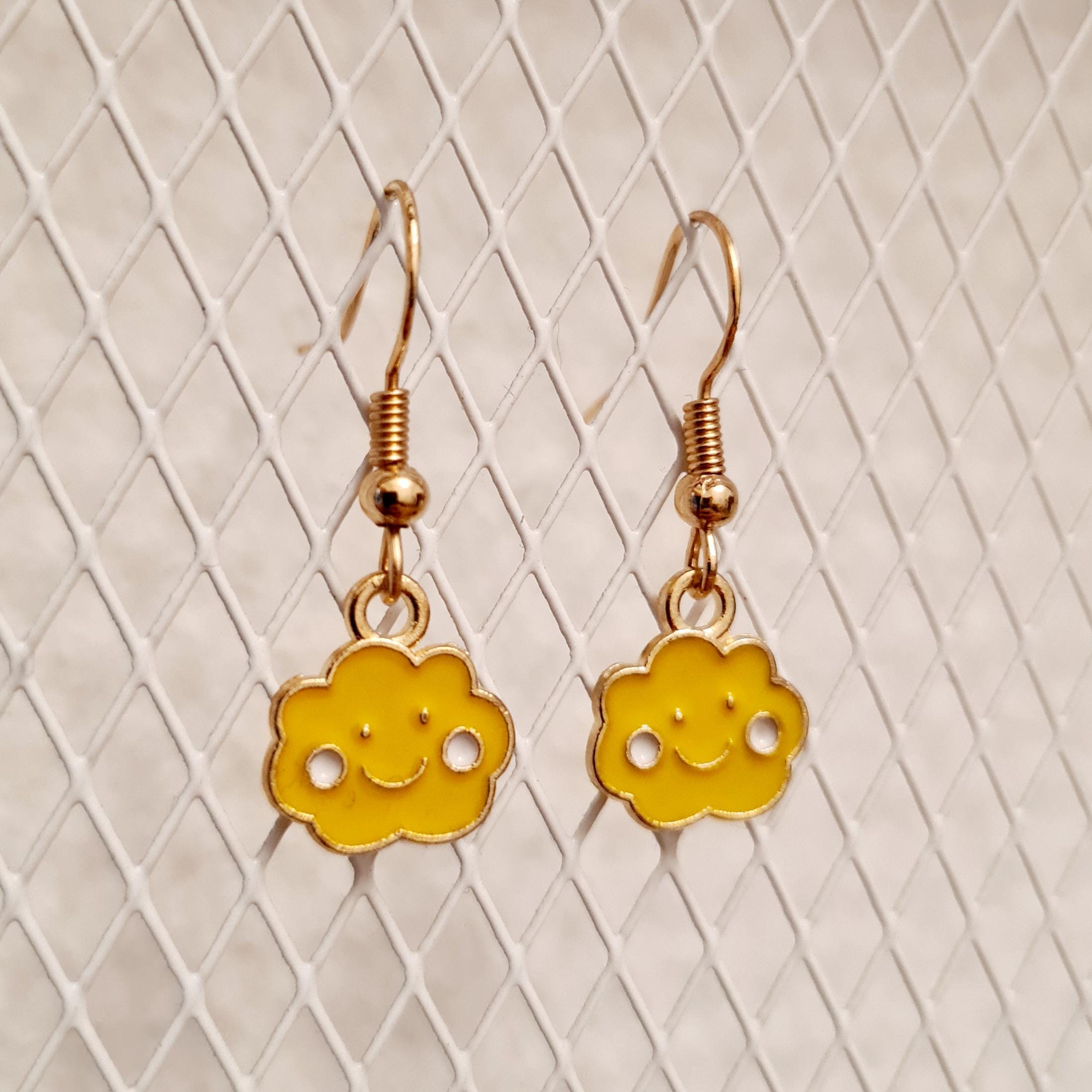 Smiling cloud earrings made of enamel and copper. Available in blue, purple, yellow, or pink.