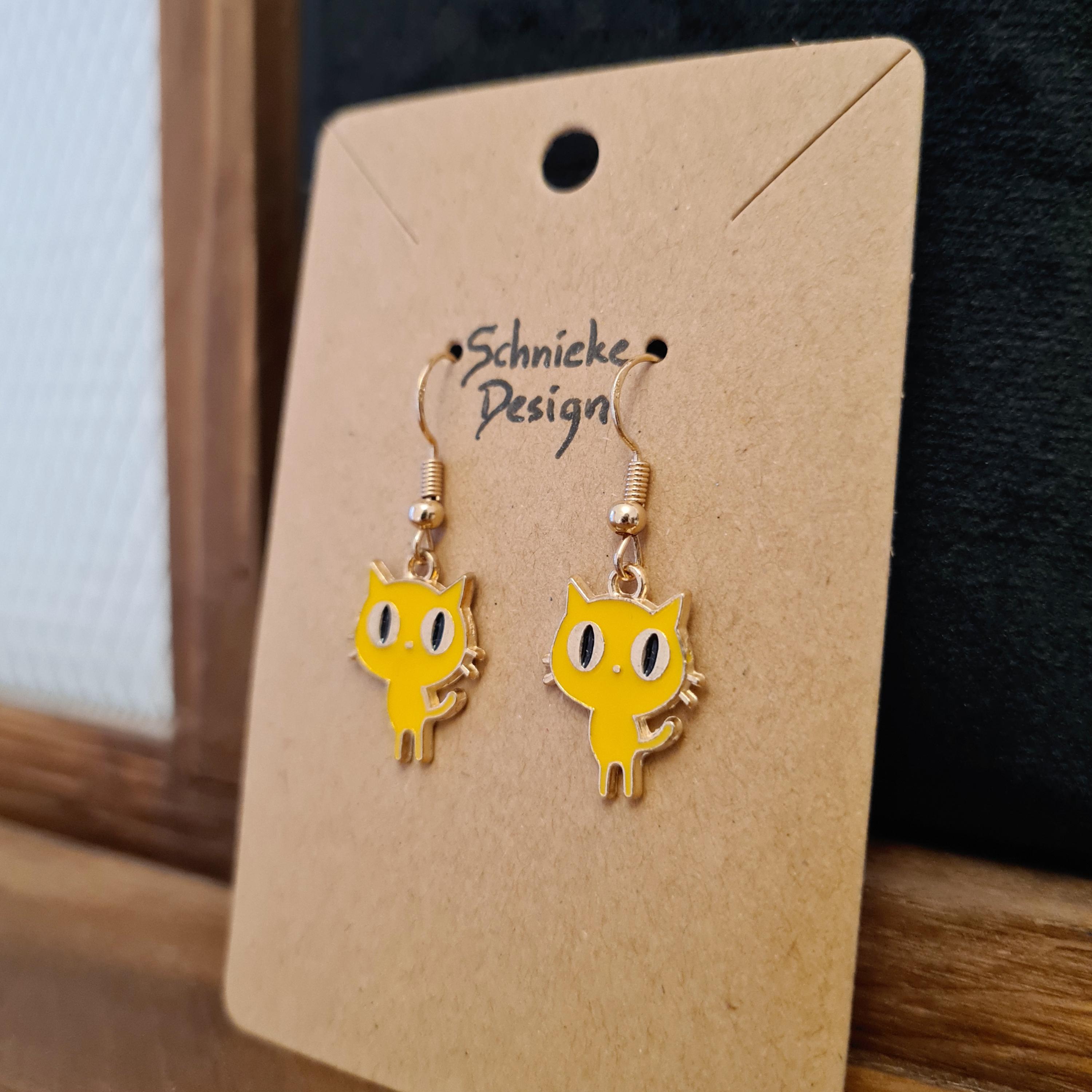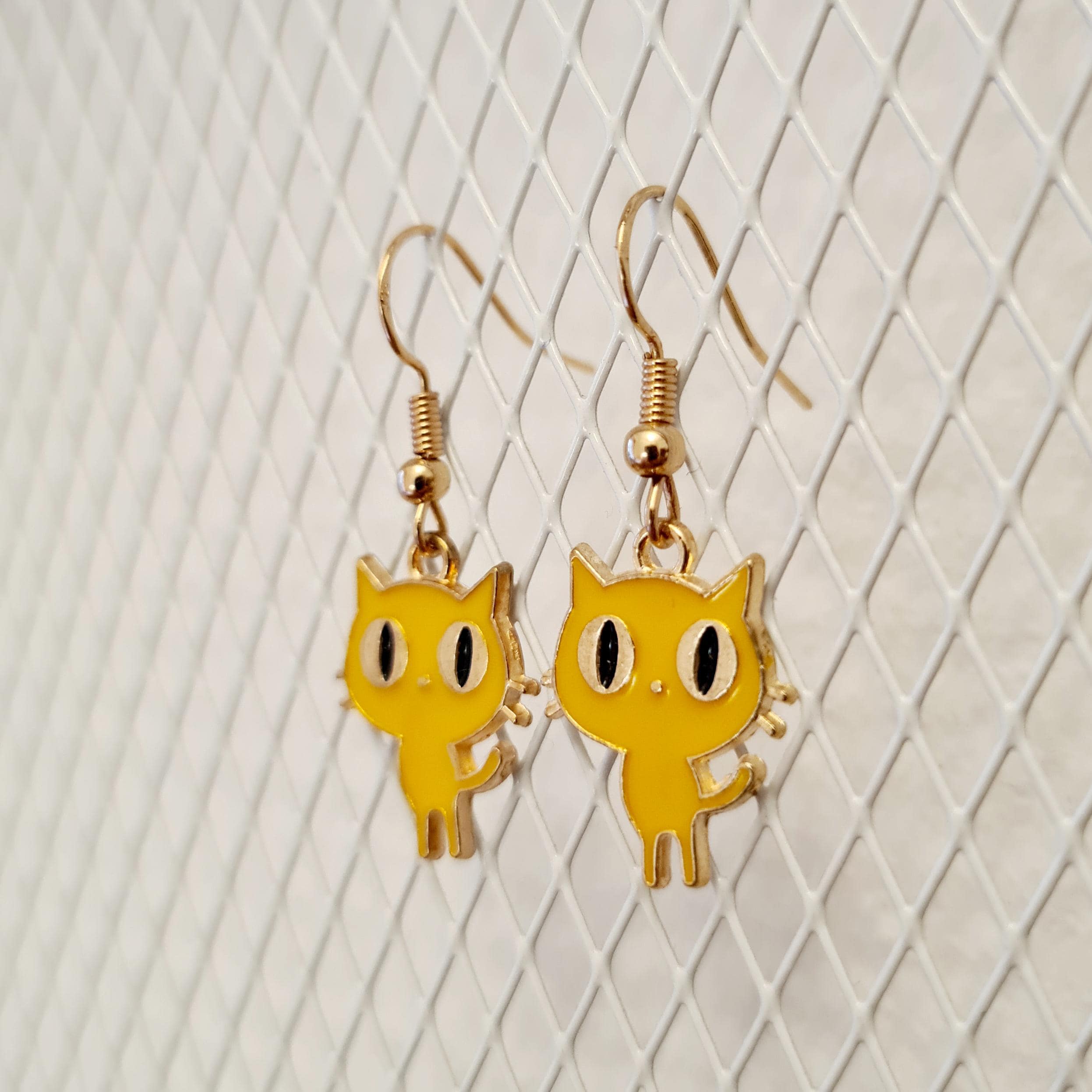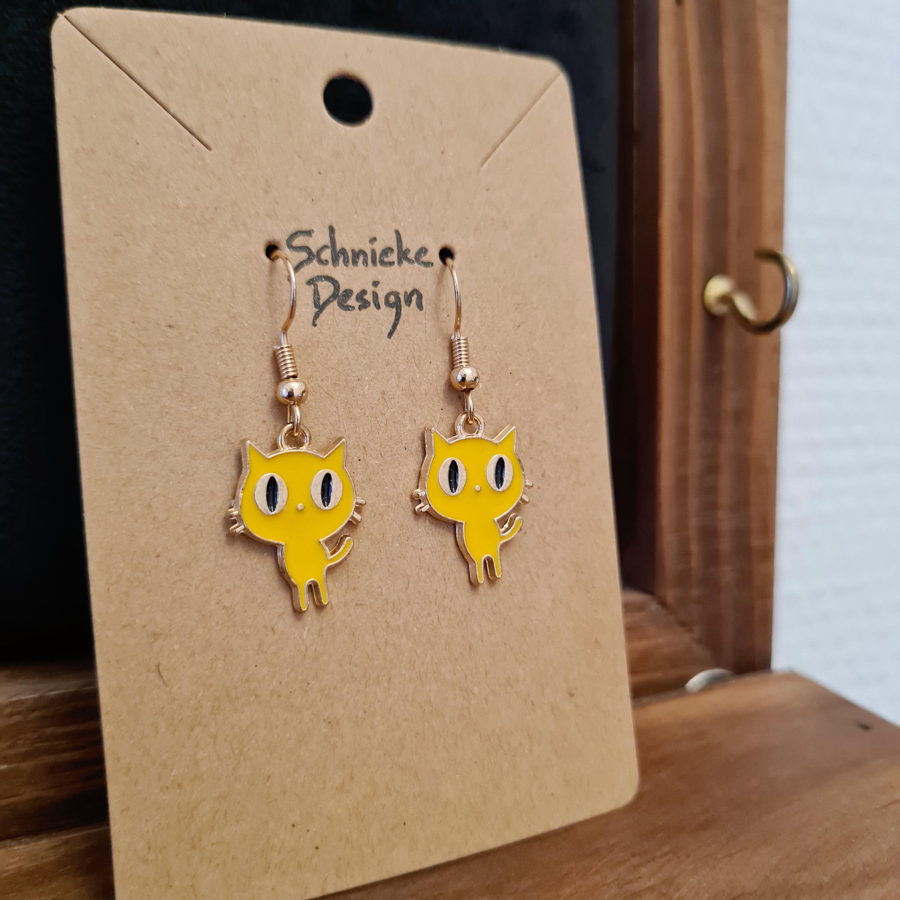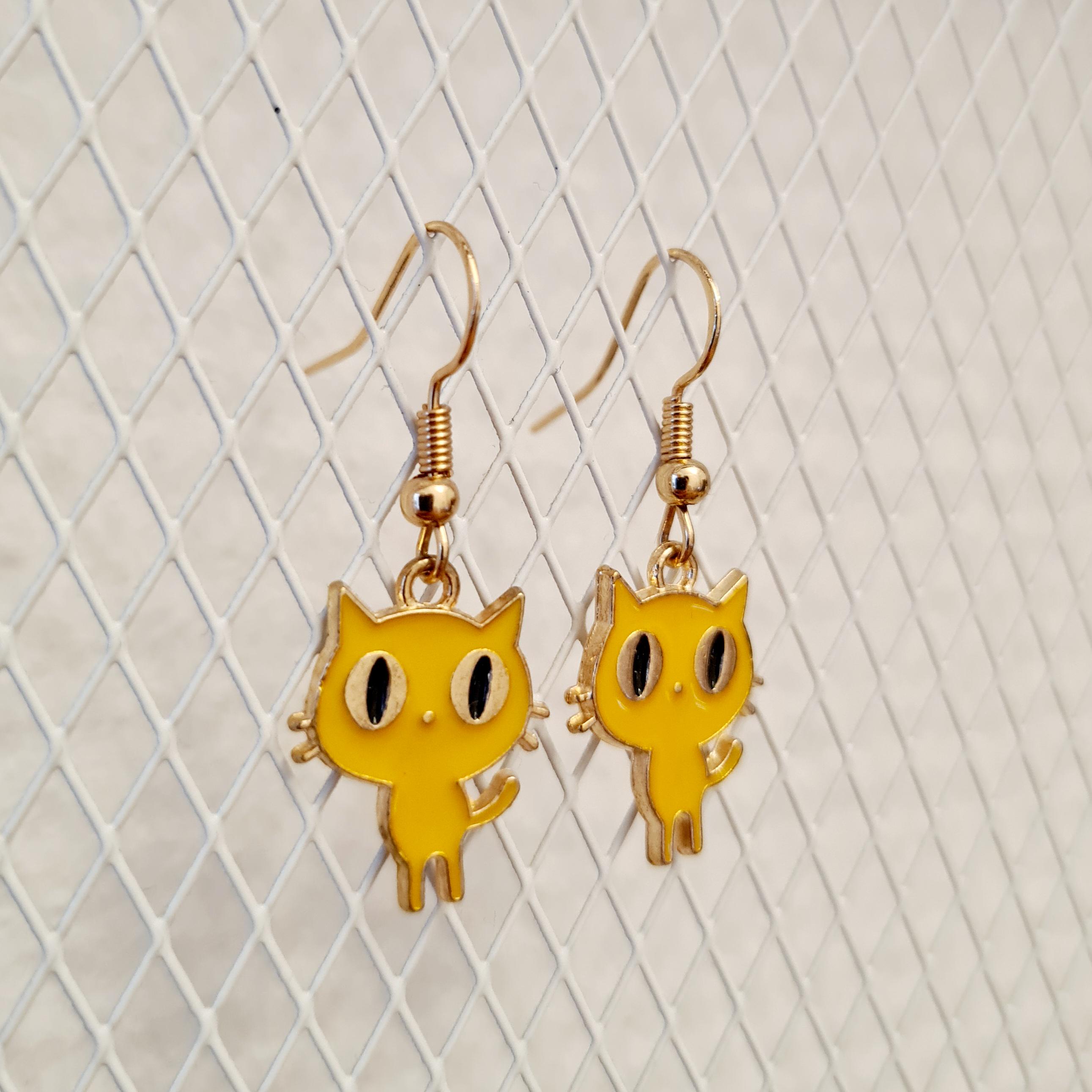 Cat earrings made of enamel and copper. Available in black, yellow, or purple.
