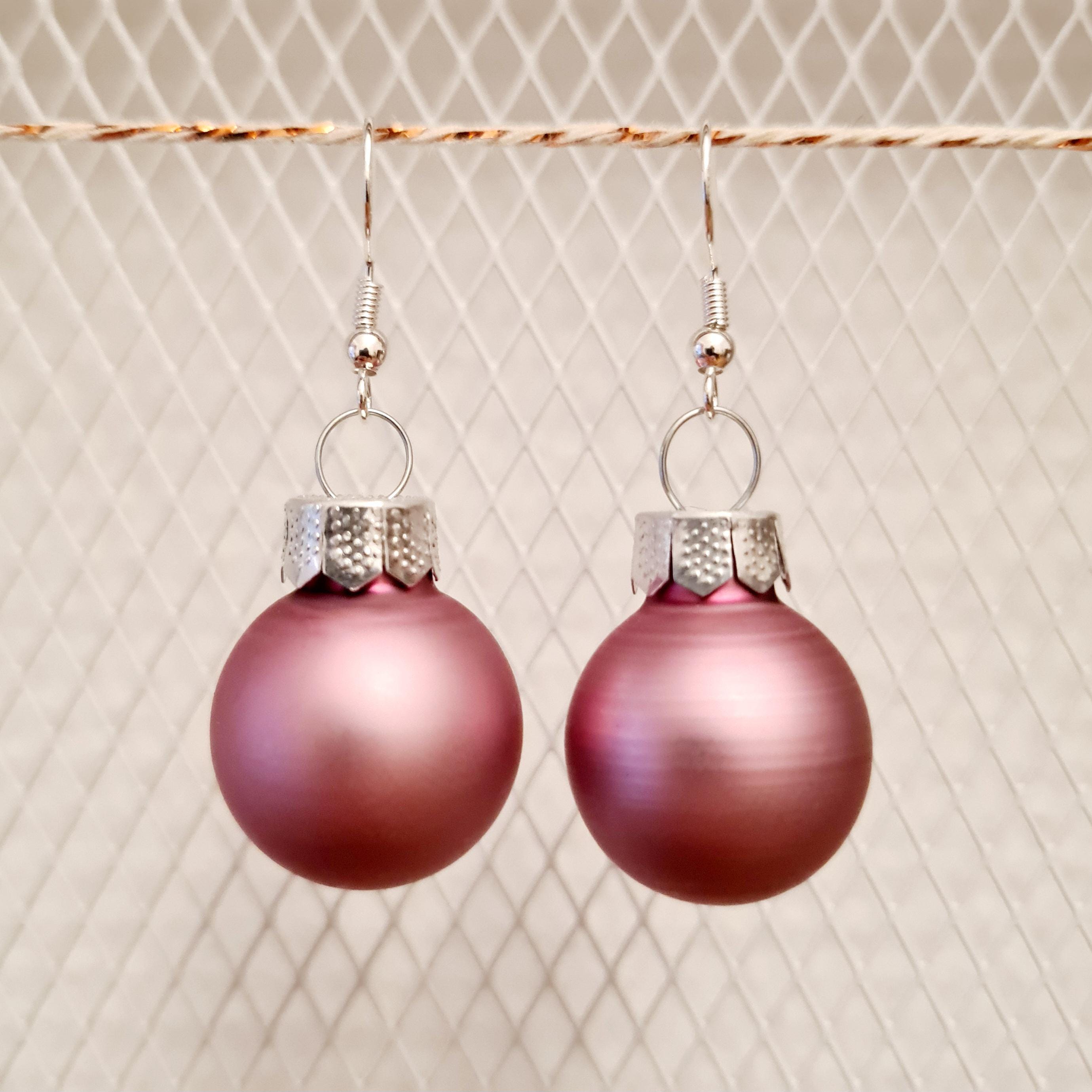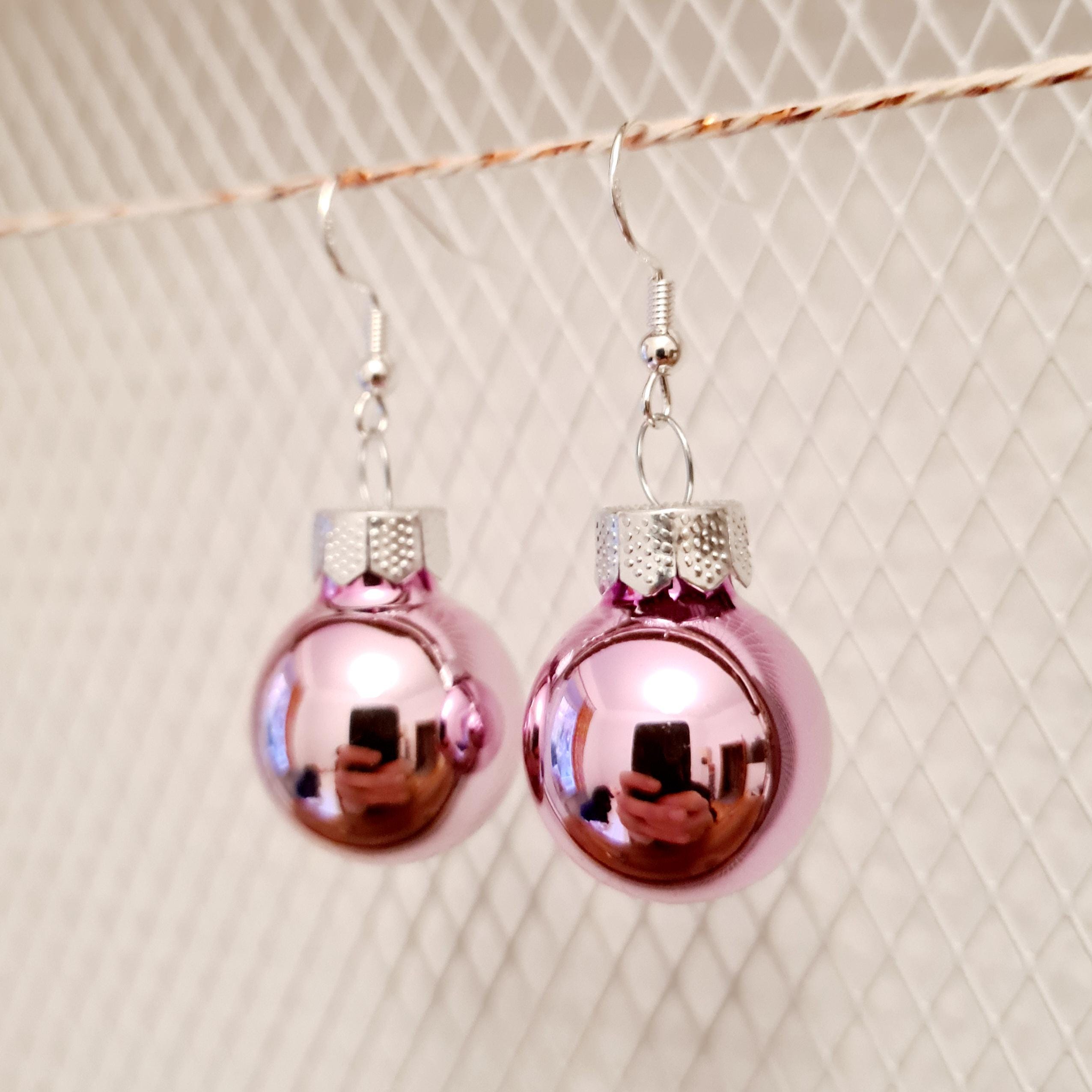 Christmas earrings with pink Christmas tree balls in matte and shiny.