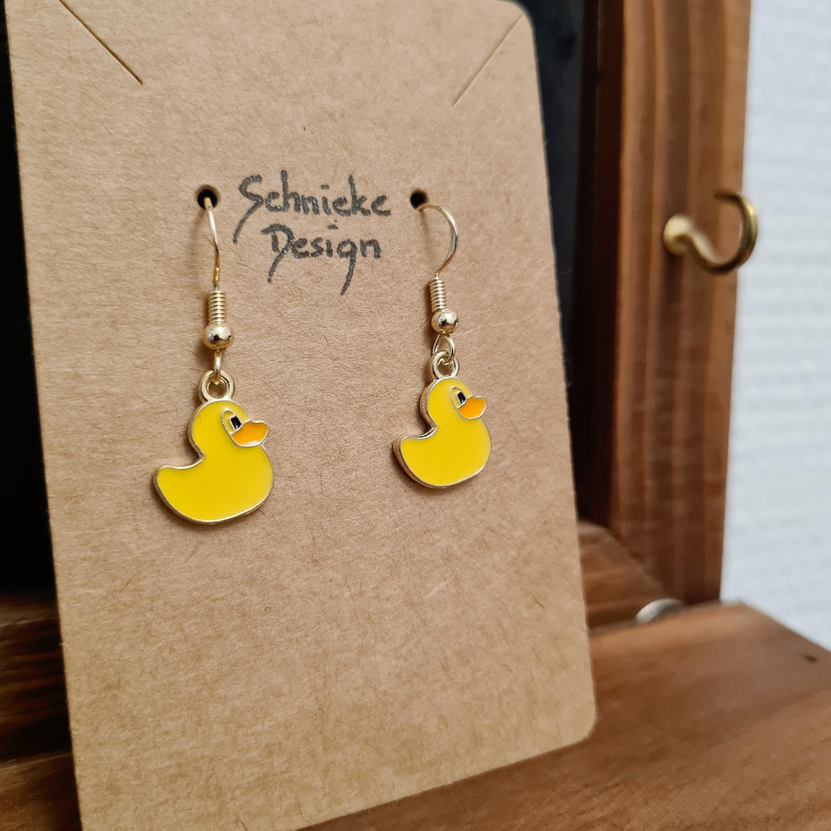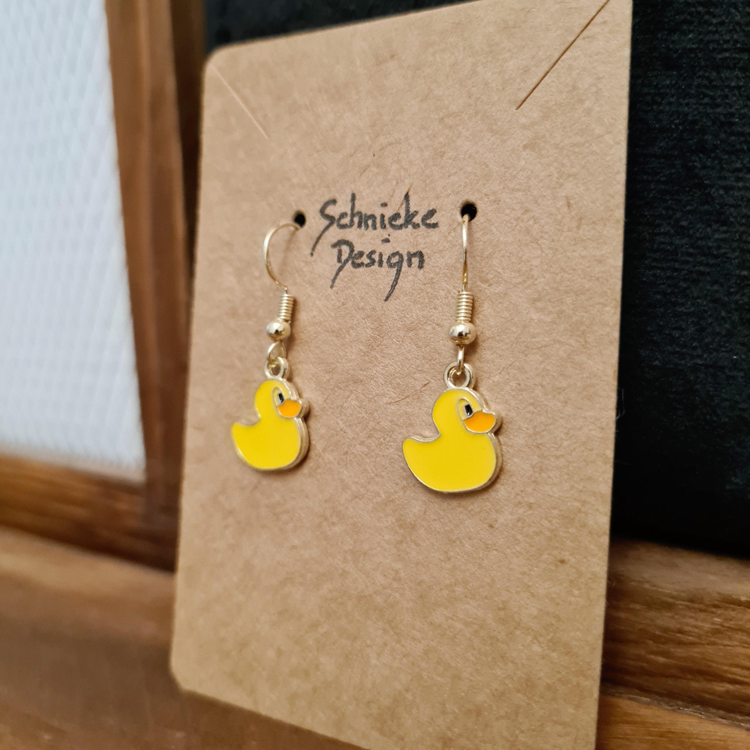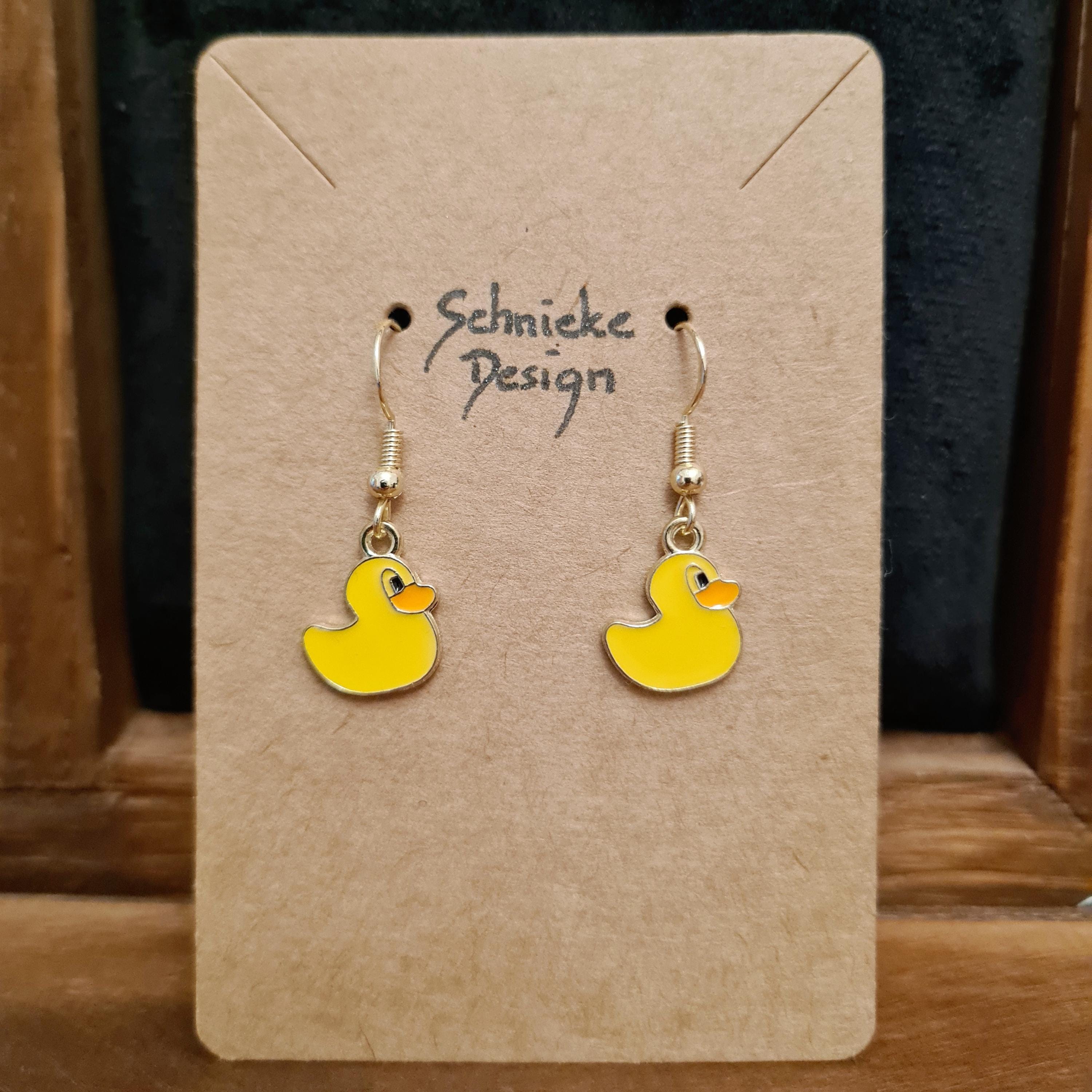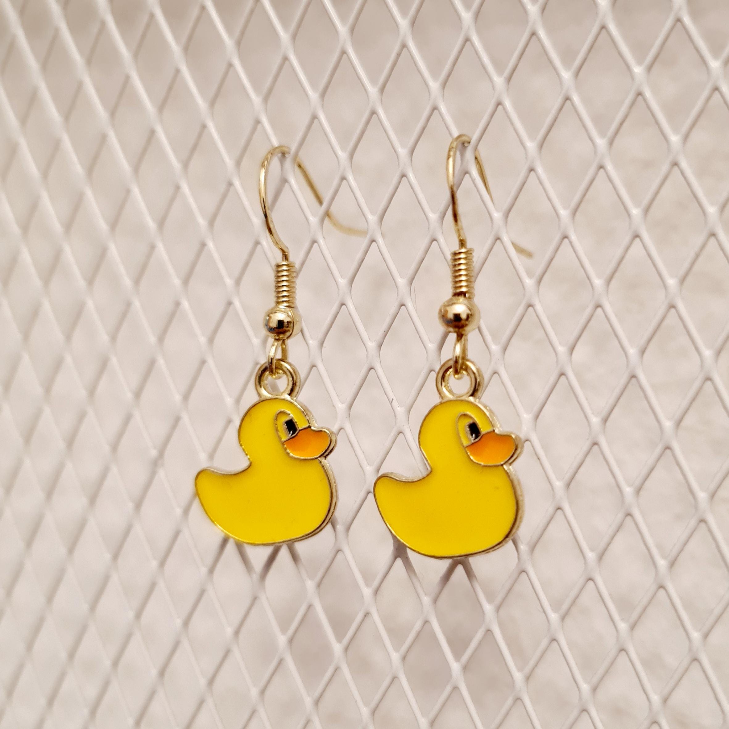 Earrings with yellow squeaky ducks made of enamel and copper.