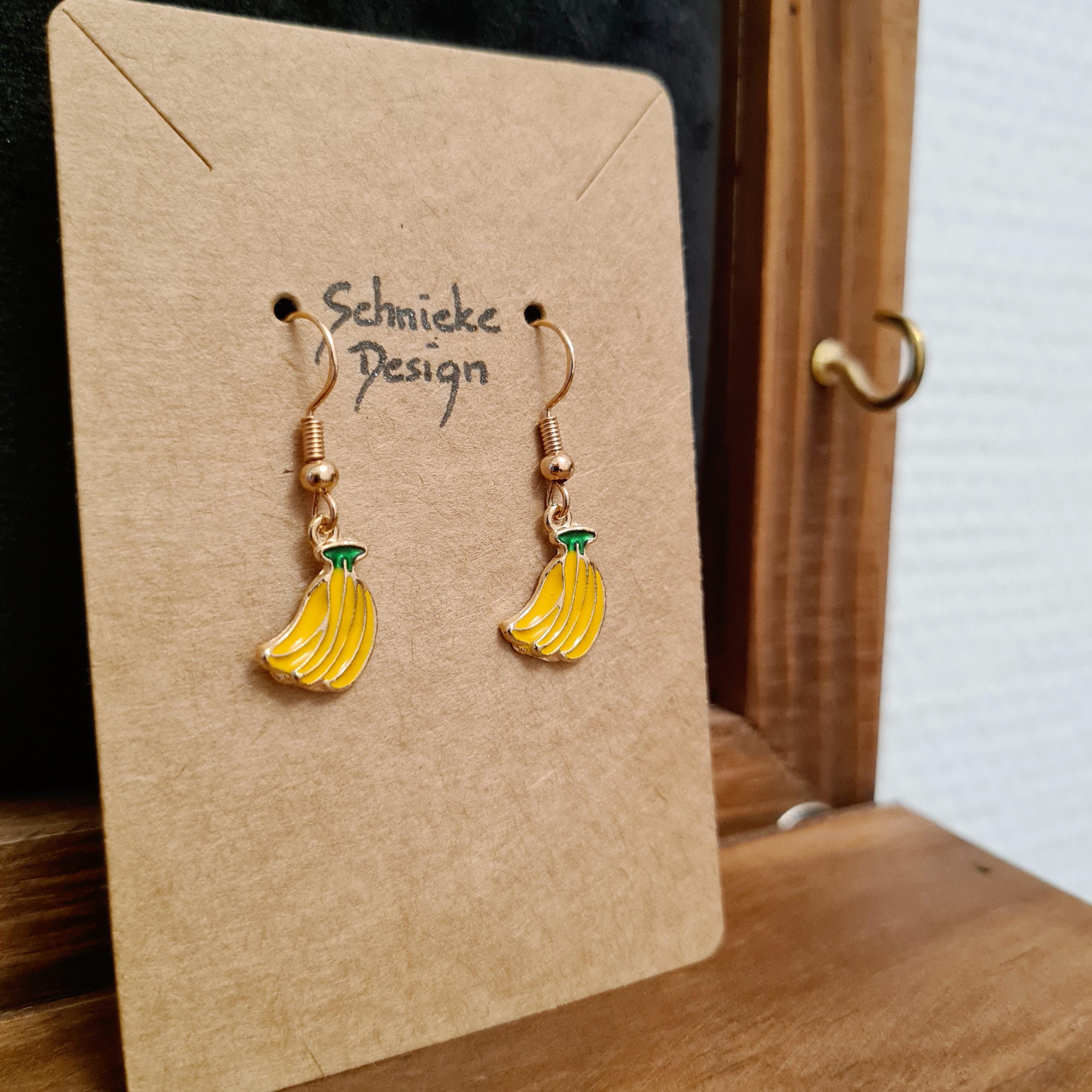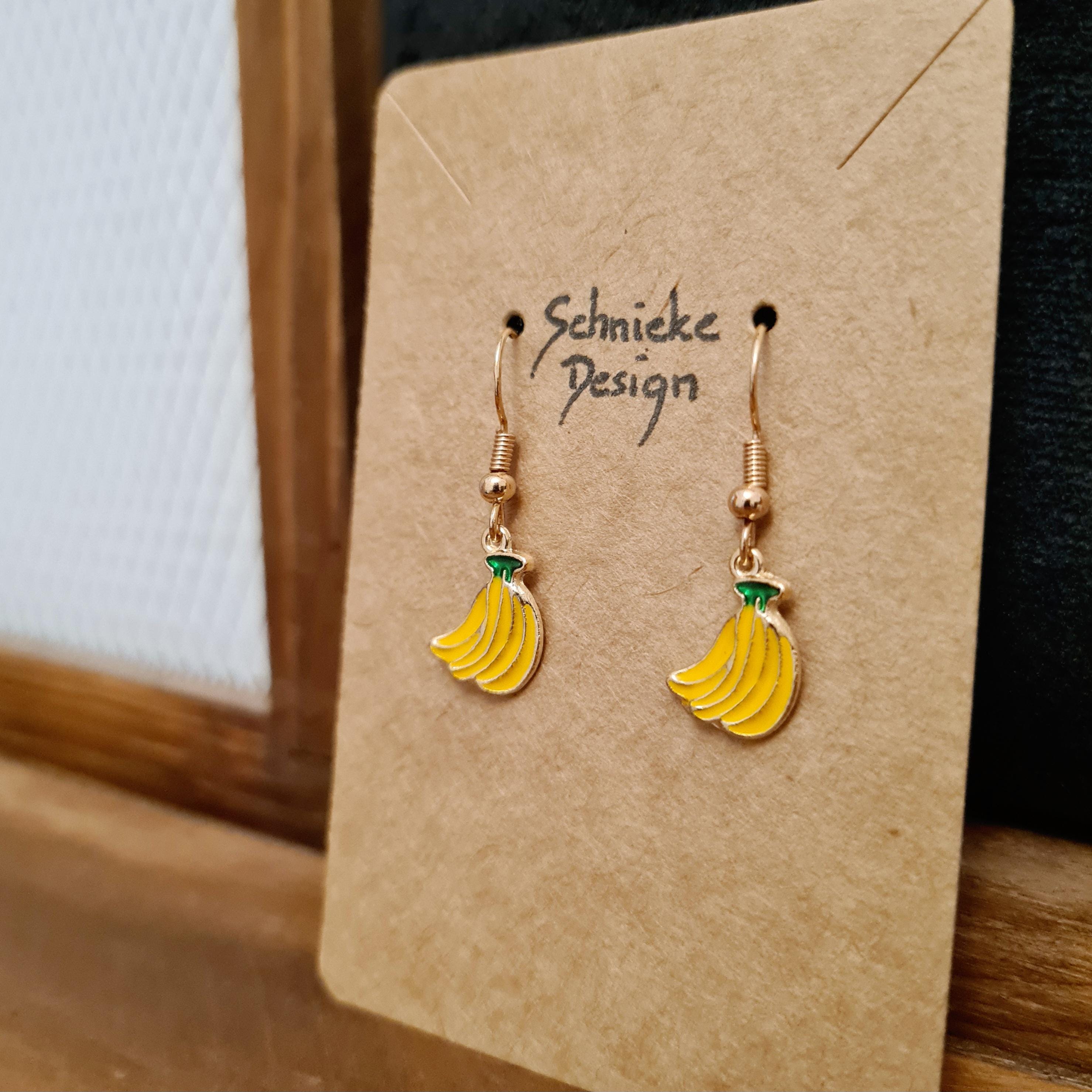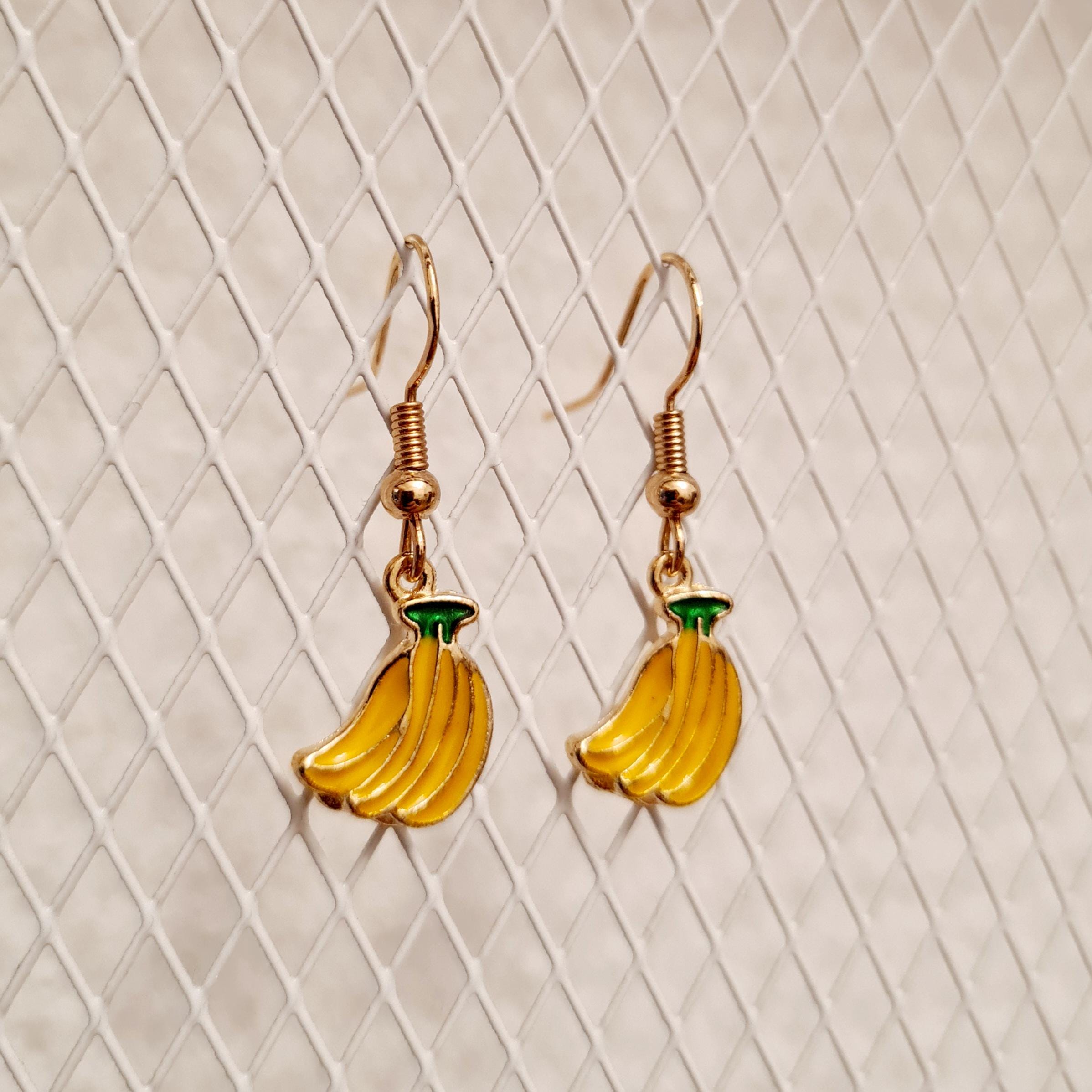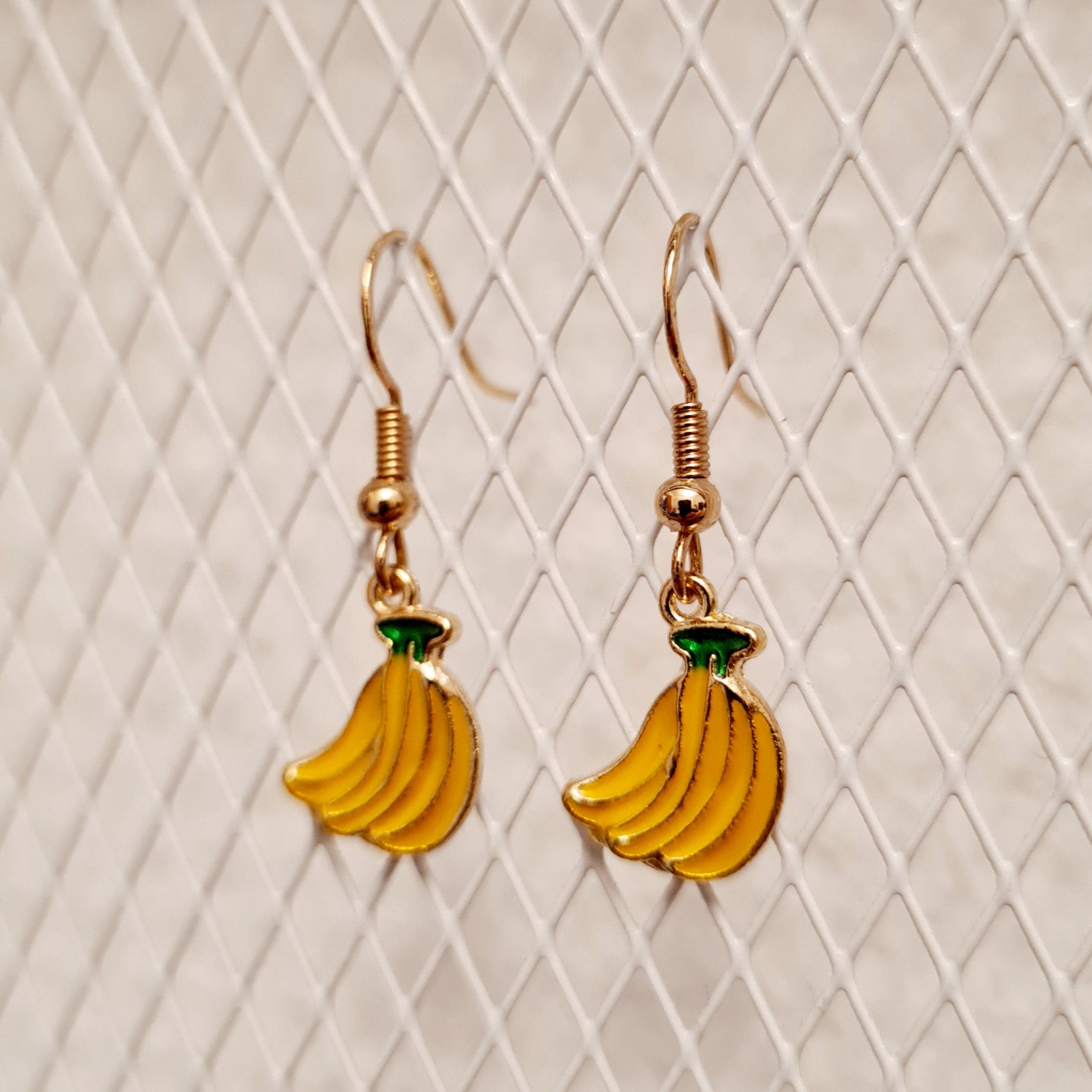 Banana earrings made of enamel and copper in yellow, green and gold.