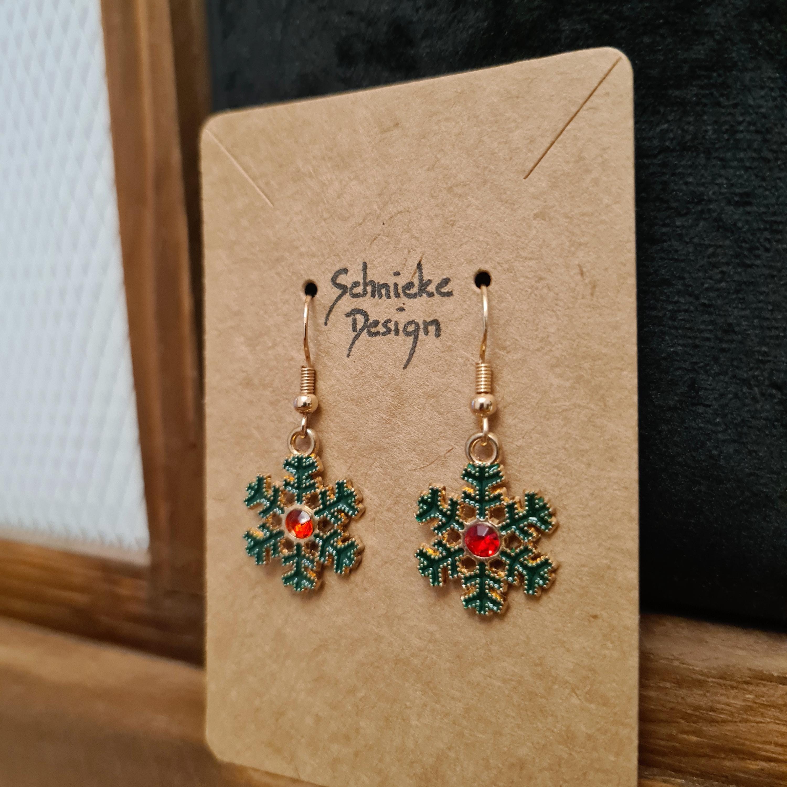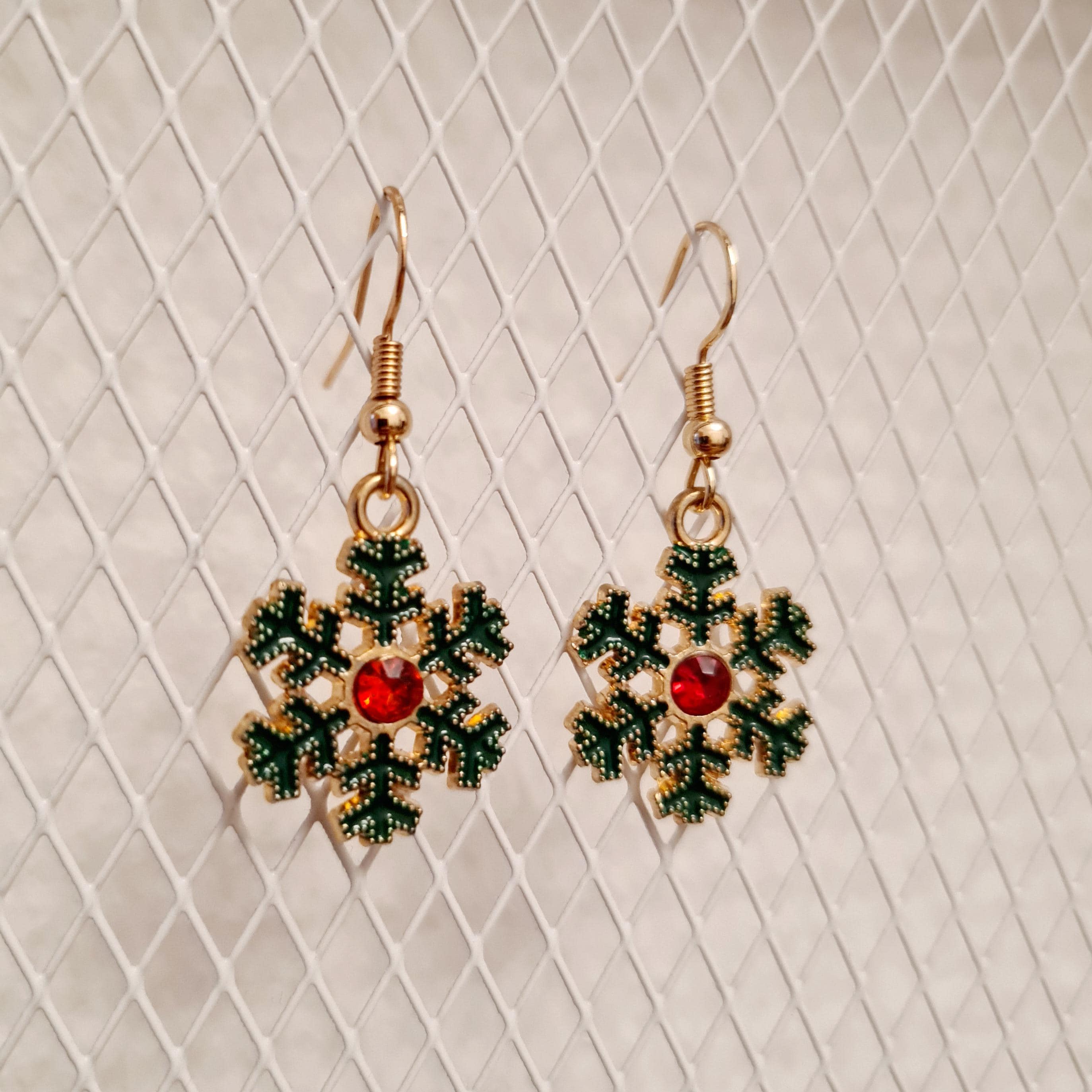 Christmas earrings with snowflakes in green and gold with a red glitter stone in the middle.