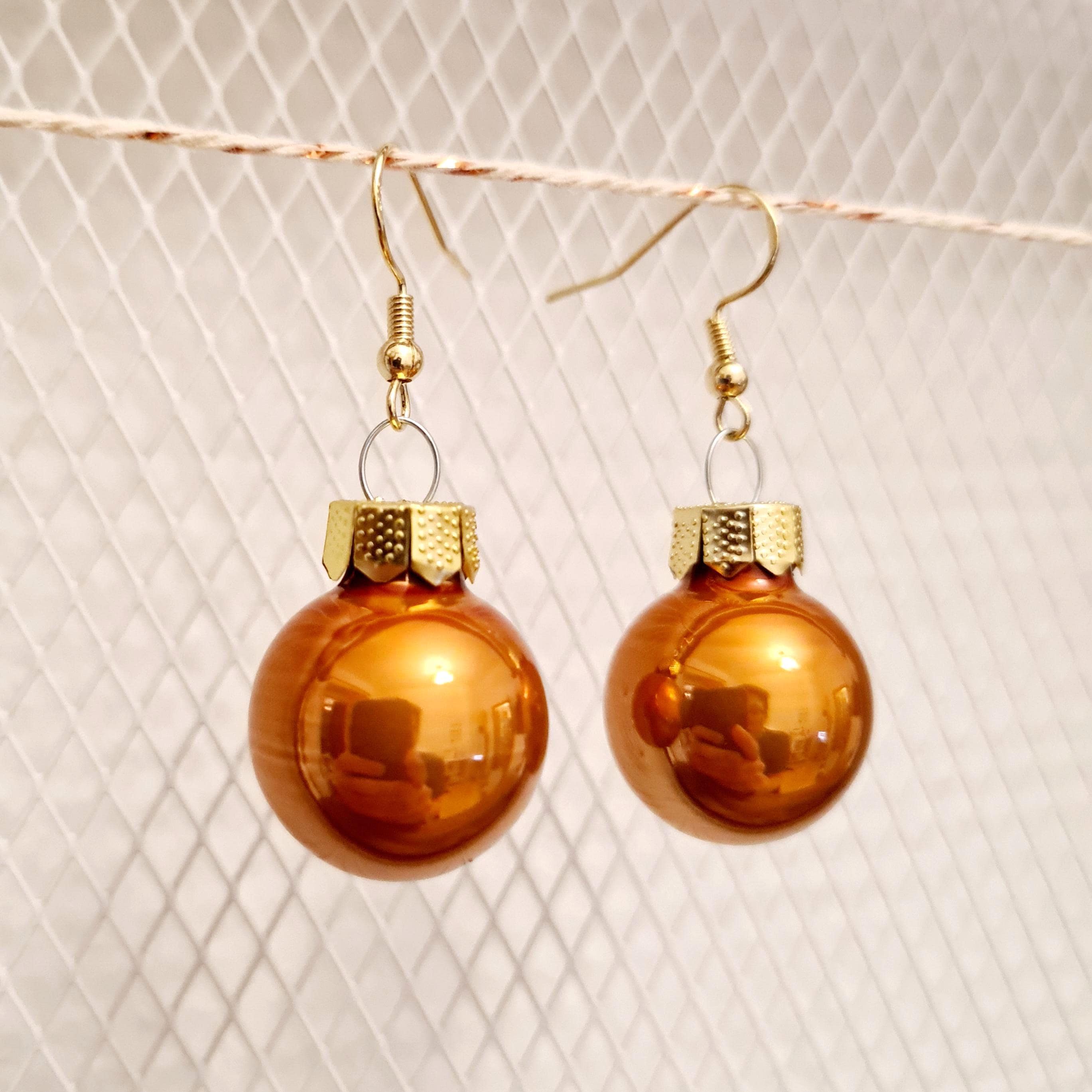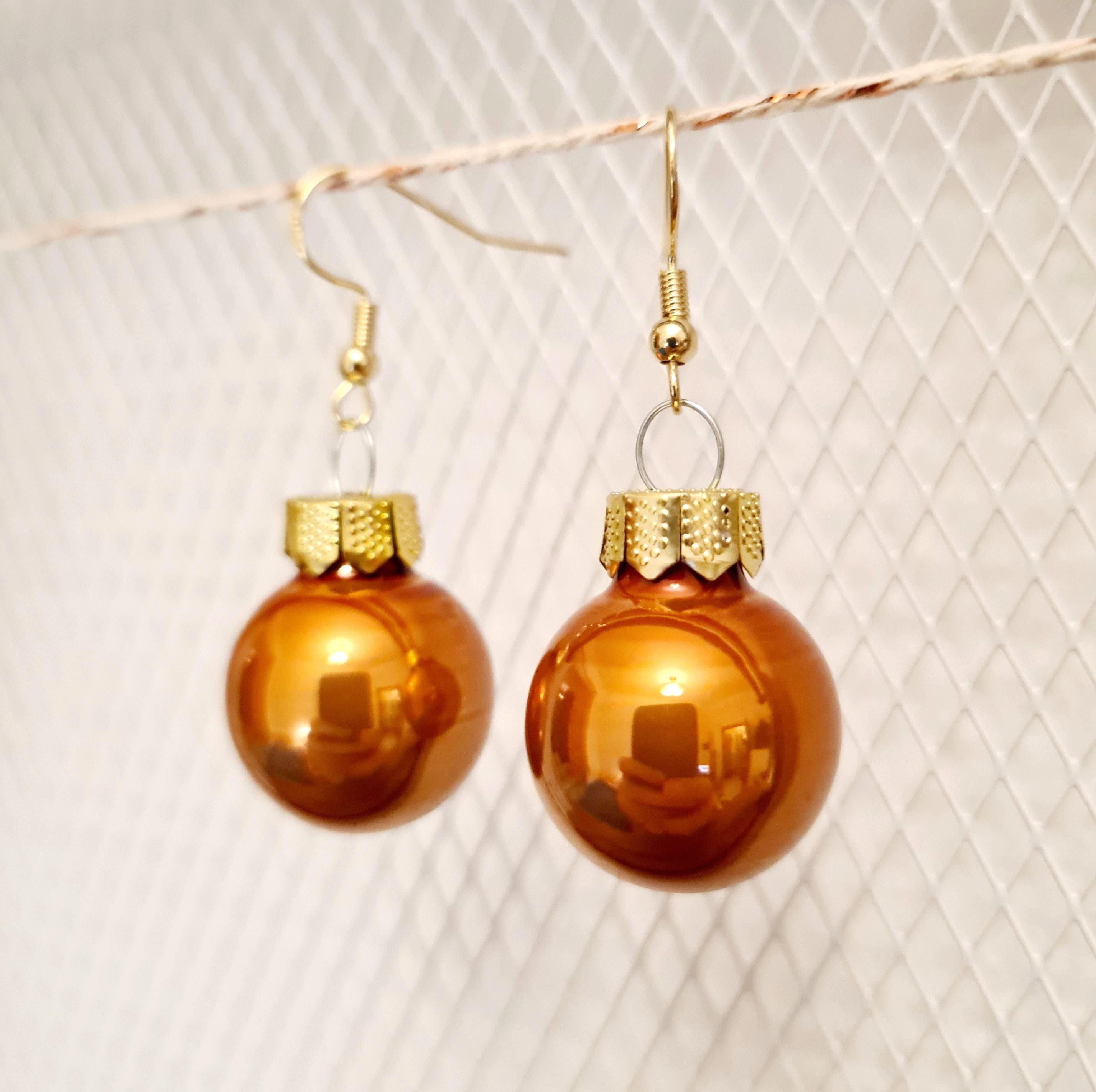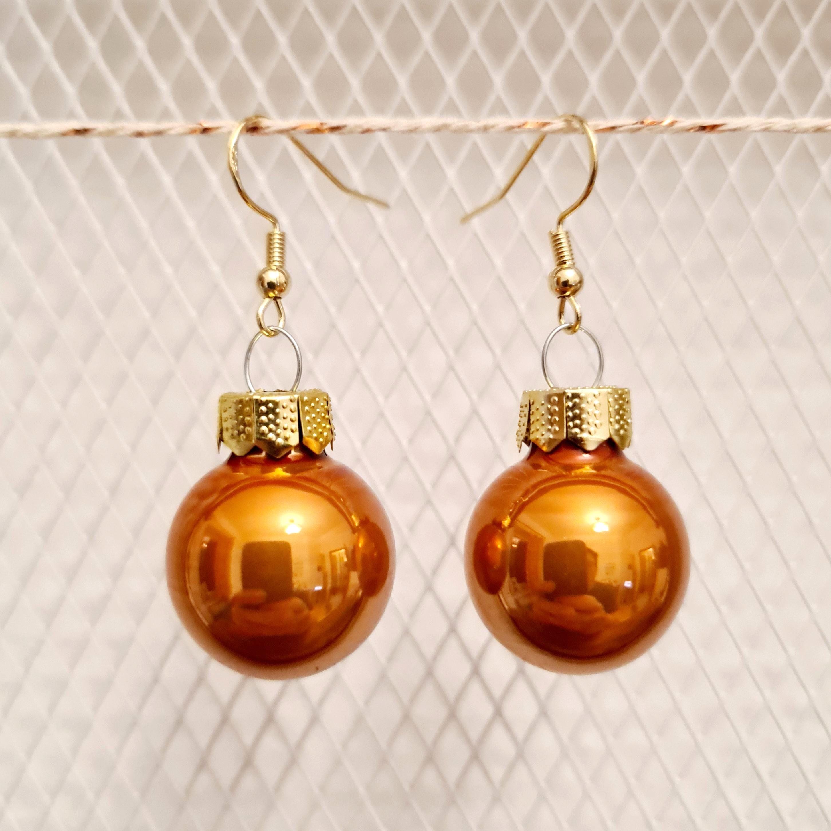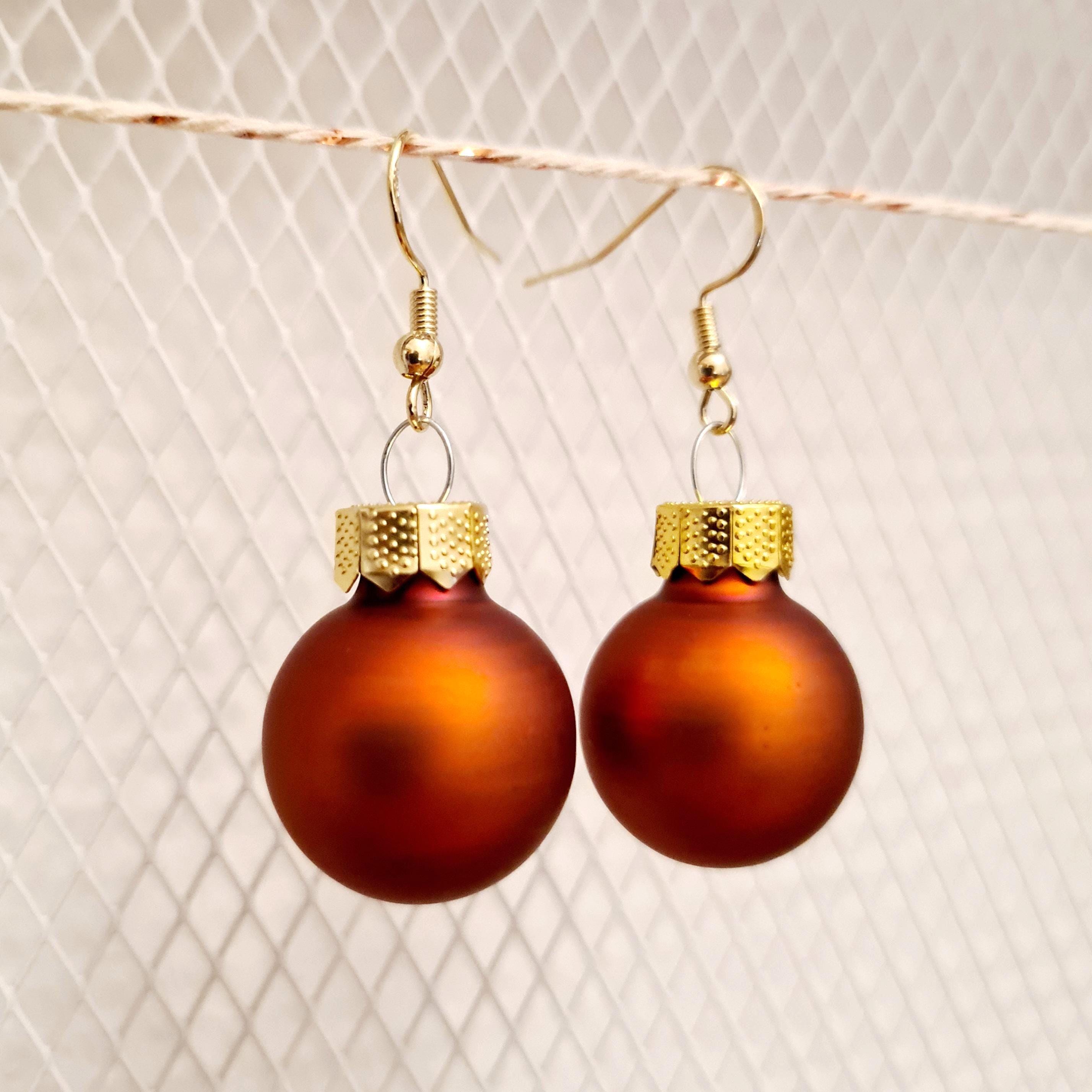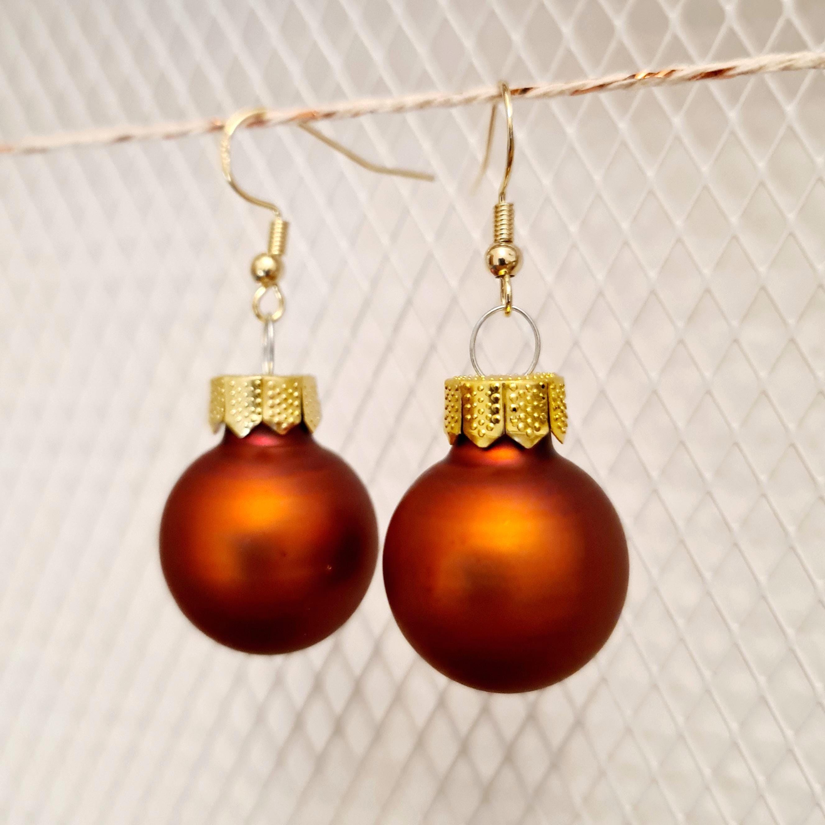 Christmas earrings with terracotta-colored Christmas tree baubles in matte or glossy finishes.