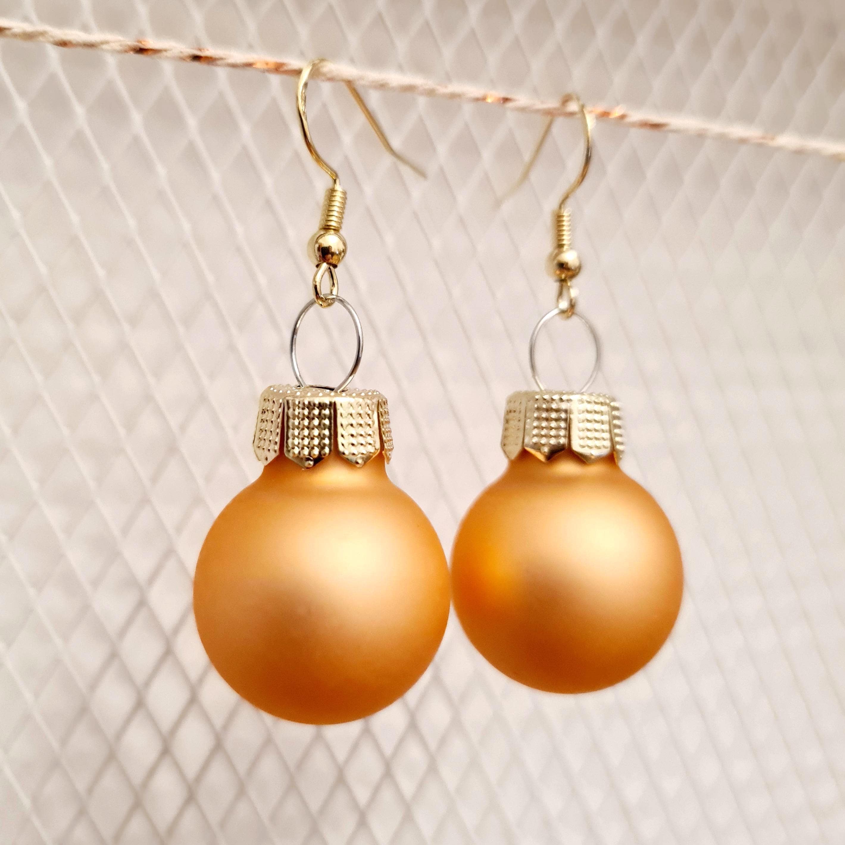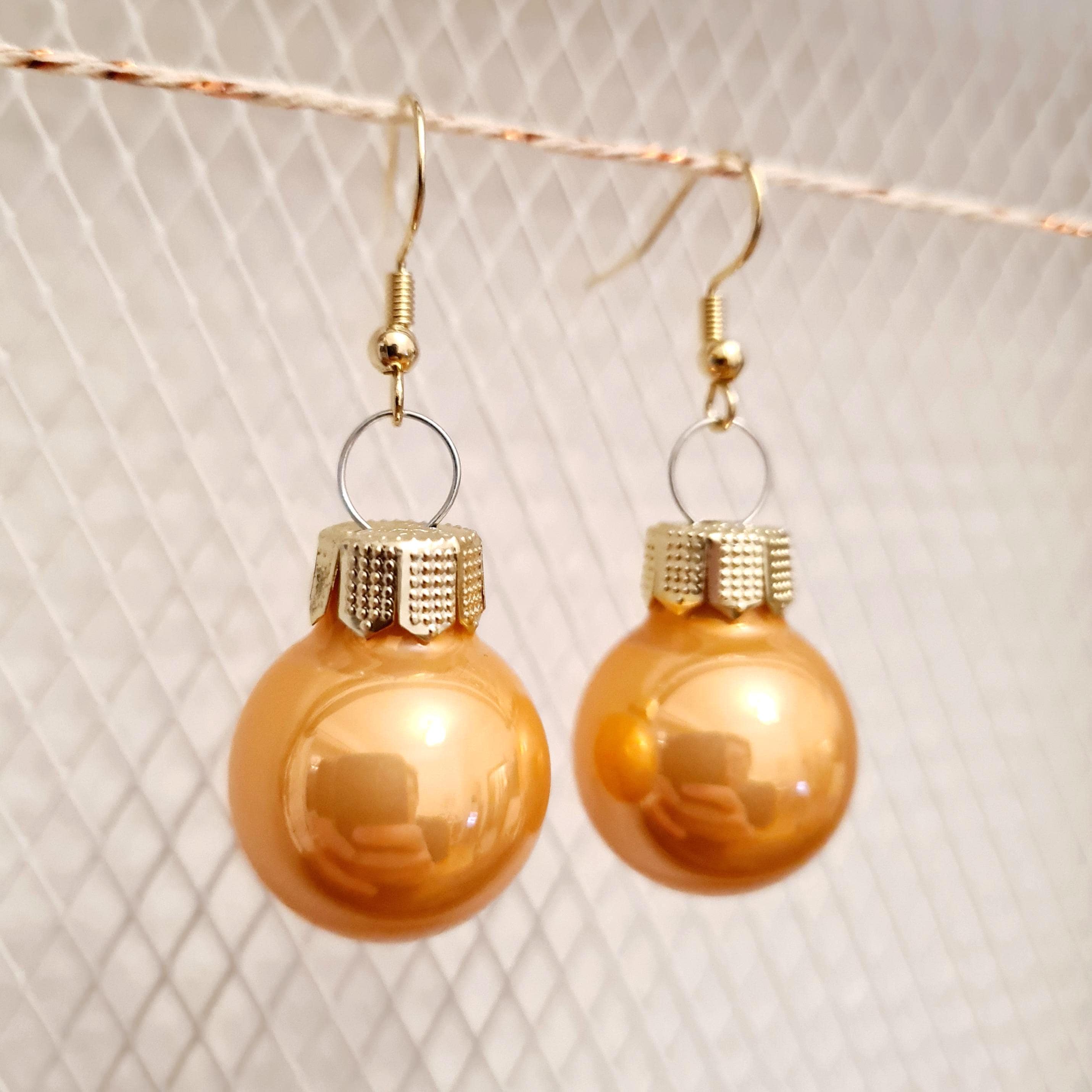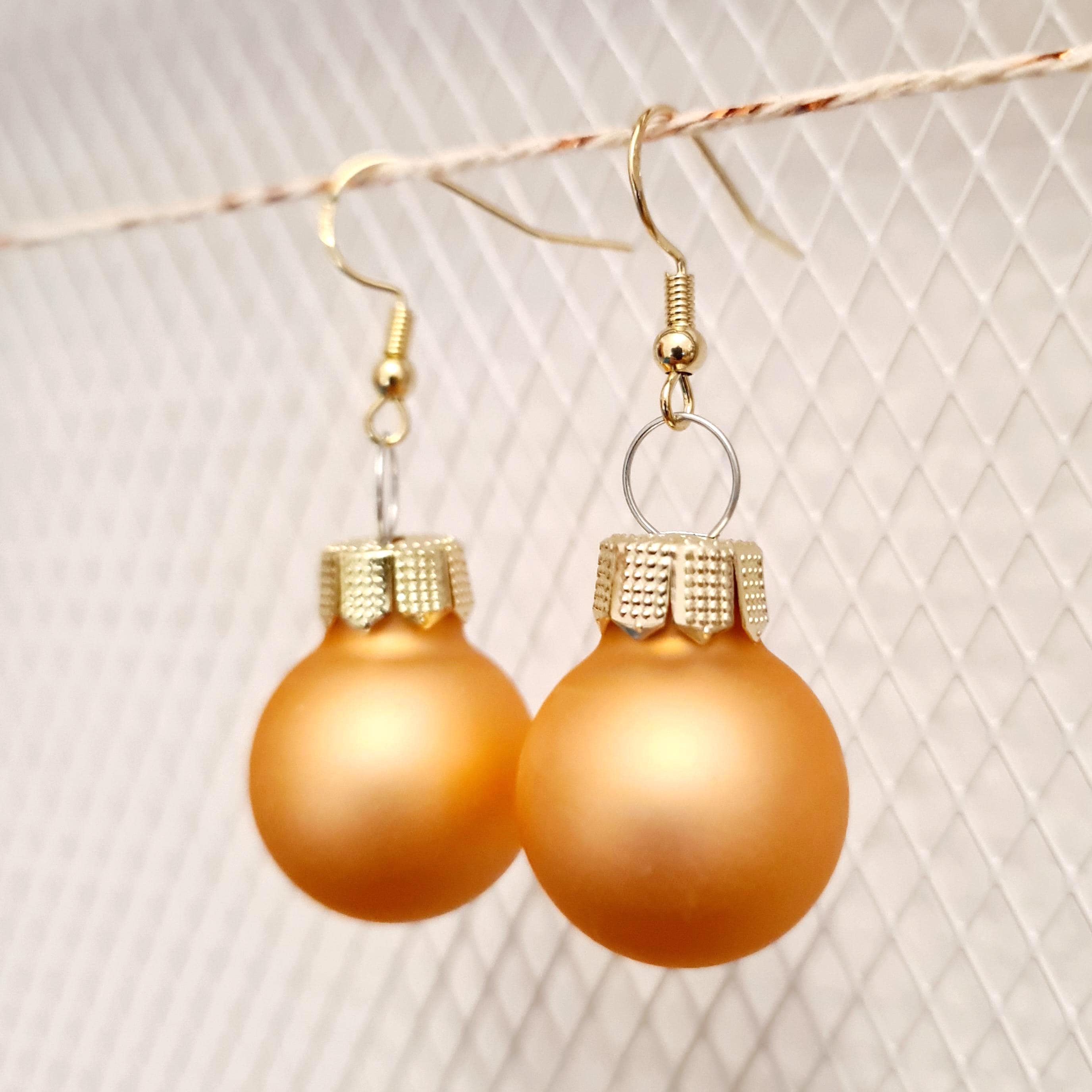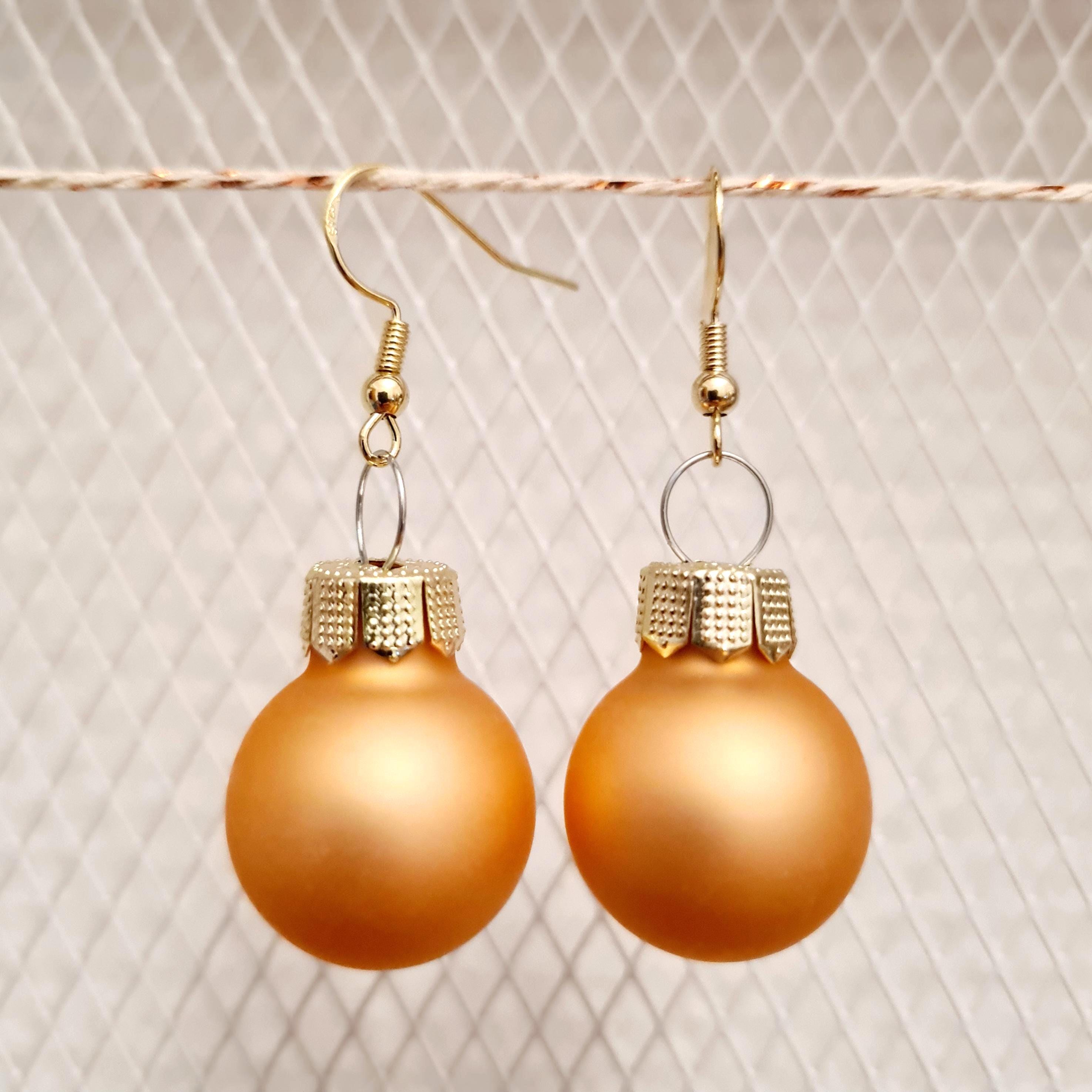 Christmas earrings with apricot-colored Christmas tree baubles in matte or glossy finishes.
