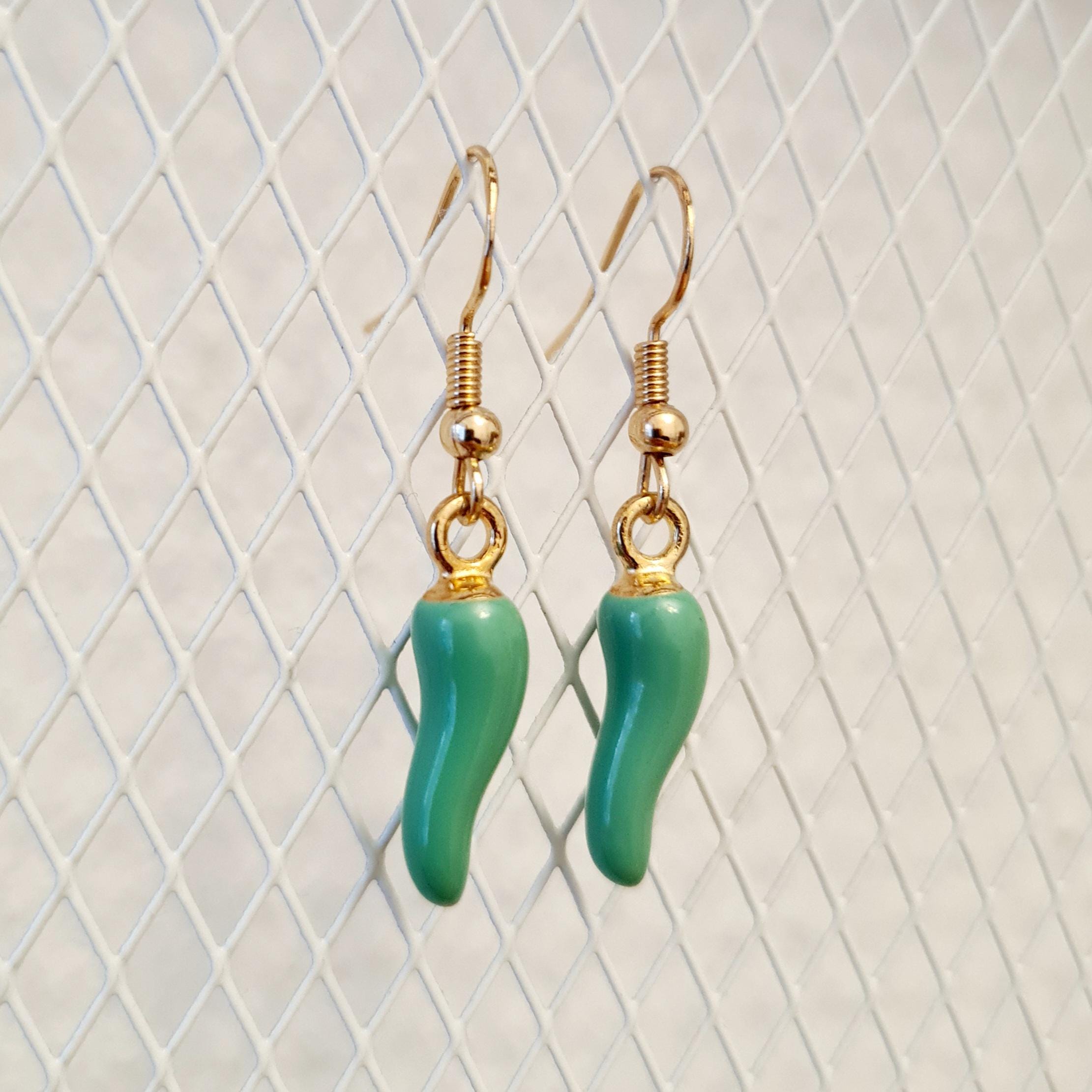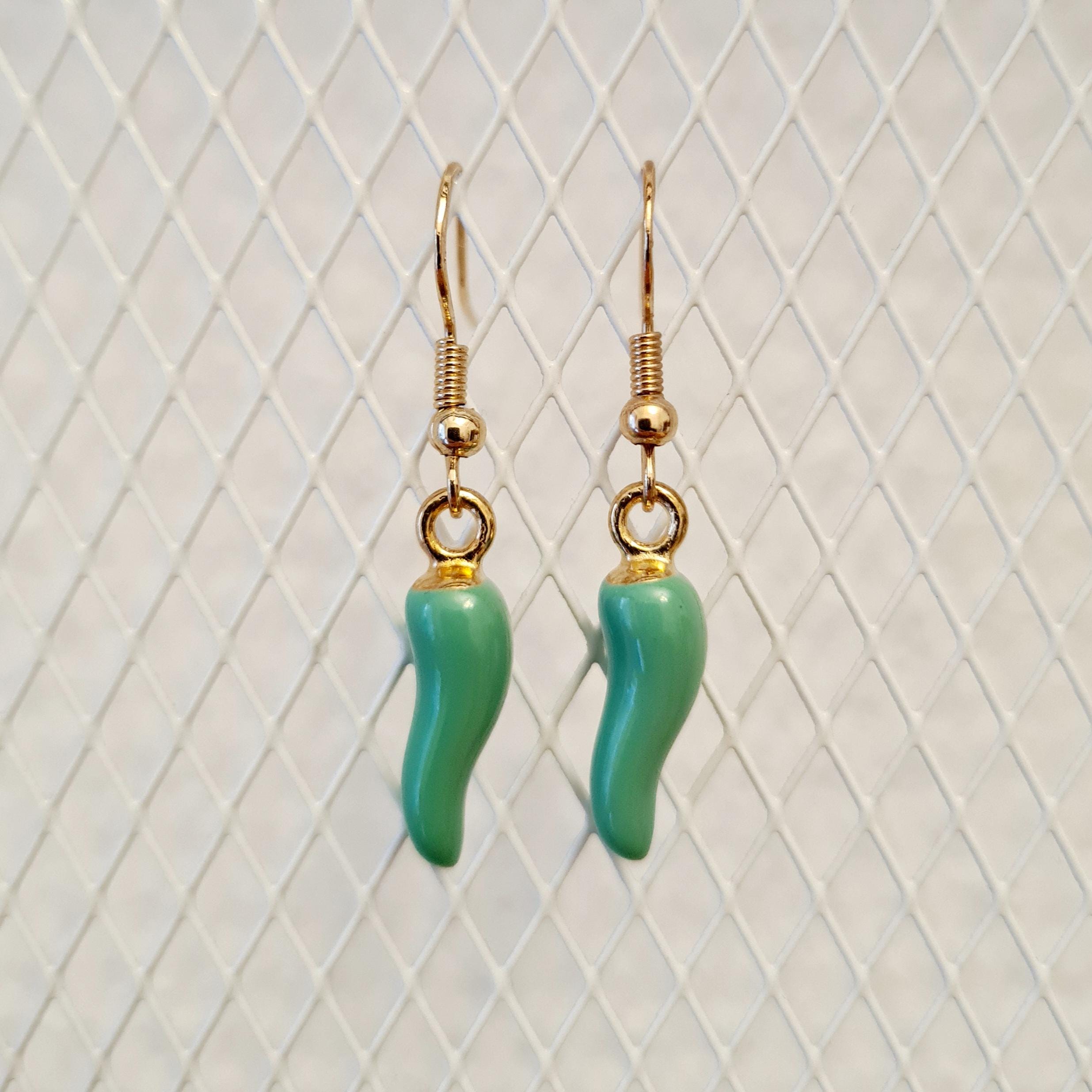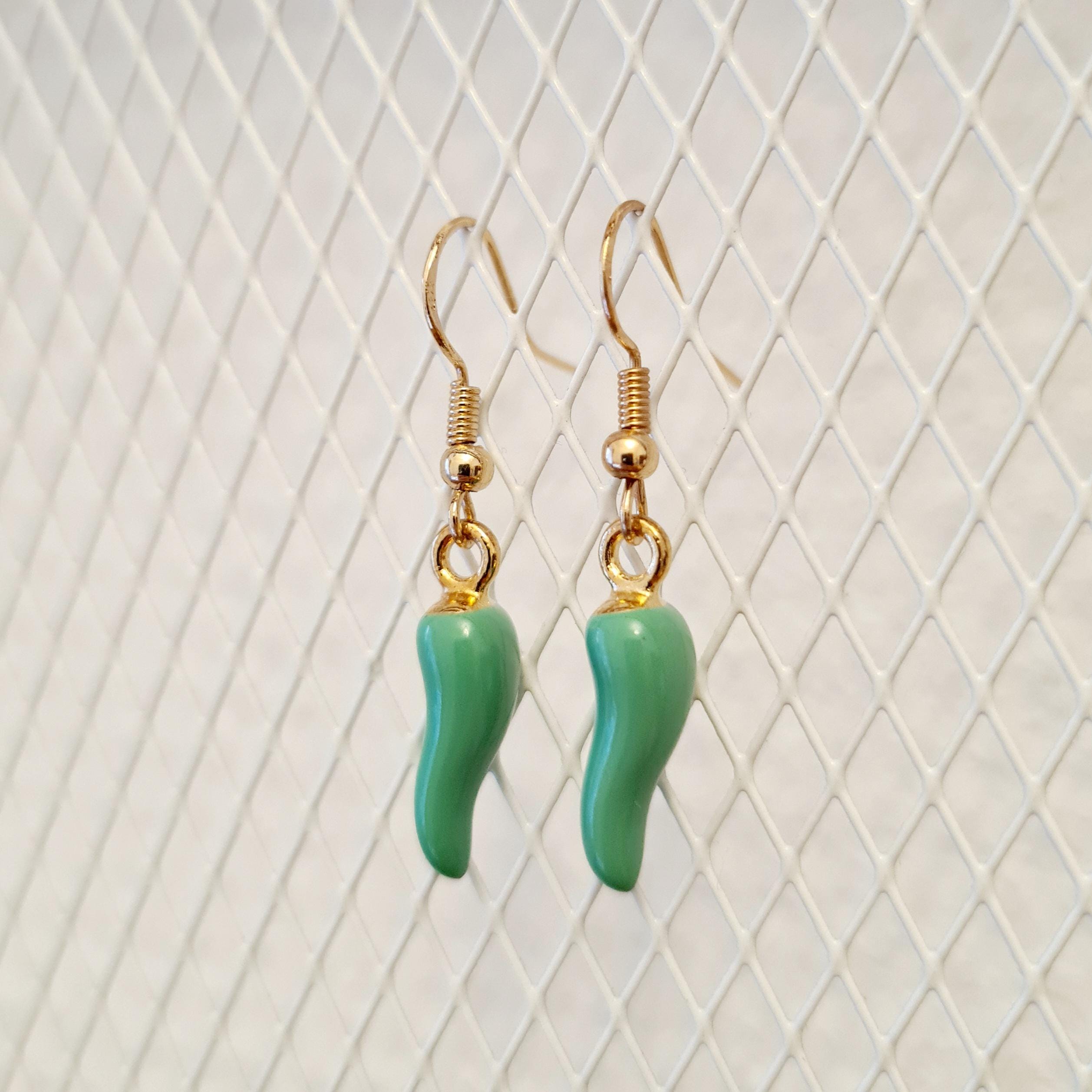 Green chili earrings made of enamel and copper.