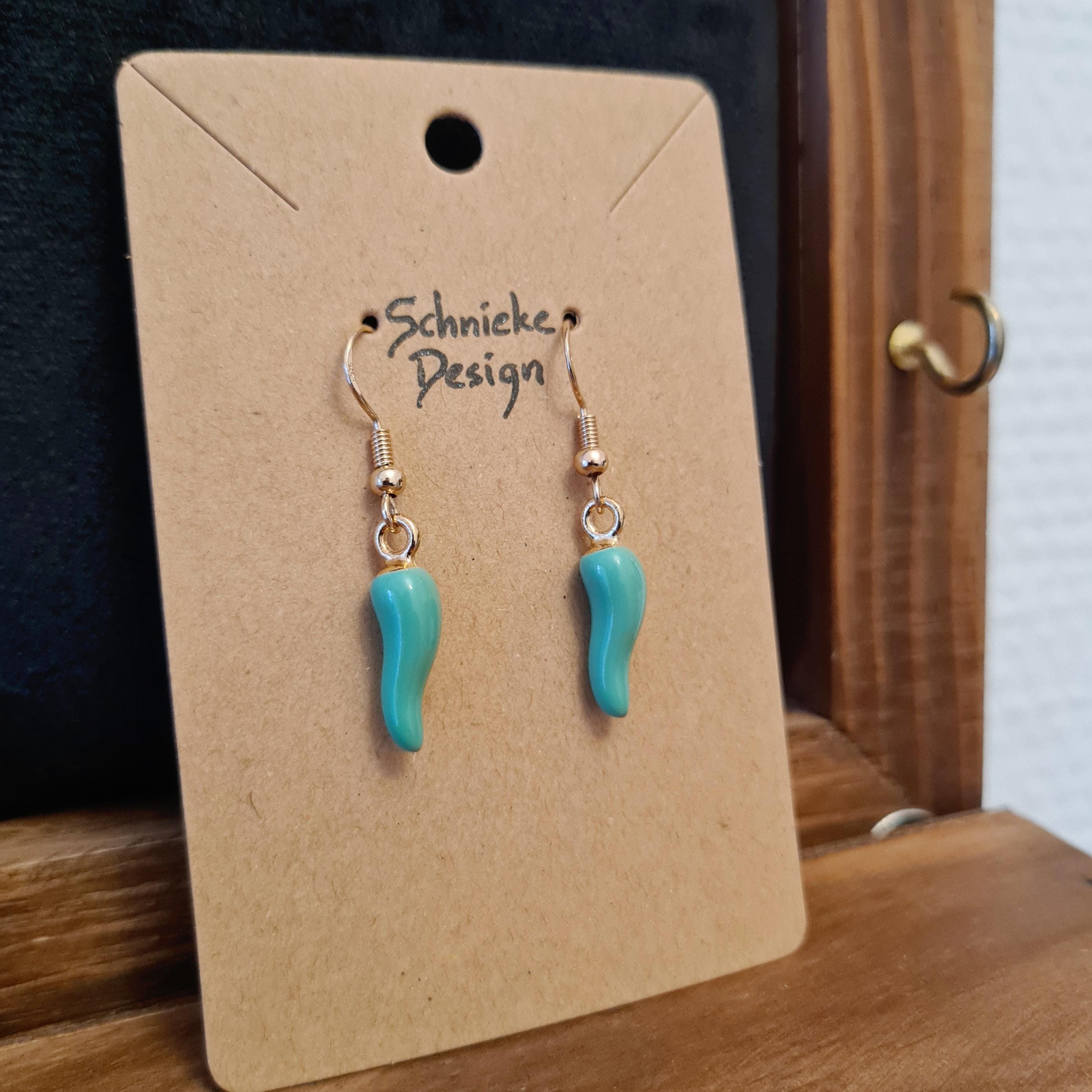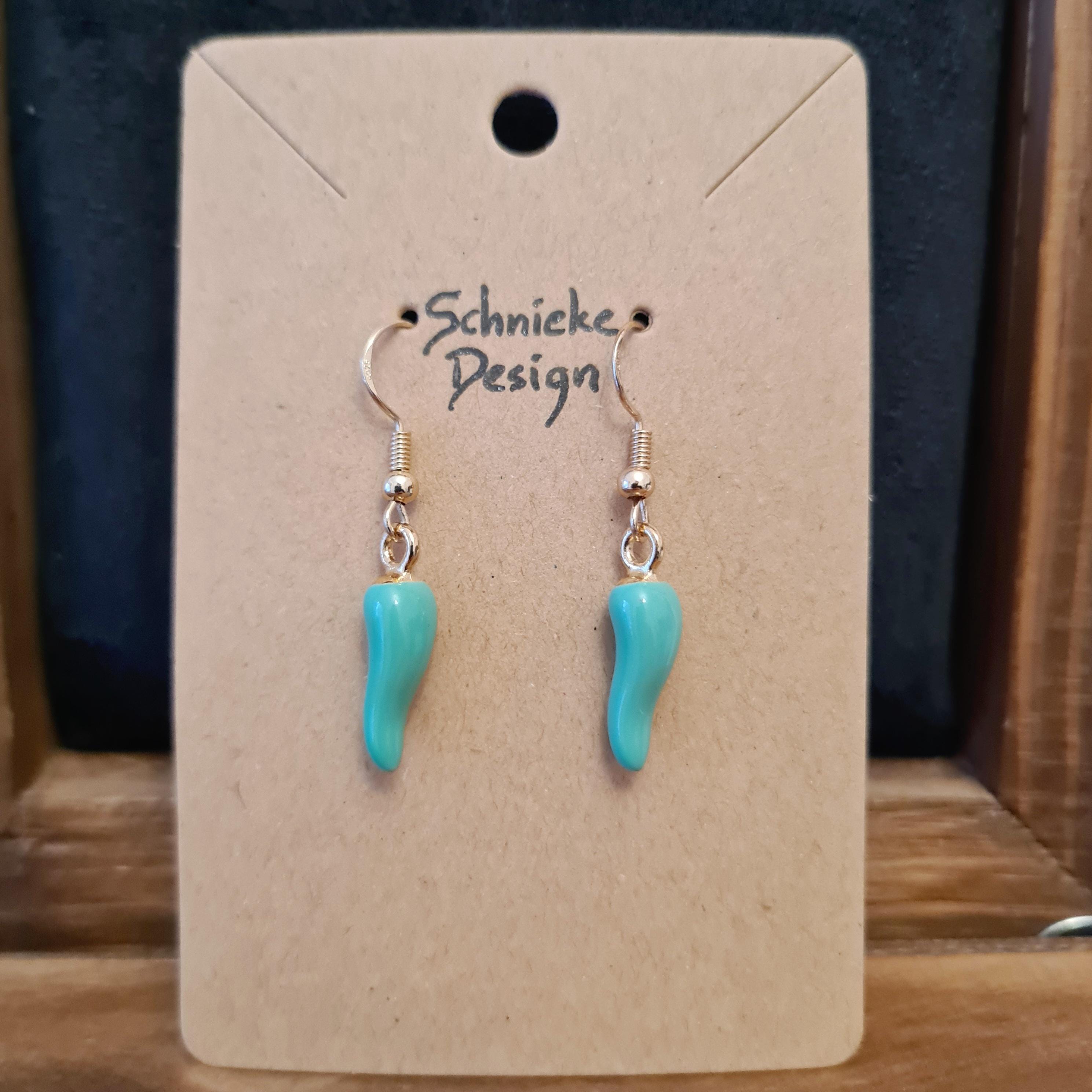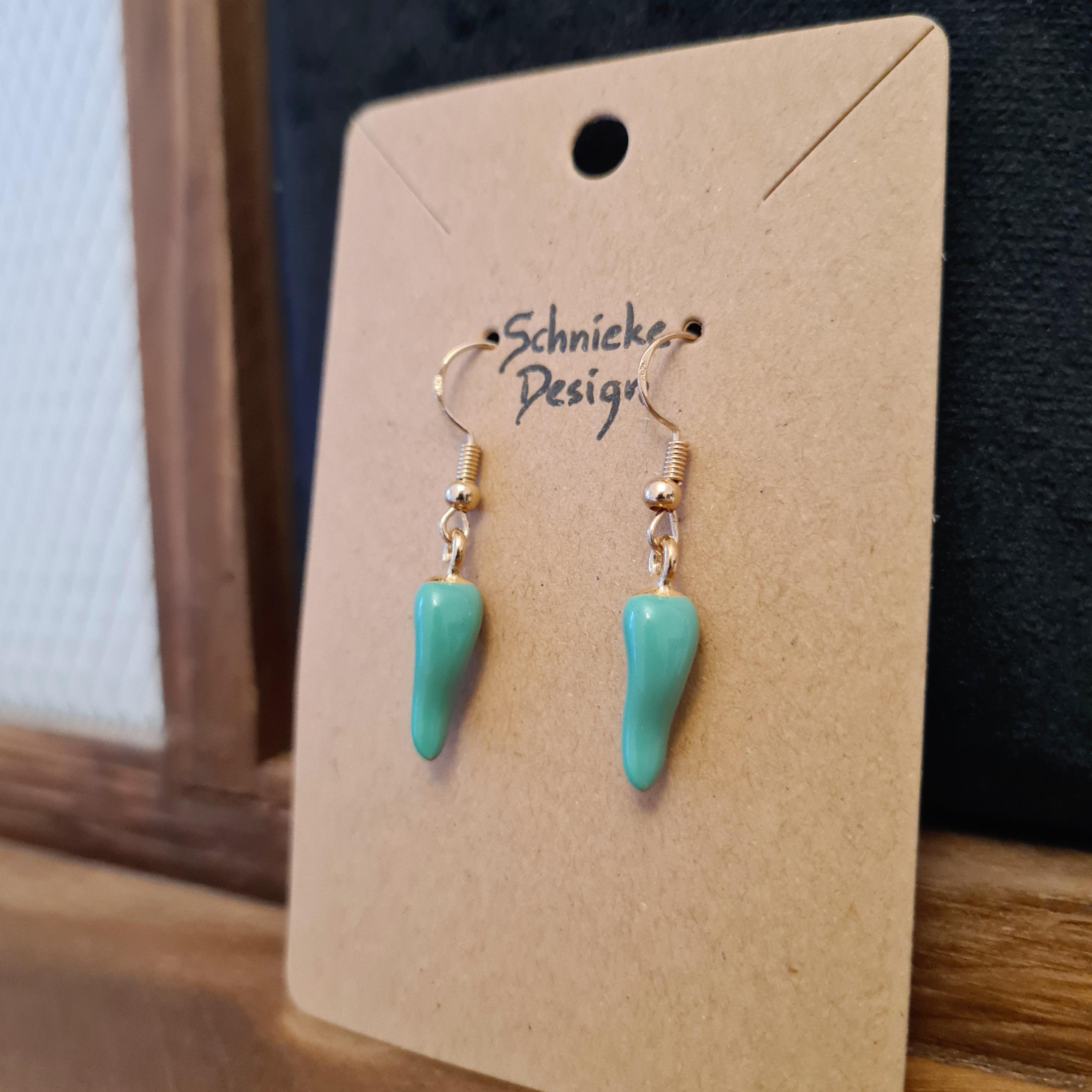 Green chili earrings made of enamel and copper.