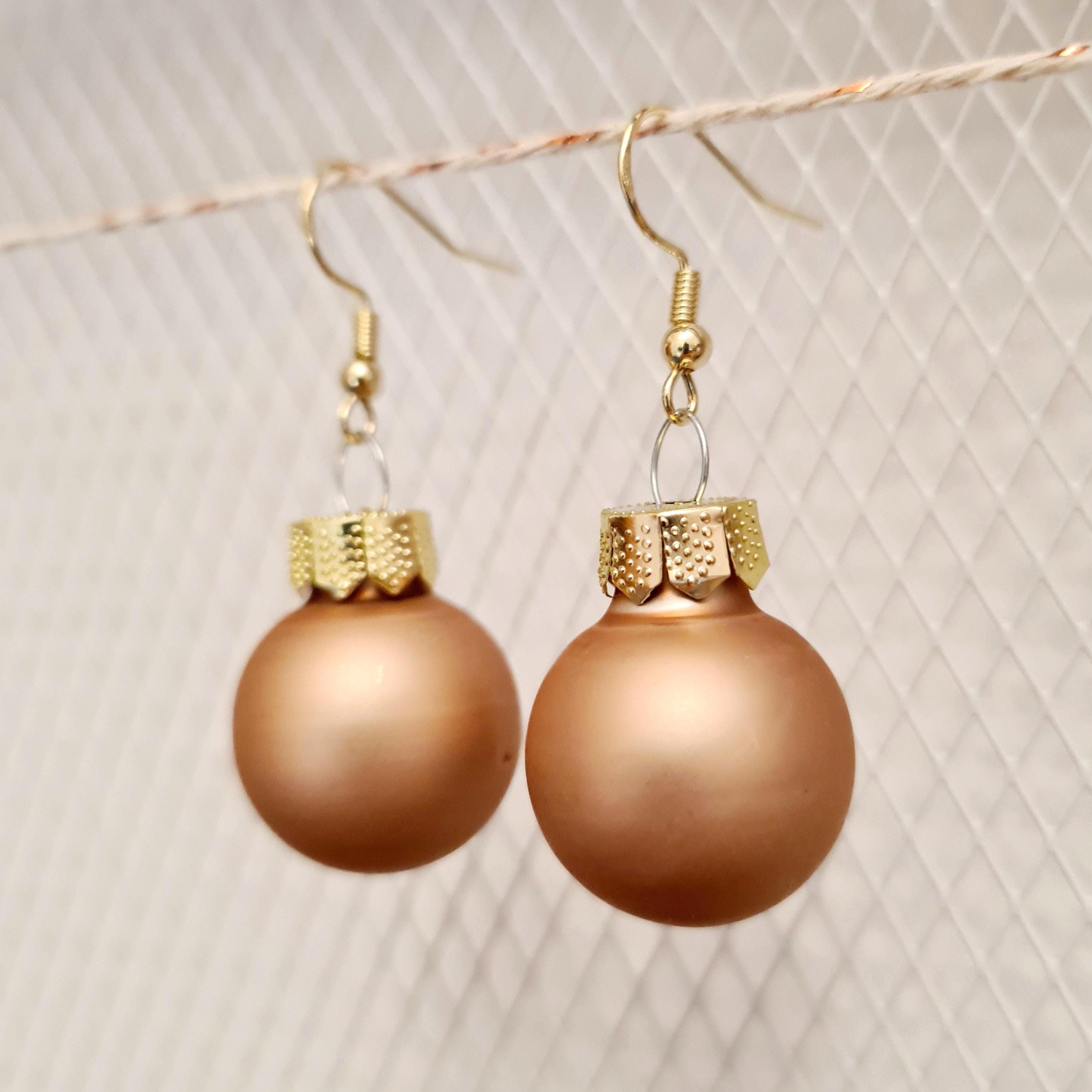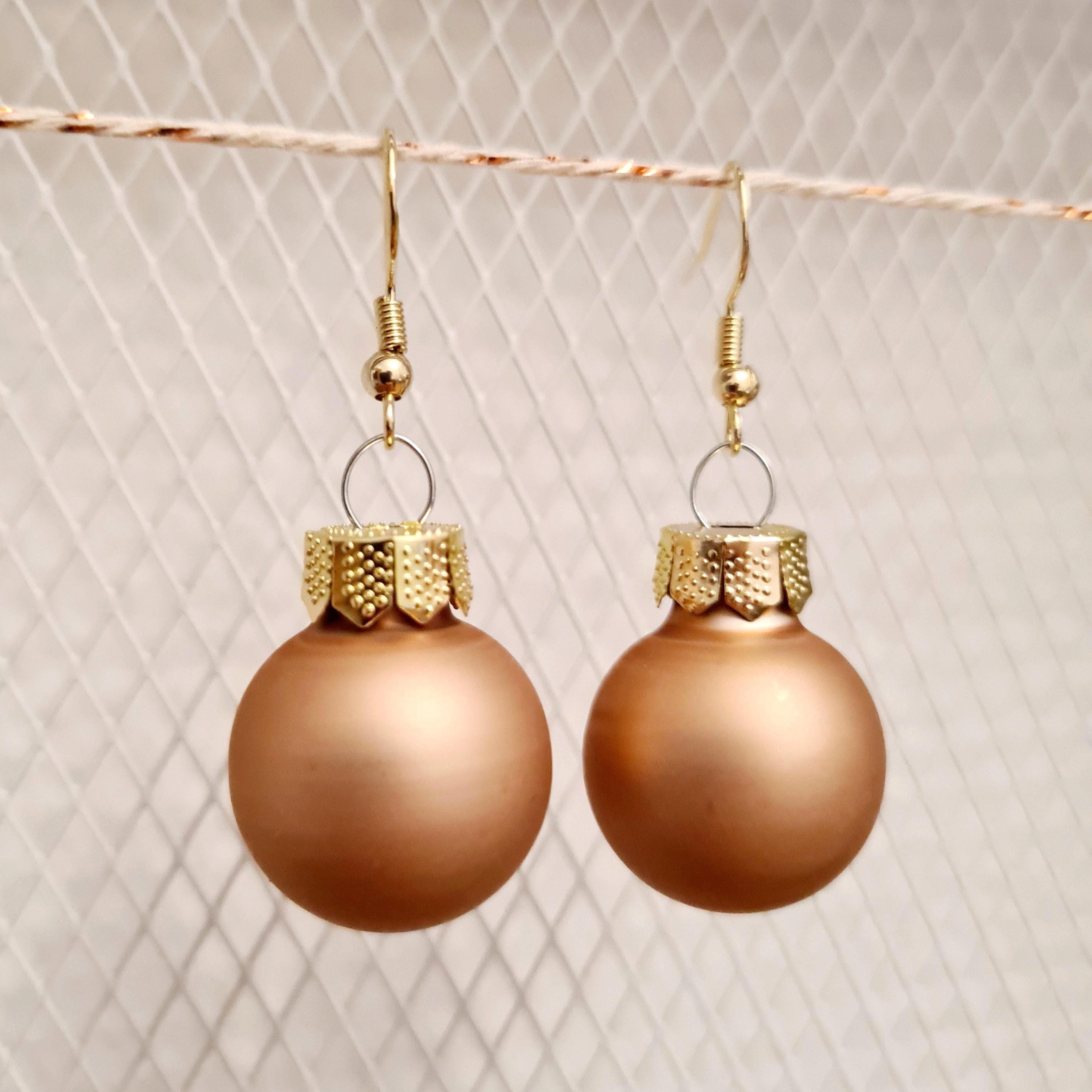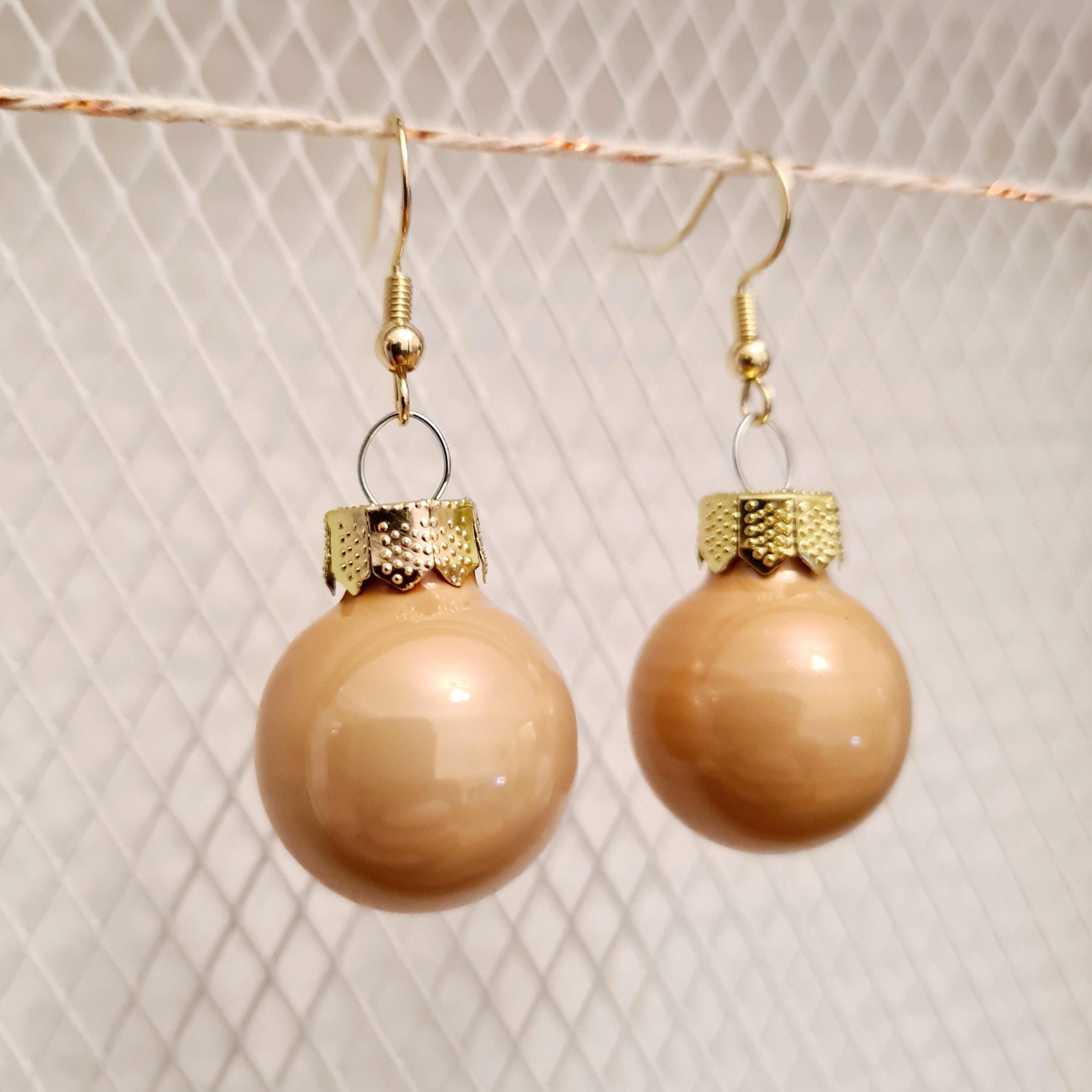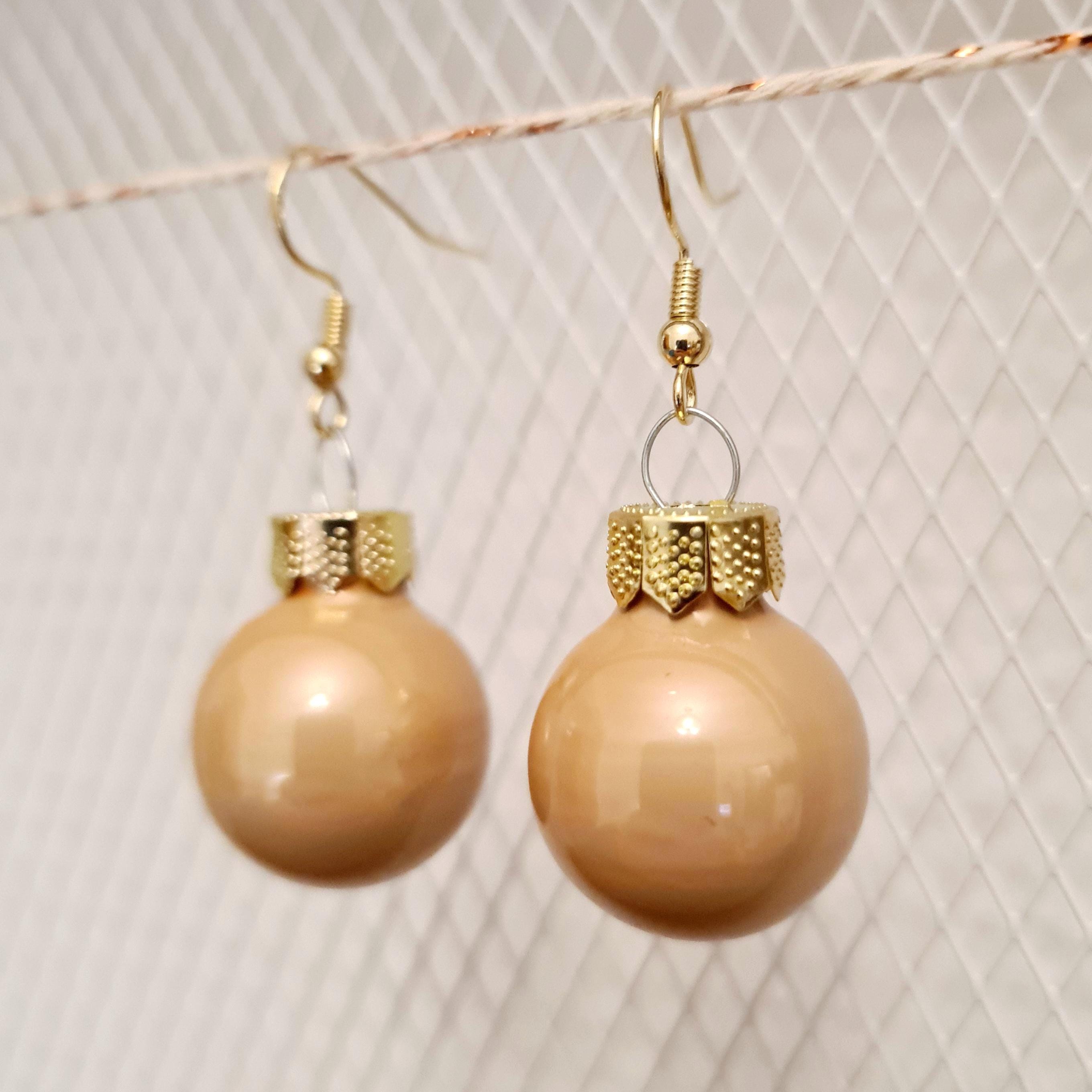 Christmas earrings with sand-colored Christmas tree baubles in matte or glossy finishes.