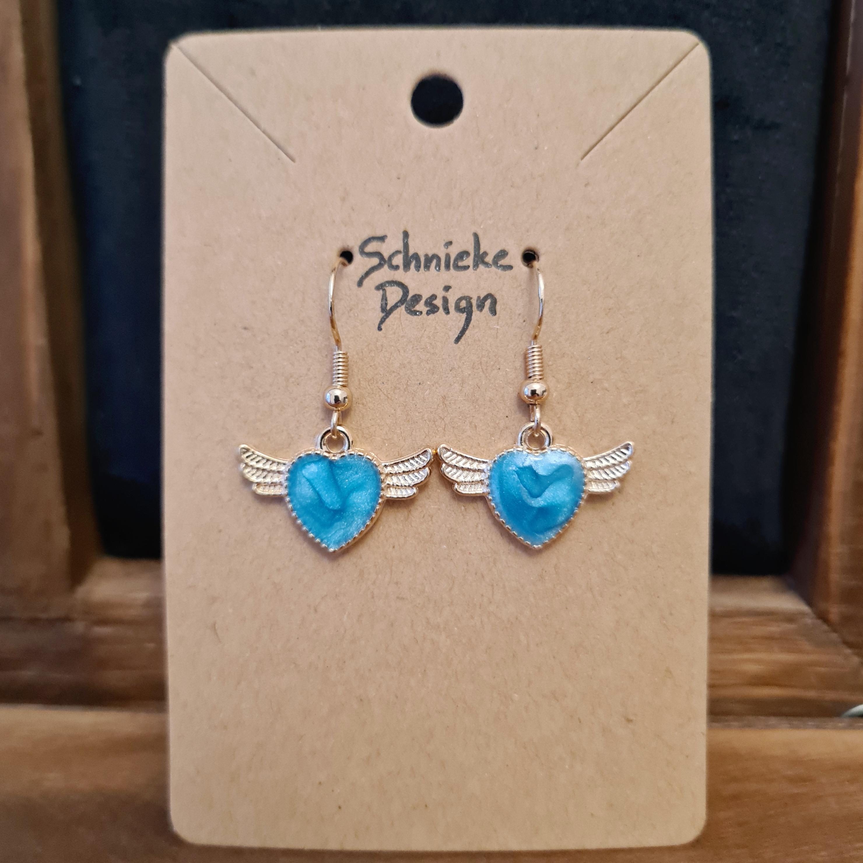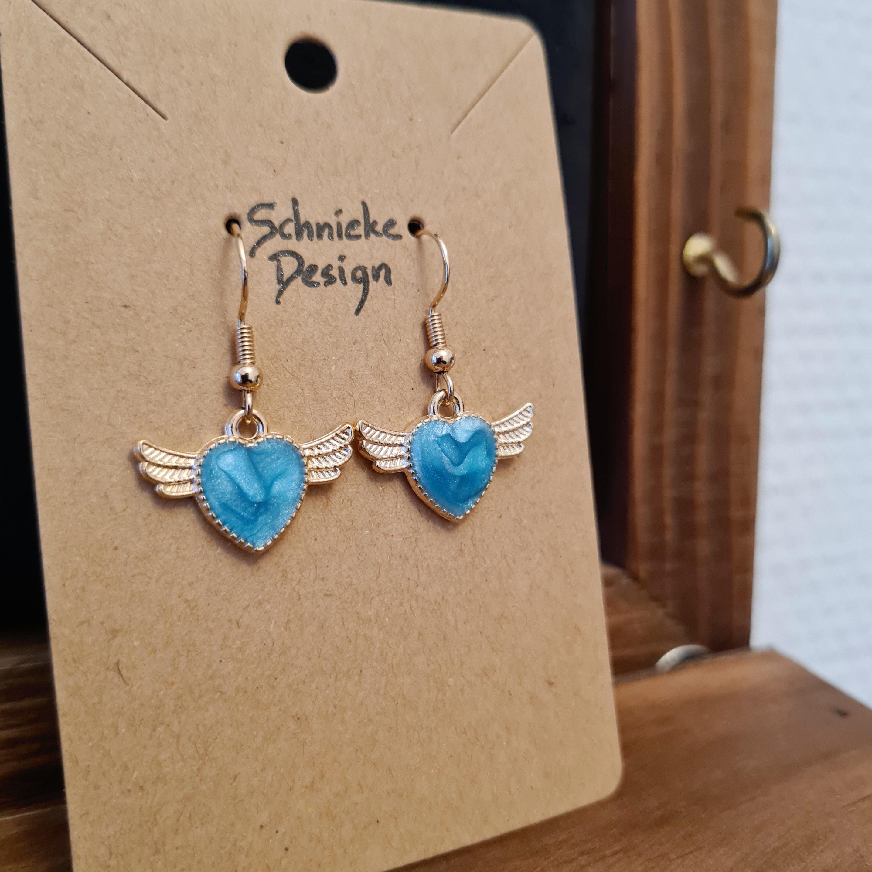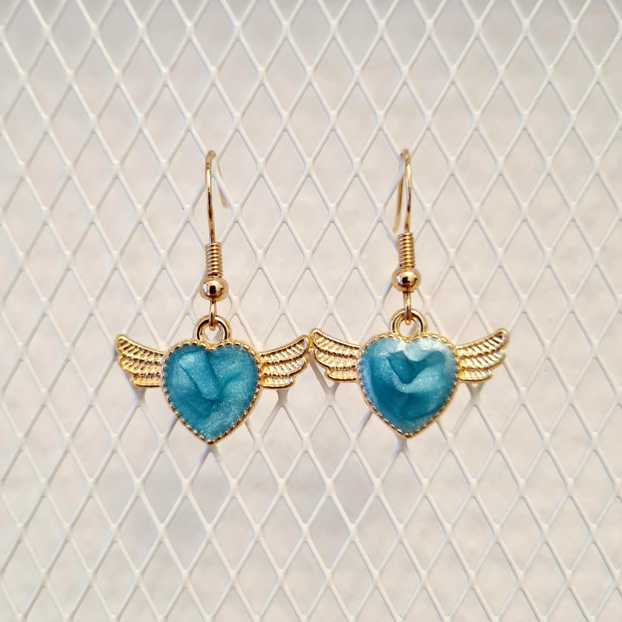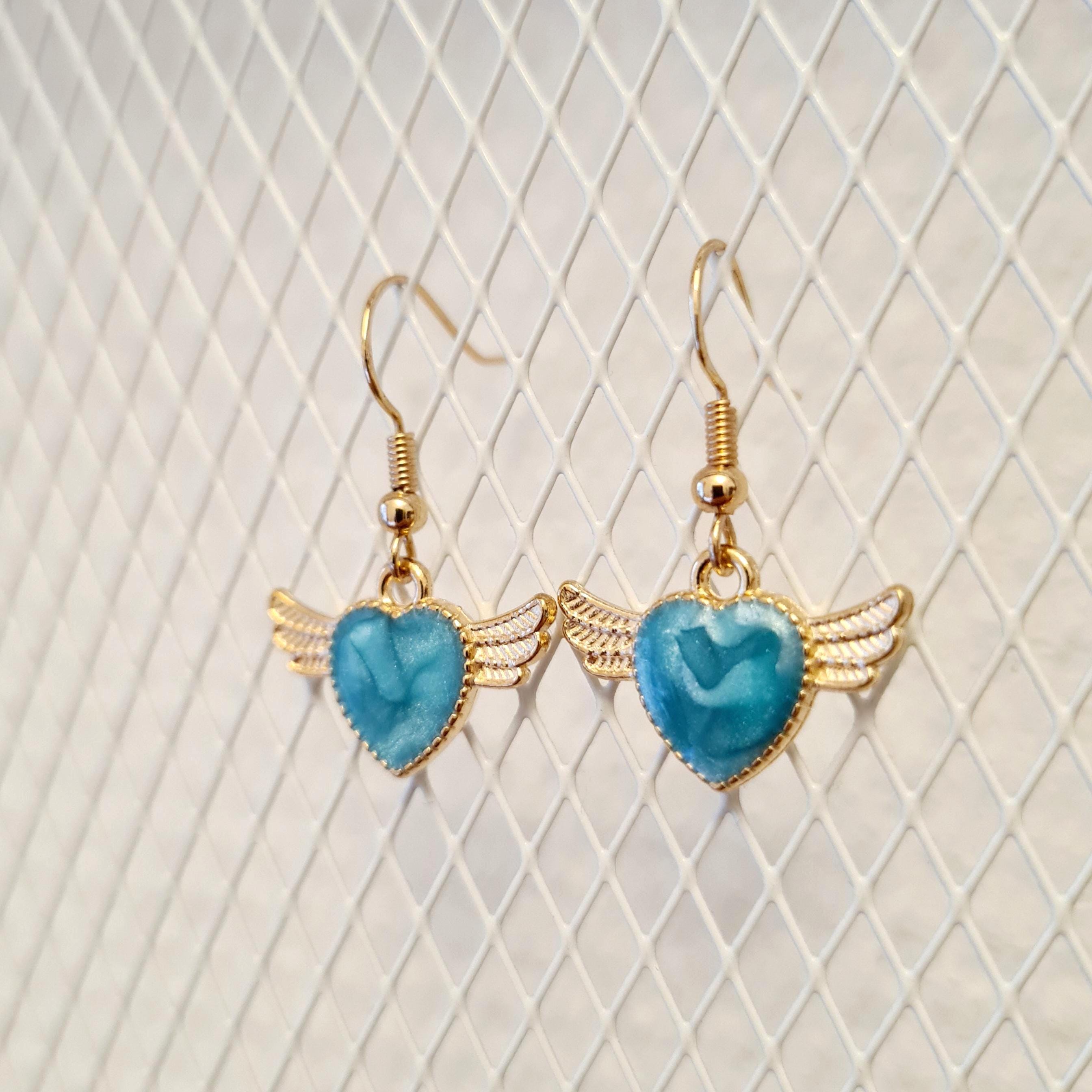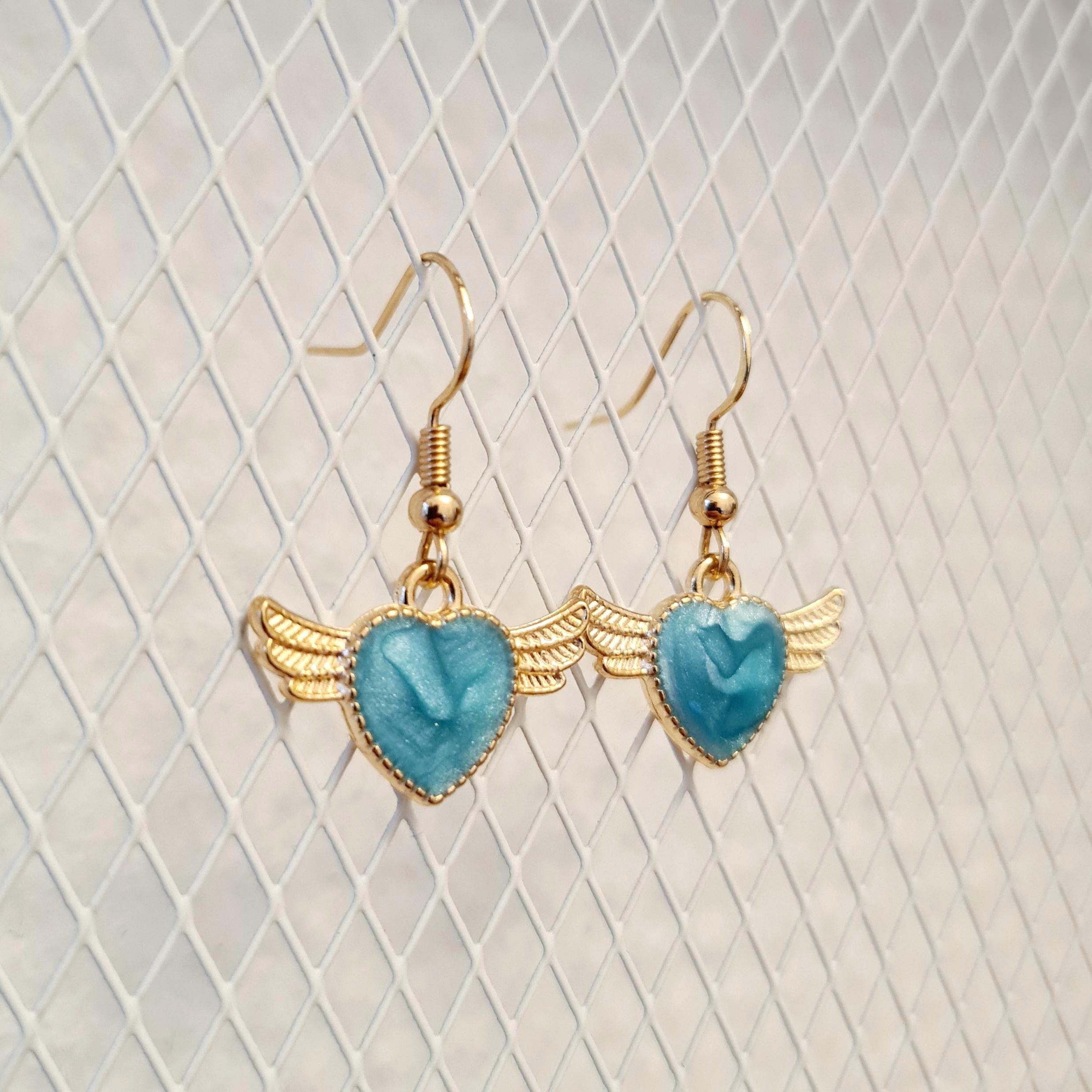 Earrings with small blue hearts with golden wings made of enamel and copper.