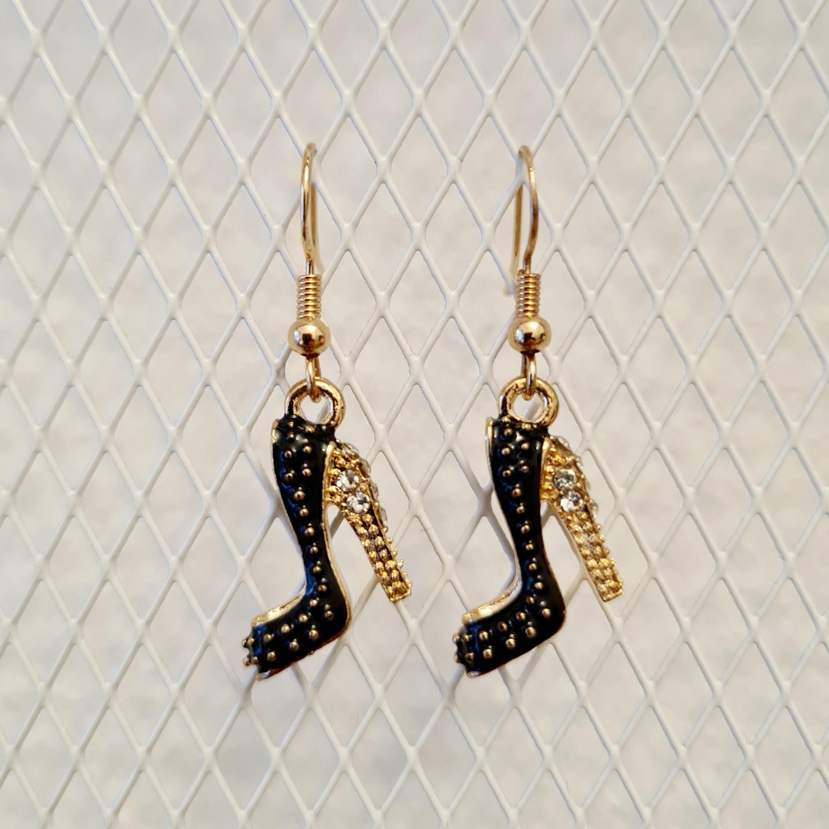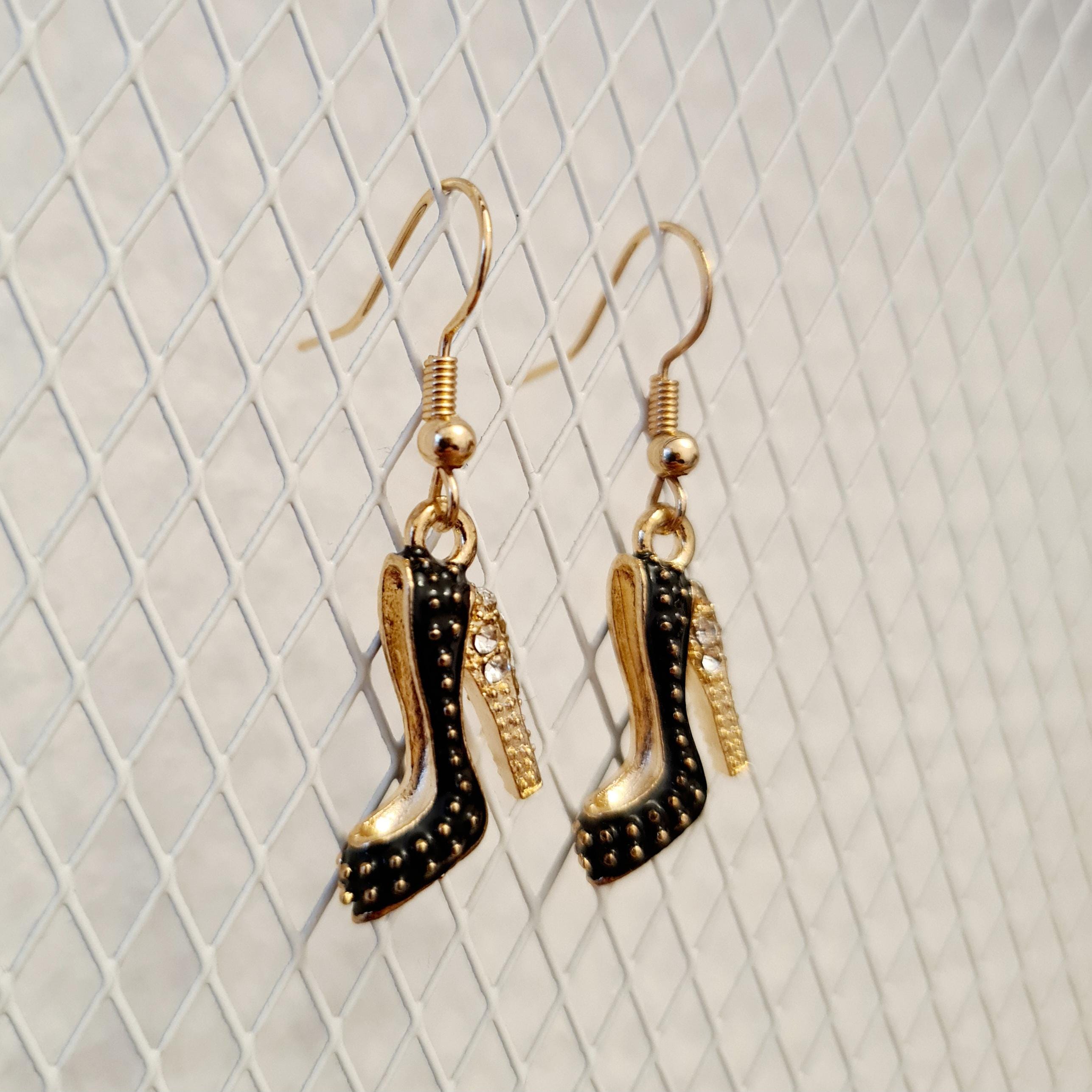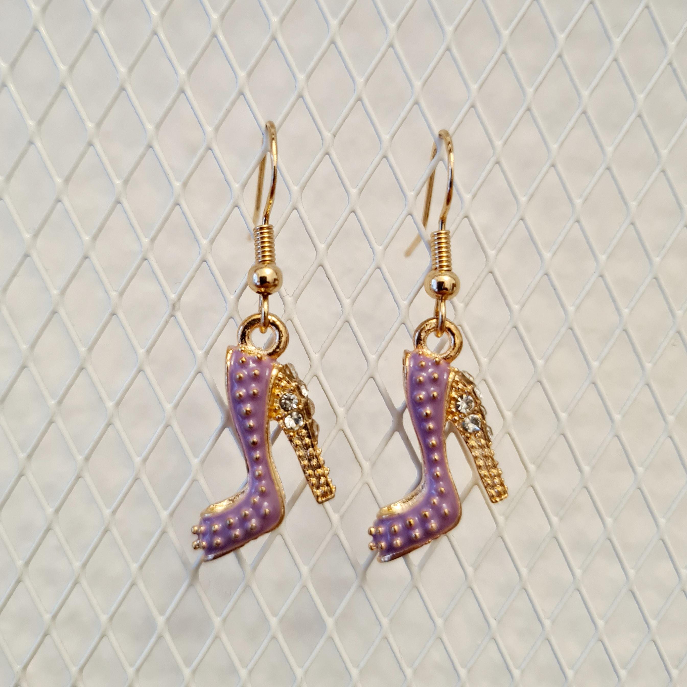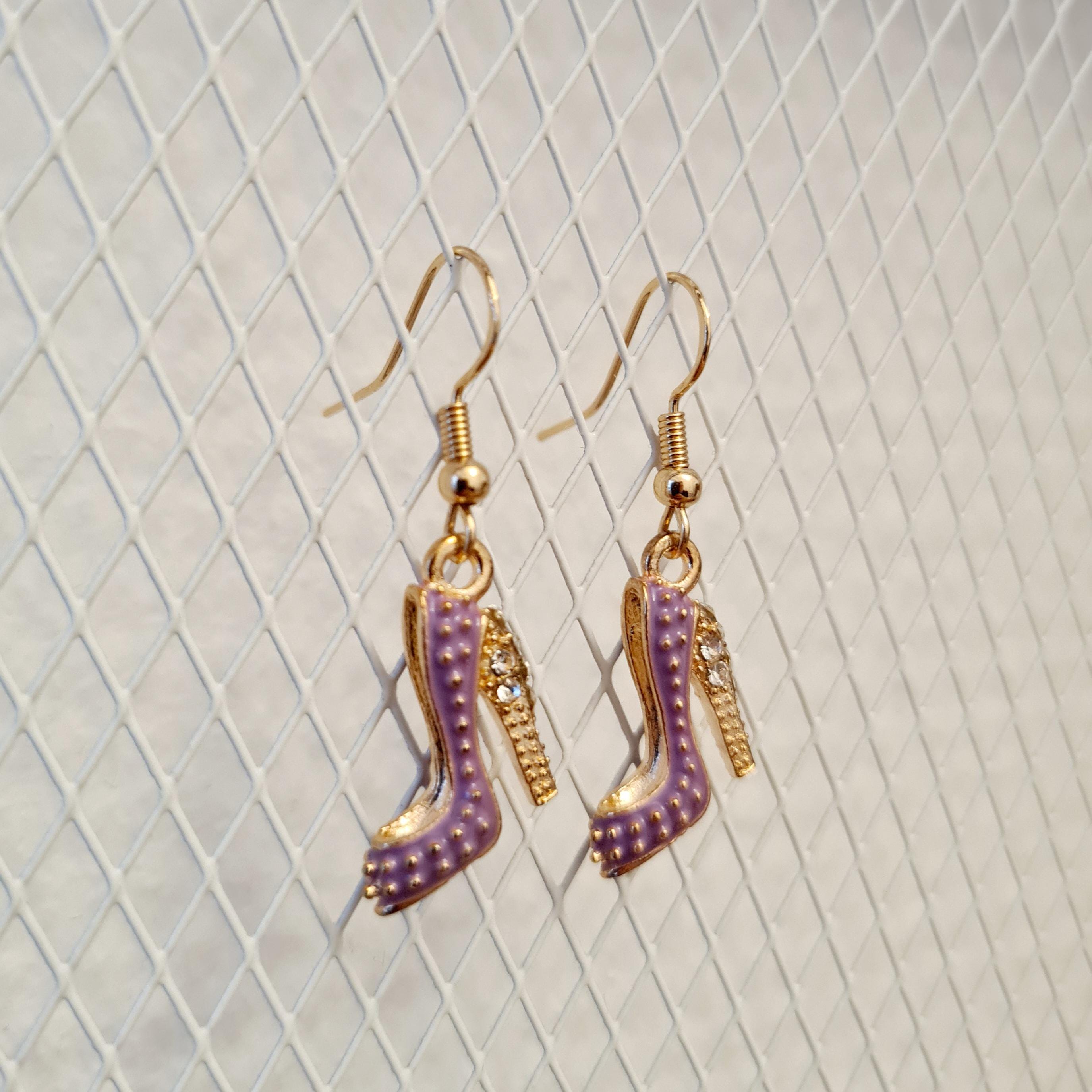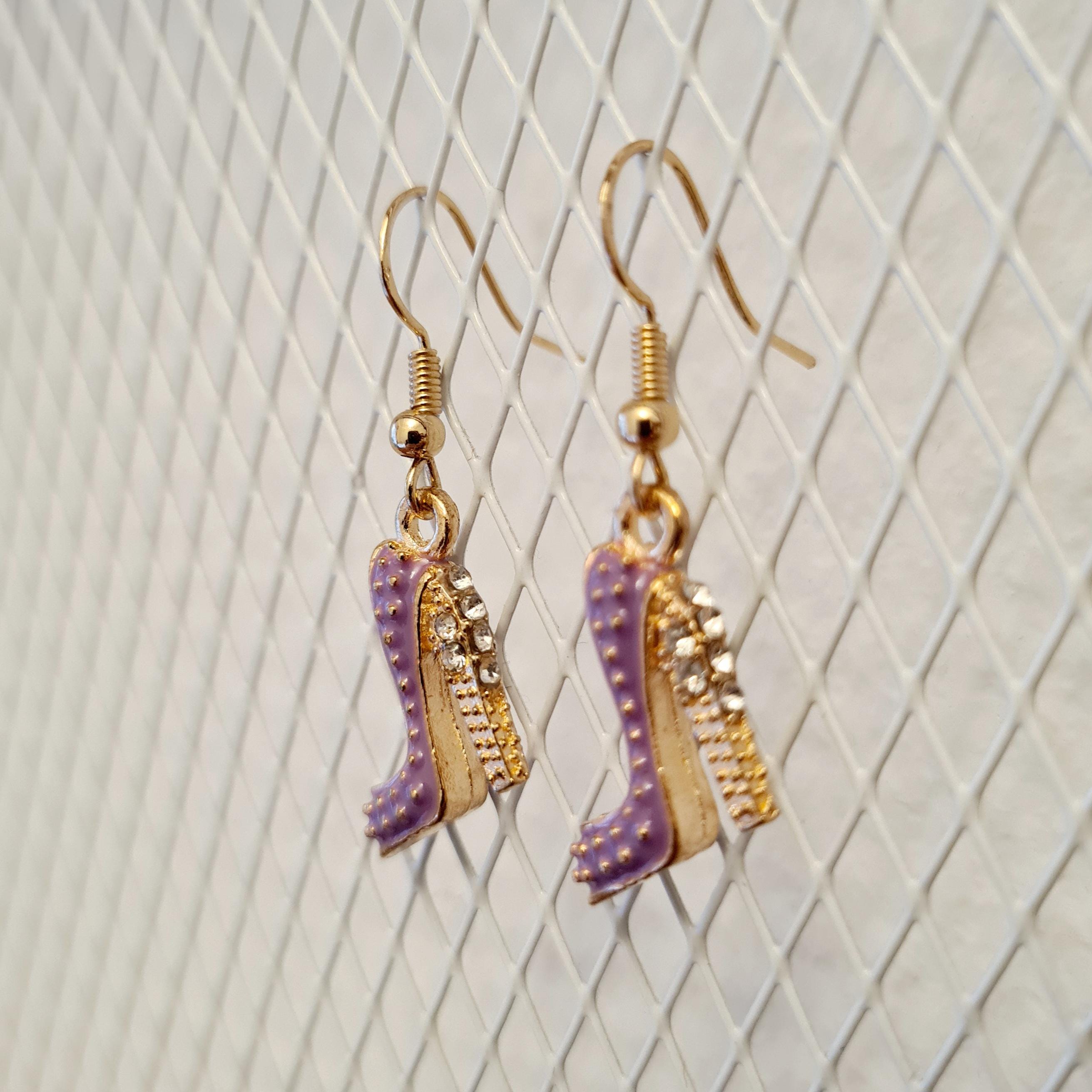 Enamel and copper high-heel earrings in black or purple with studs and rhinestones.