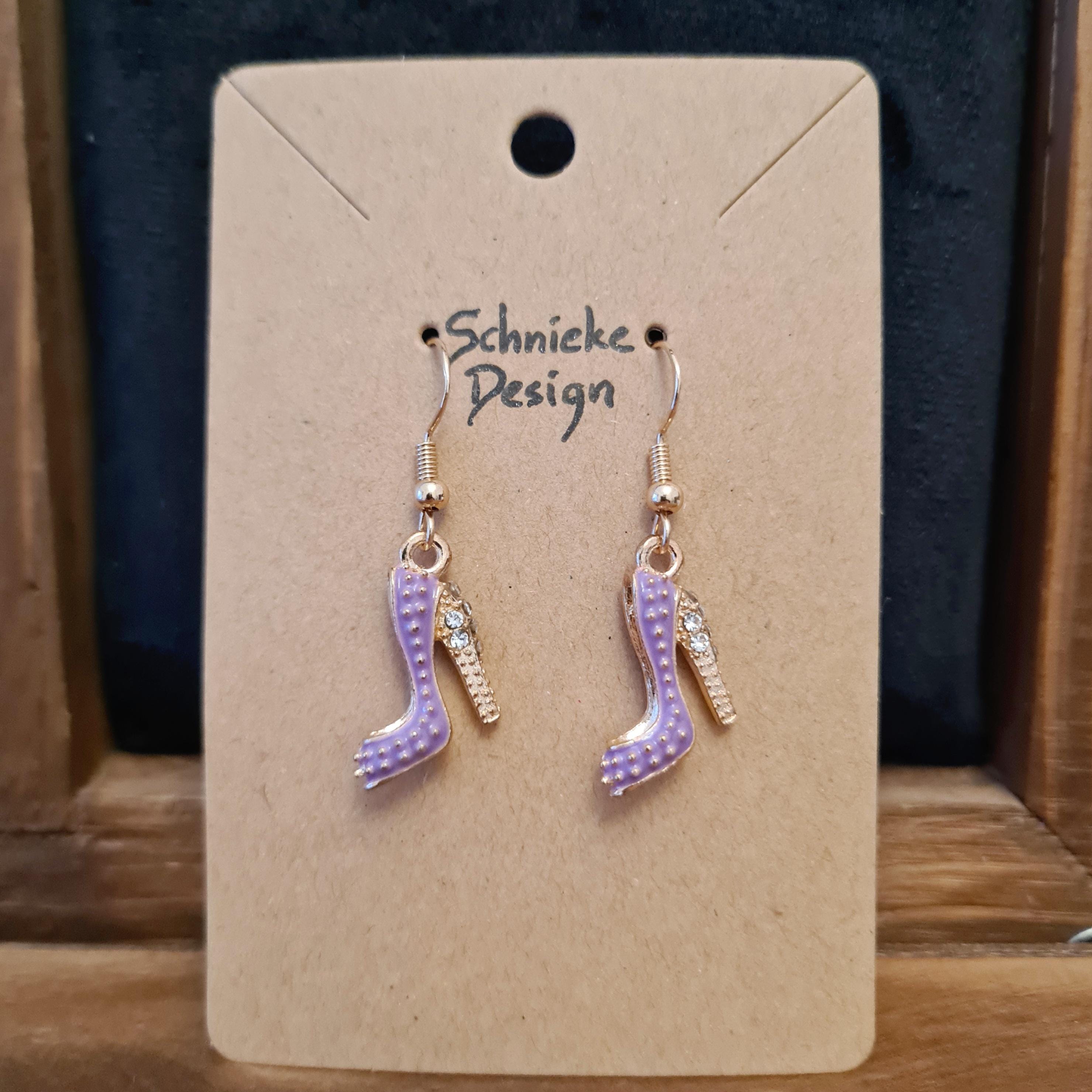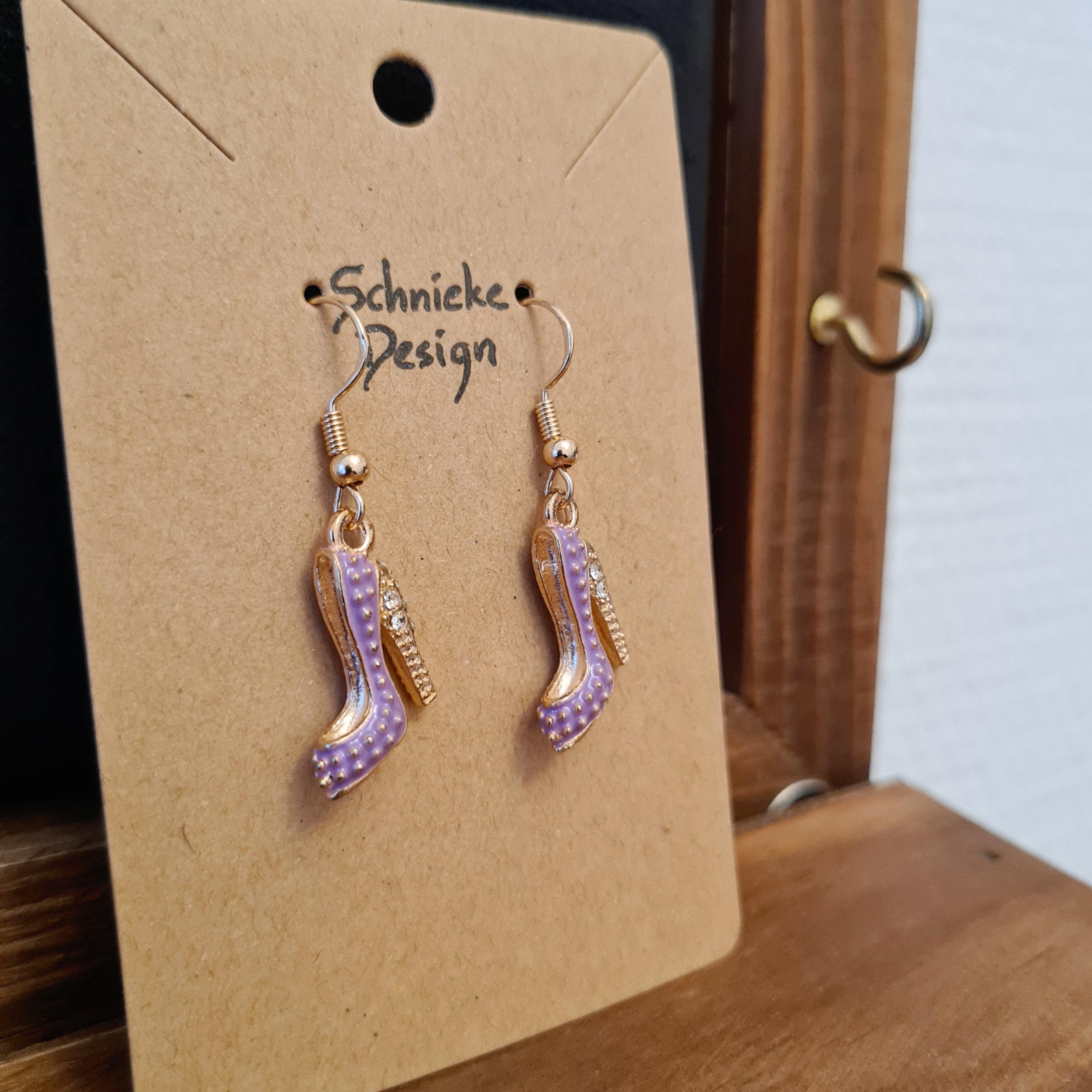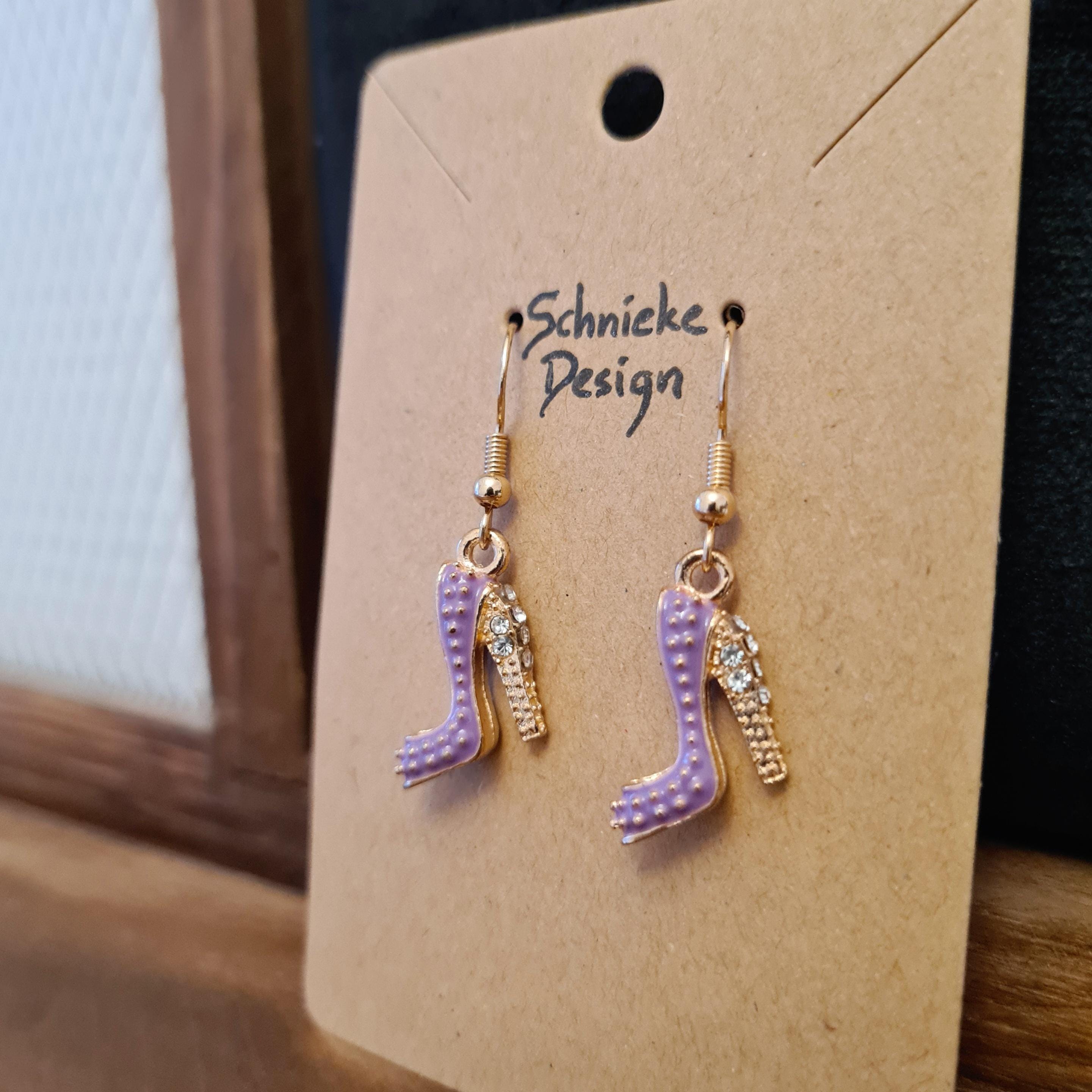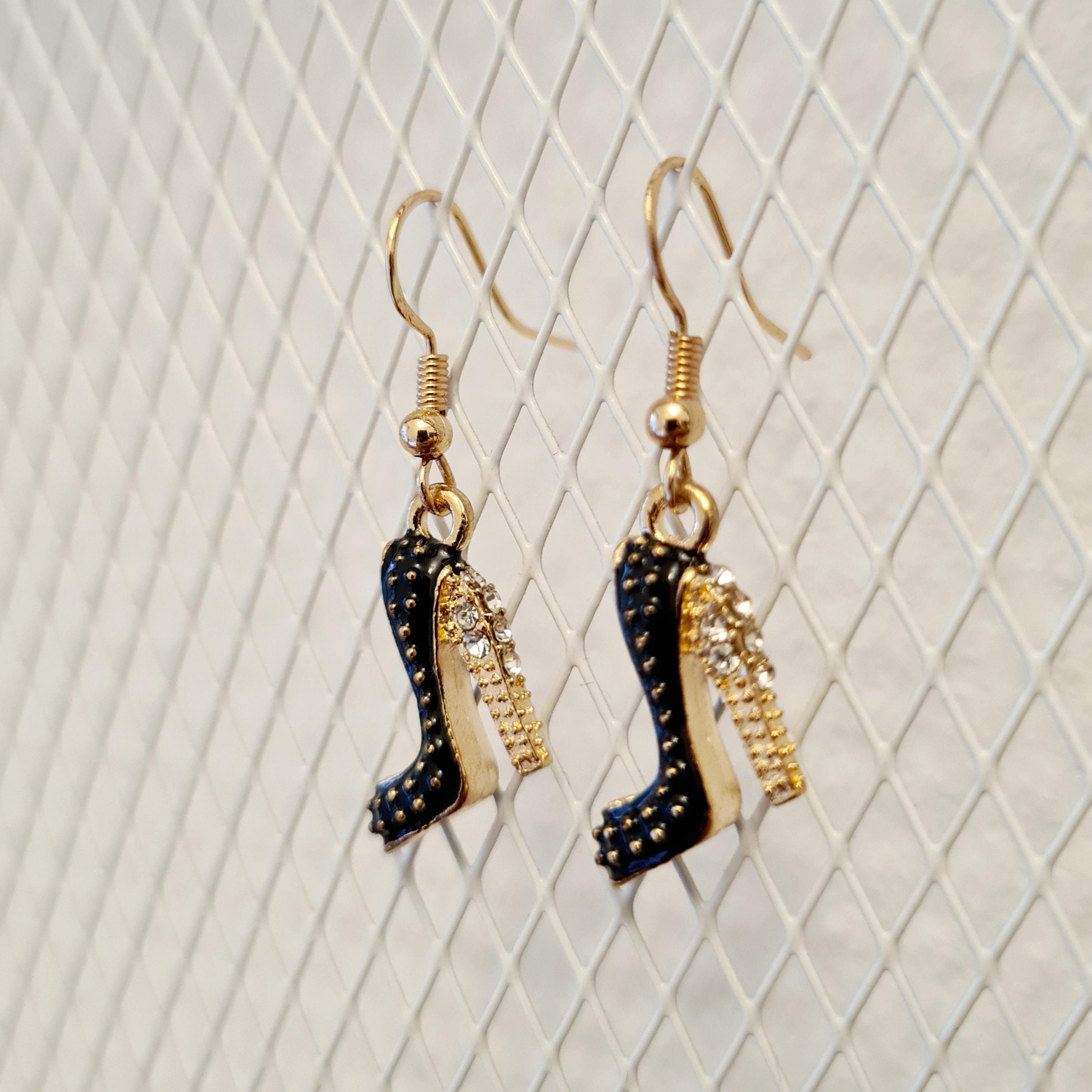 Enamel and copper high-heel earrings in black or purple with studs and rhinestones.