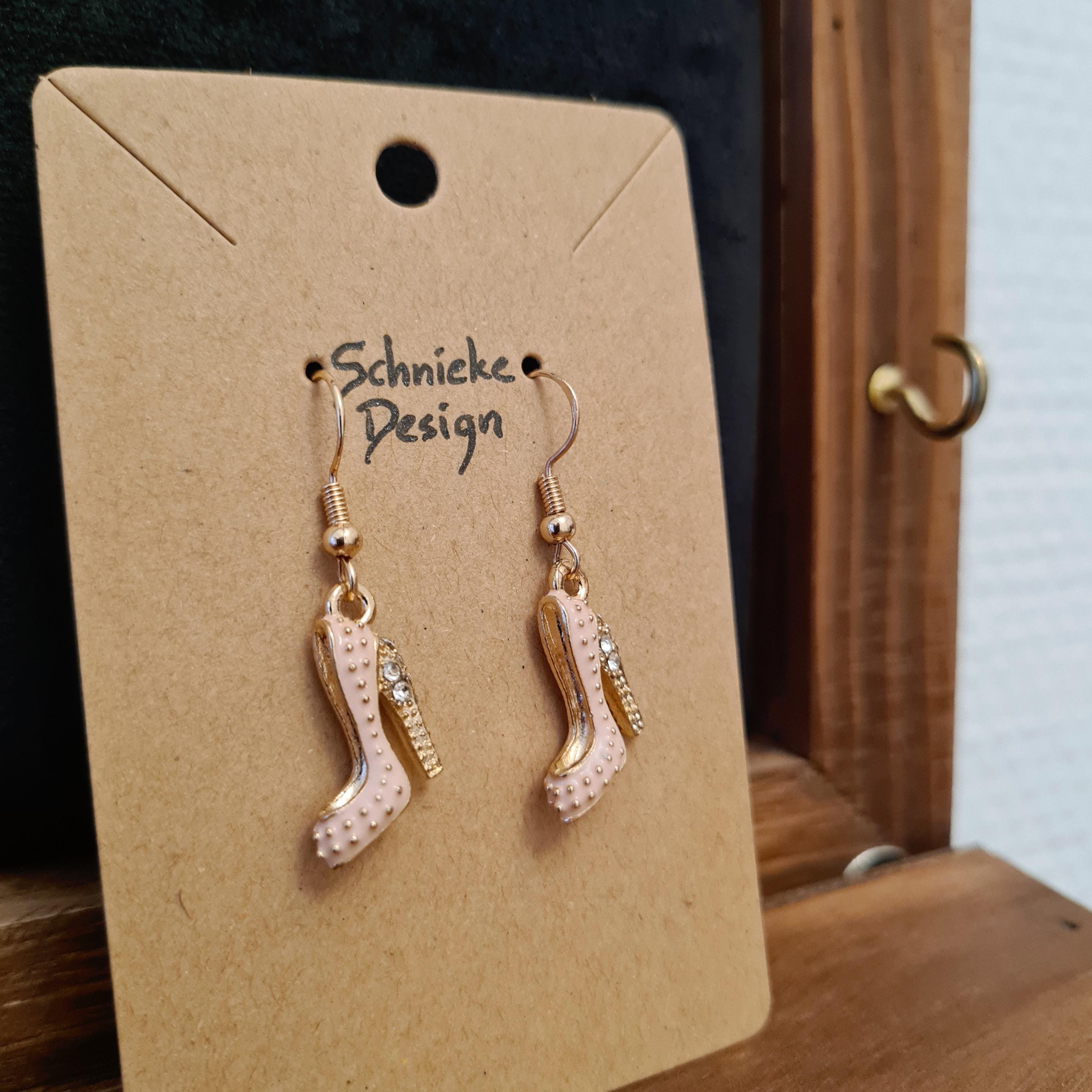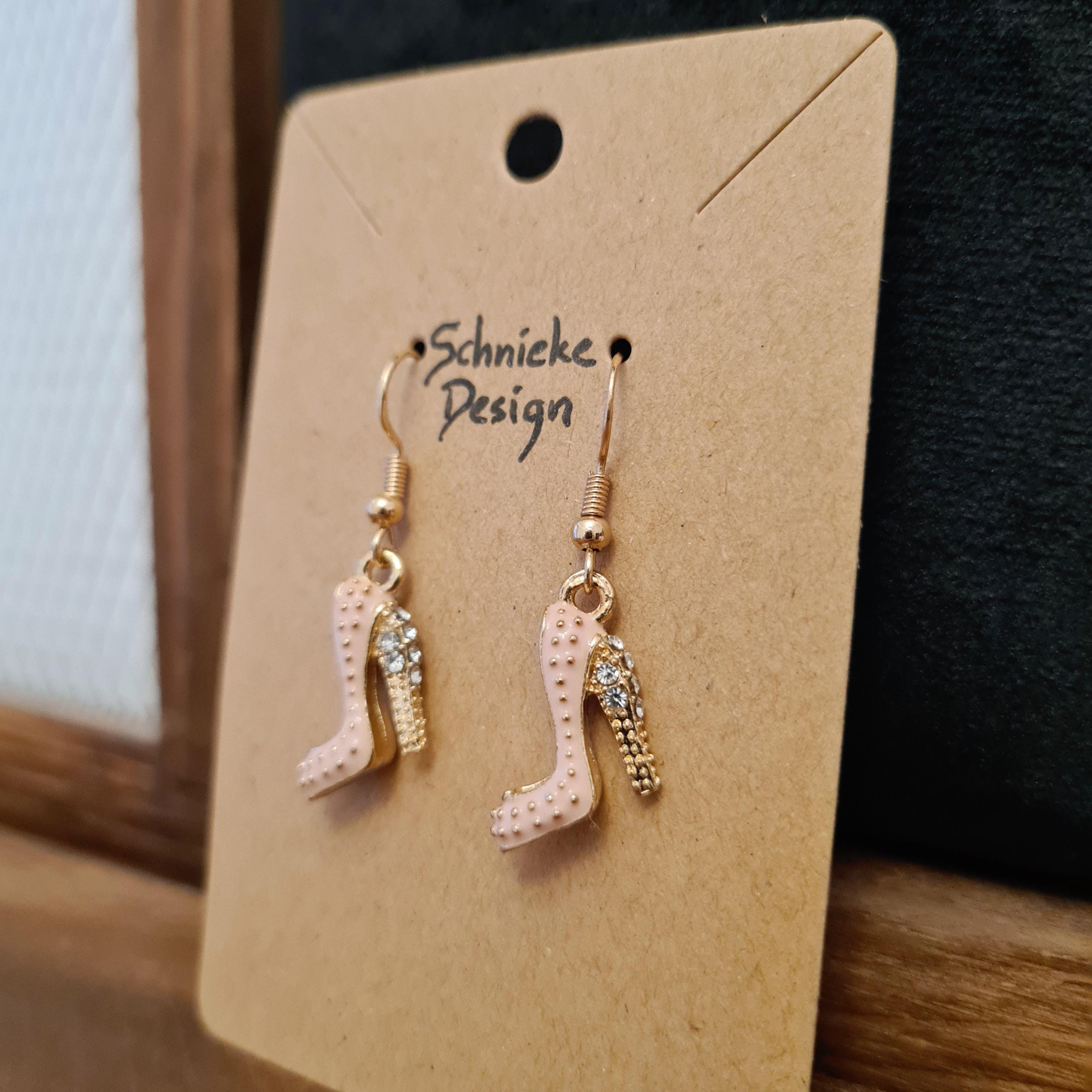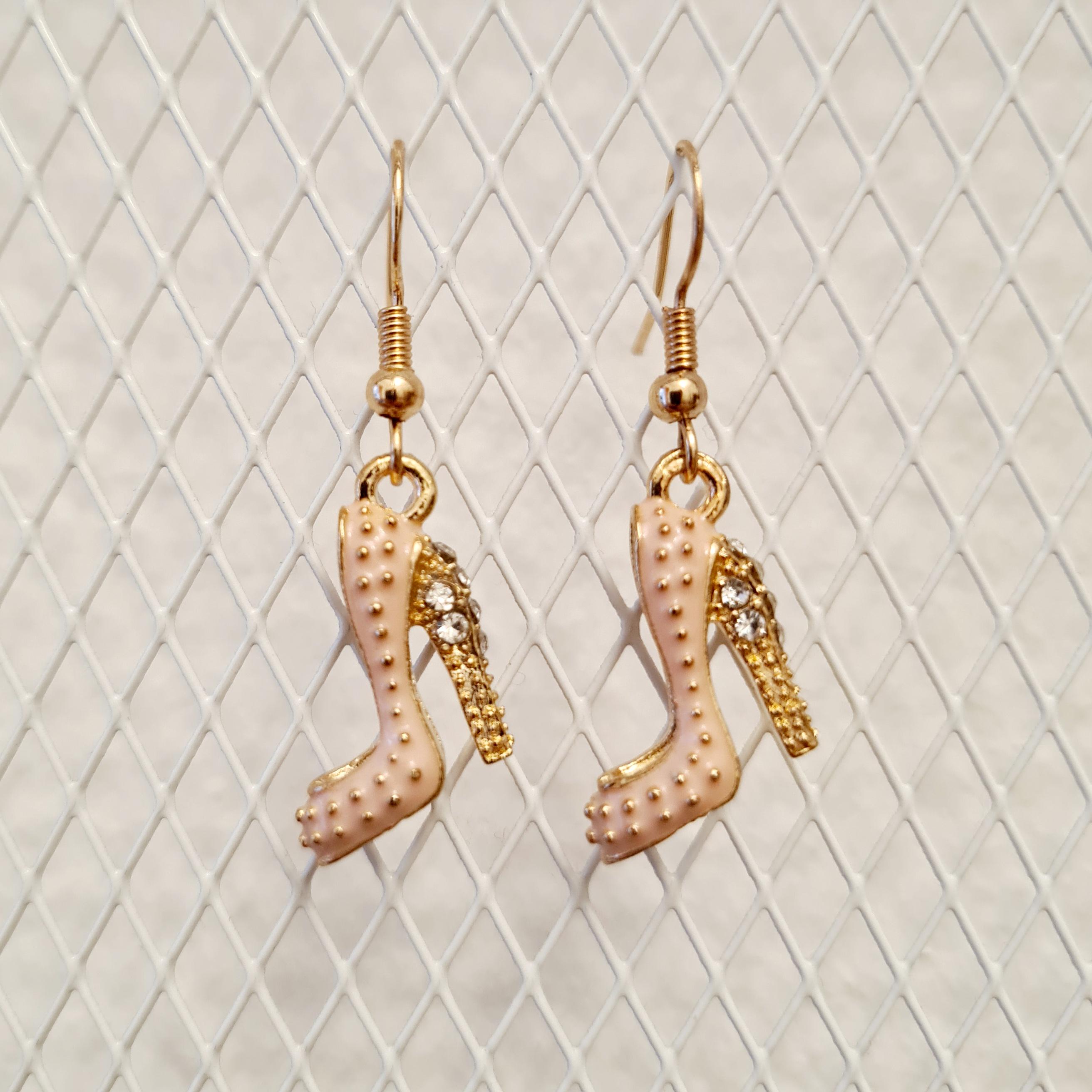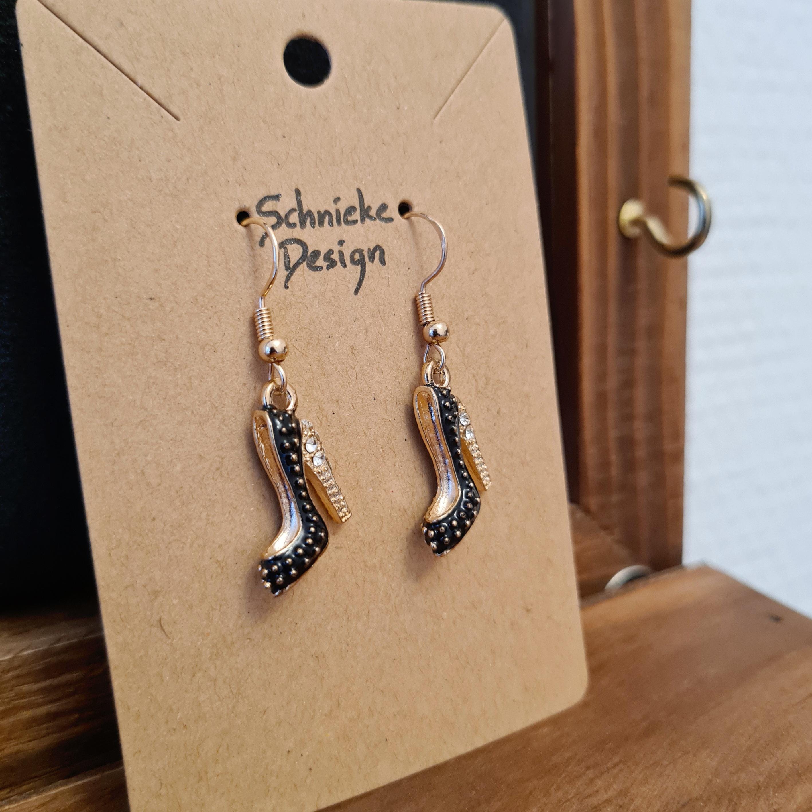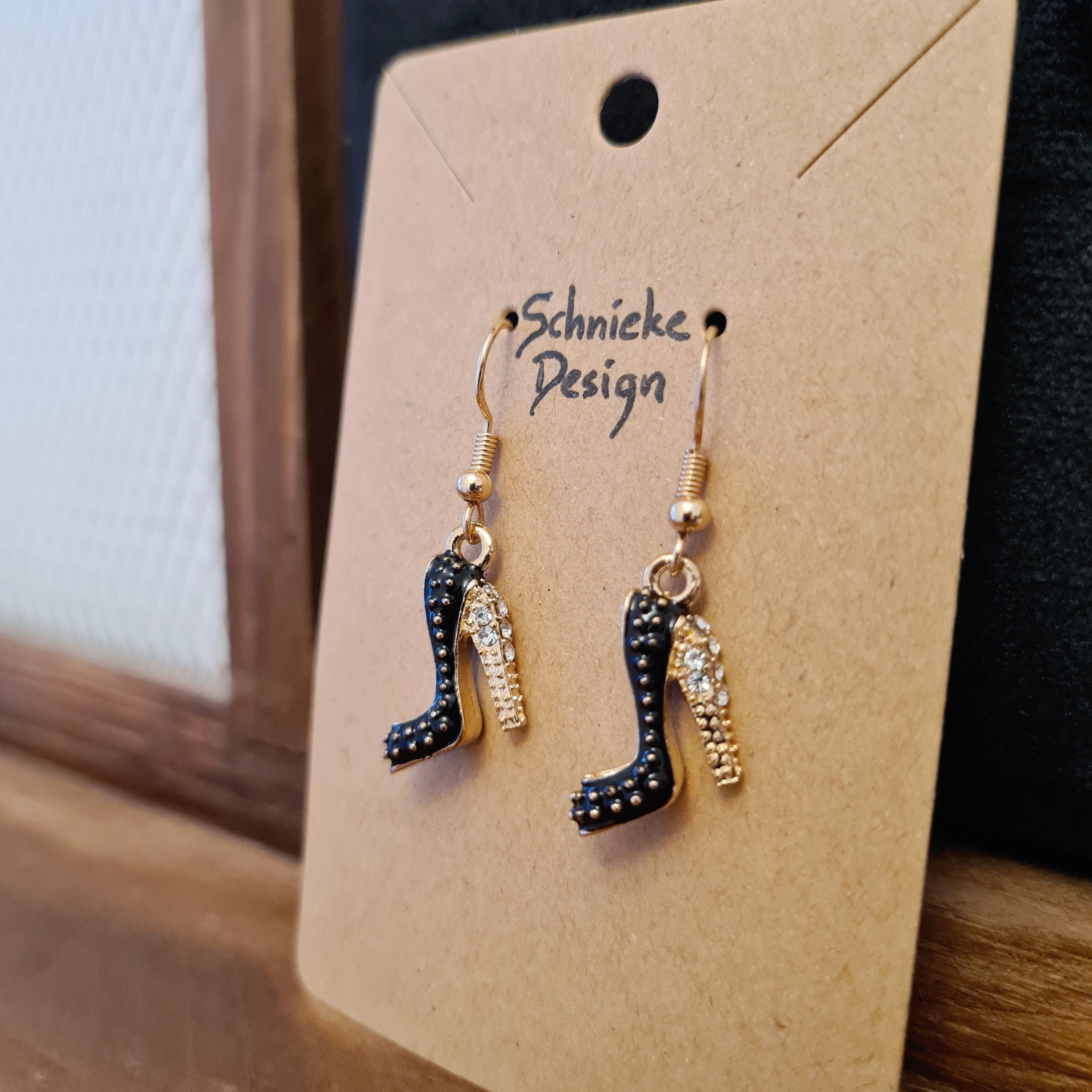 Enamel and copper high-heel earrings in black or purple with studs and rhinestones.