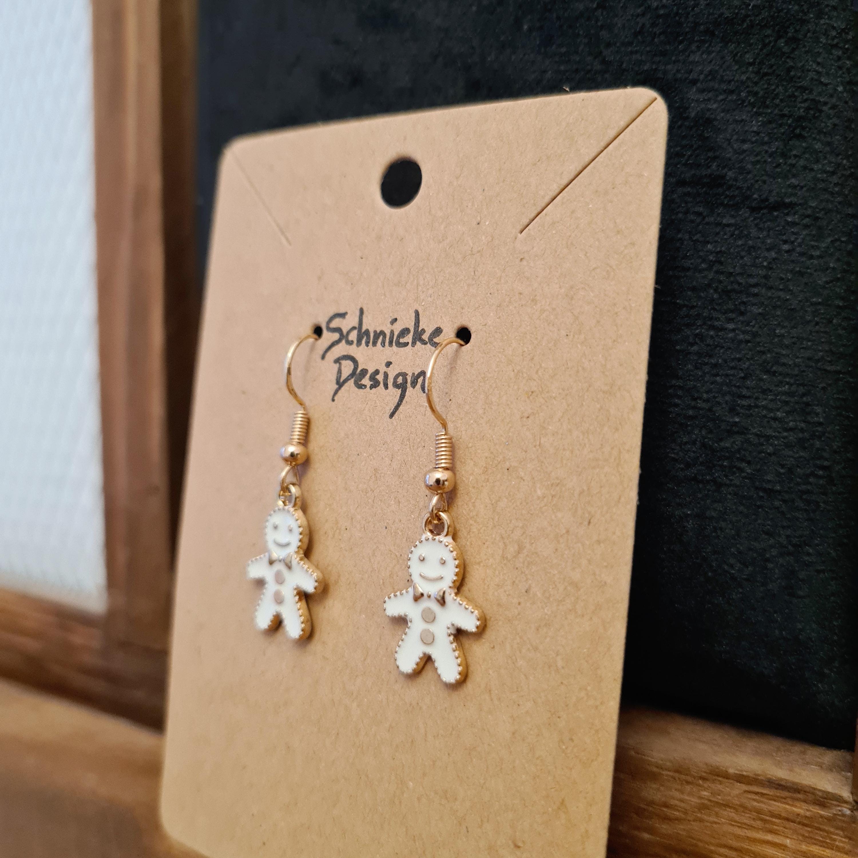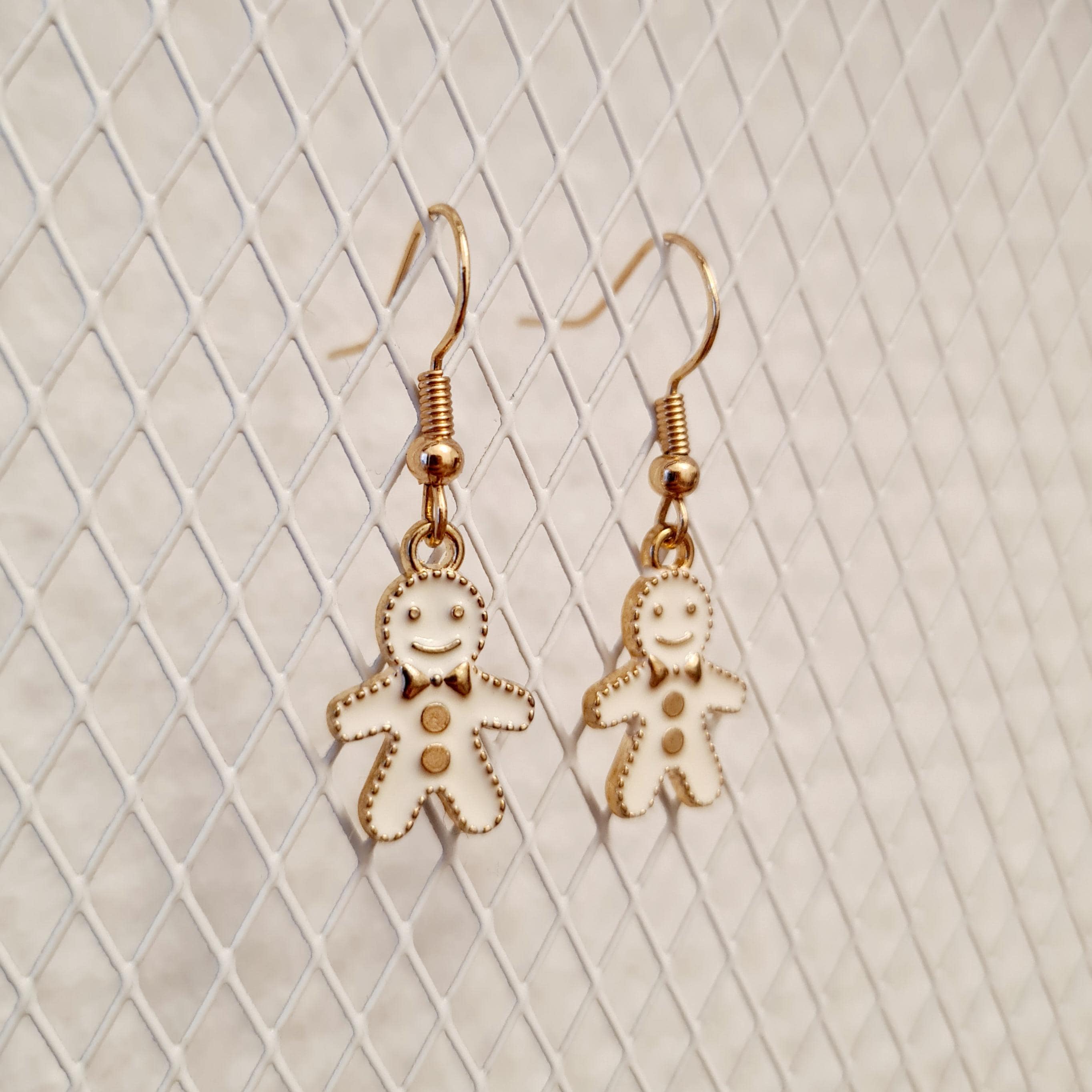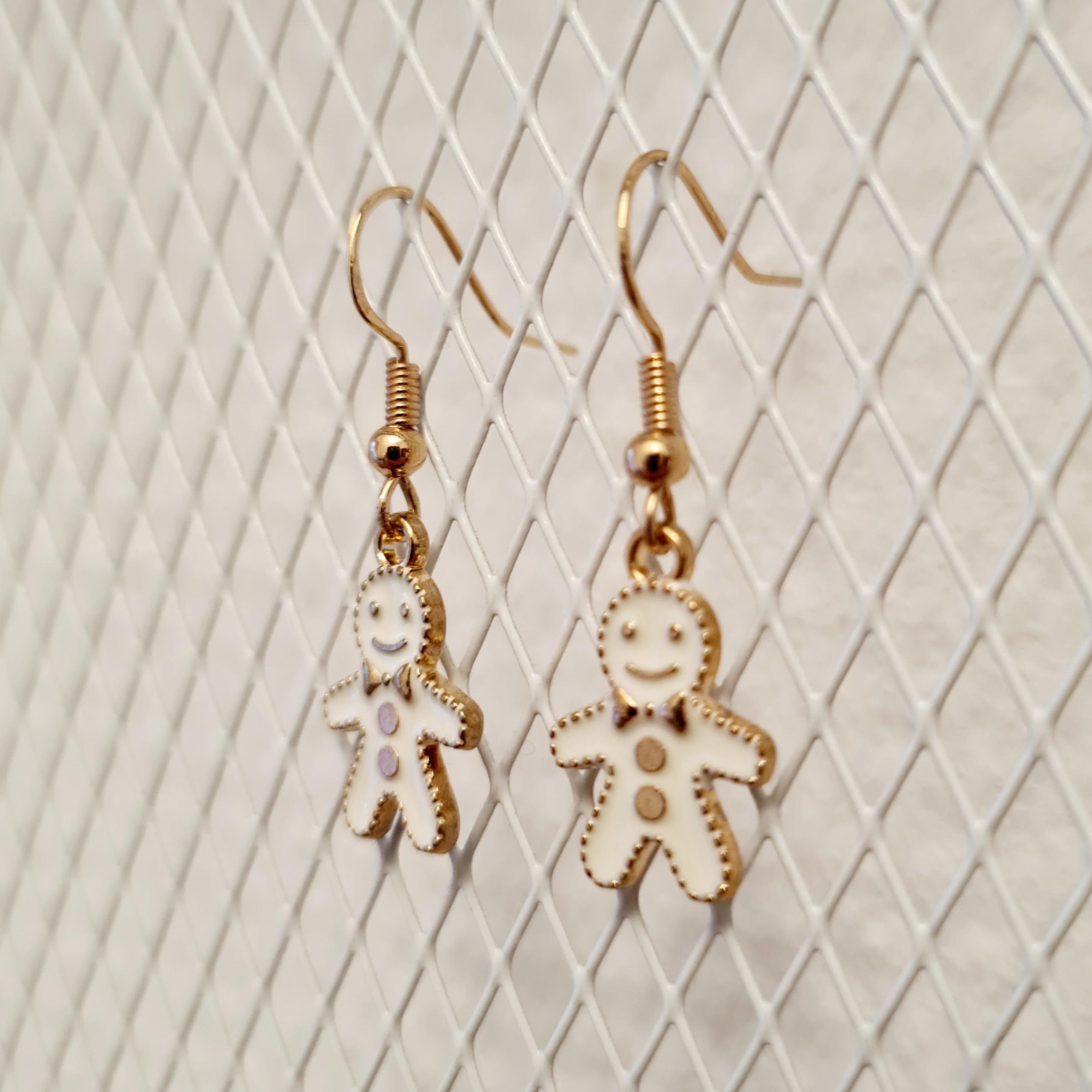 Earrings with small, cute gingerbread men in white and gold.