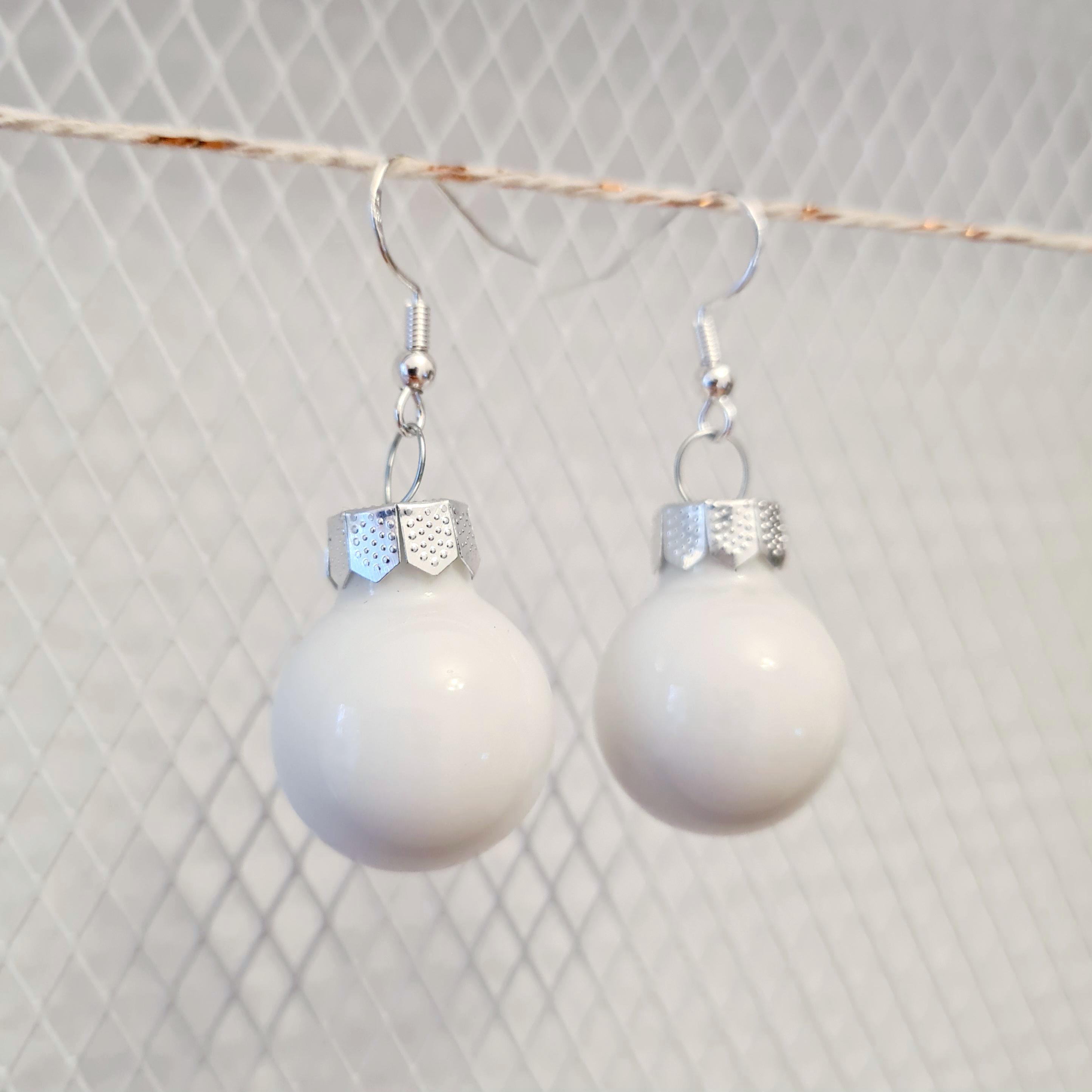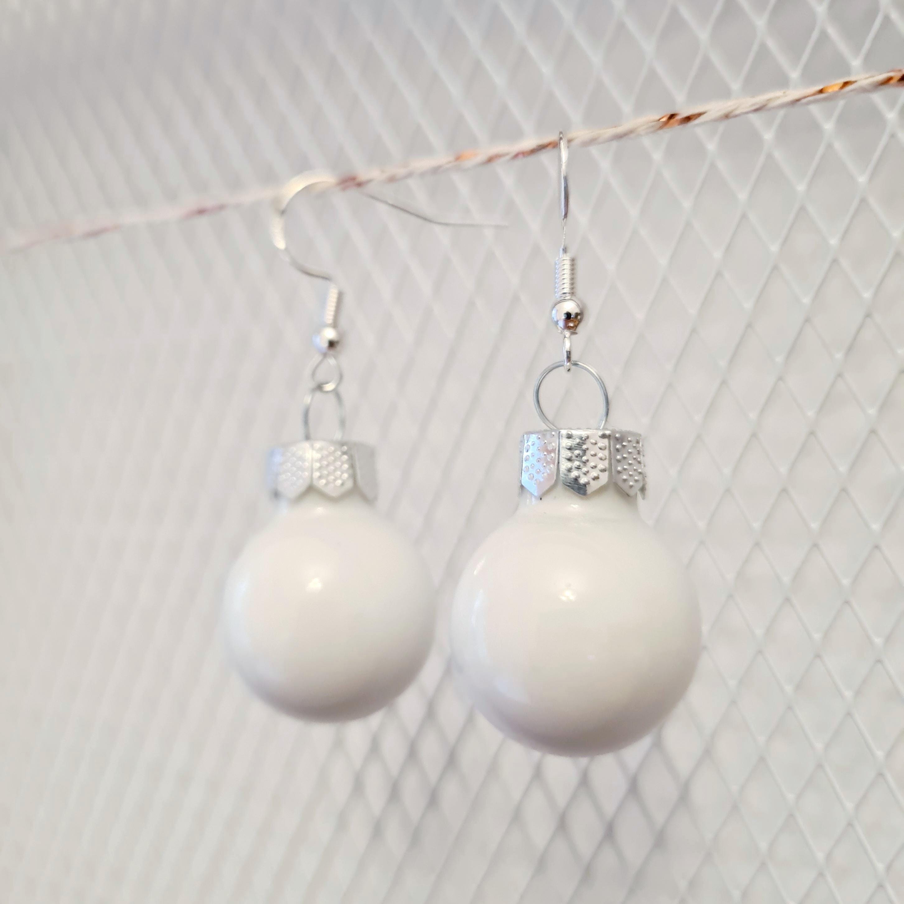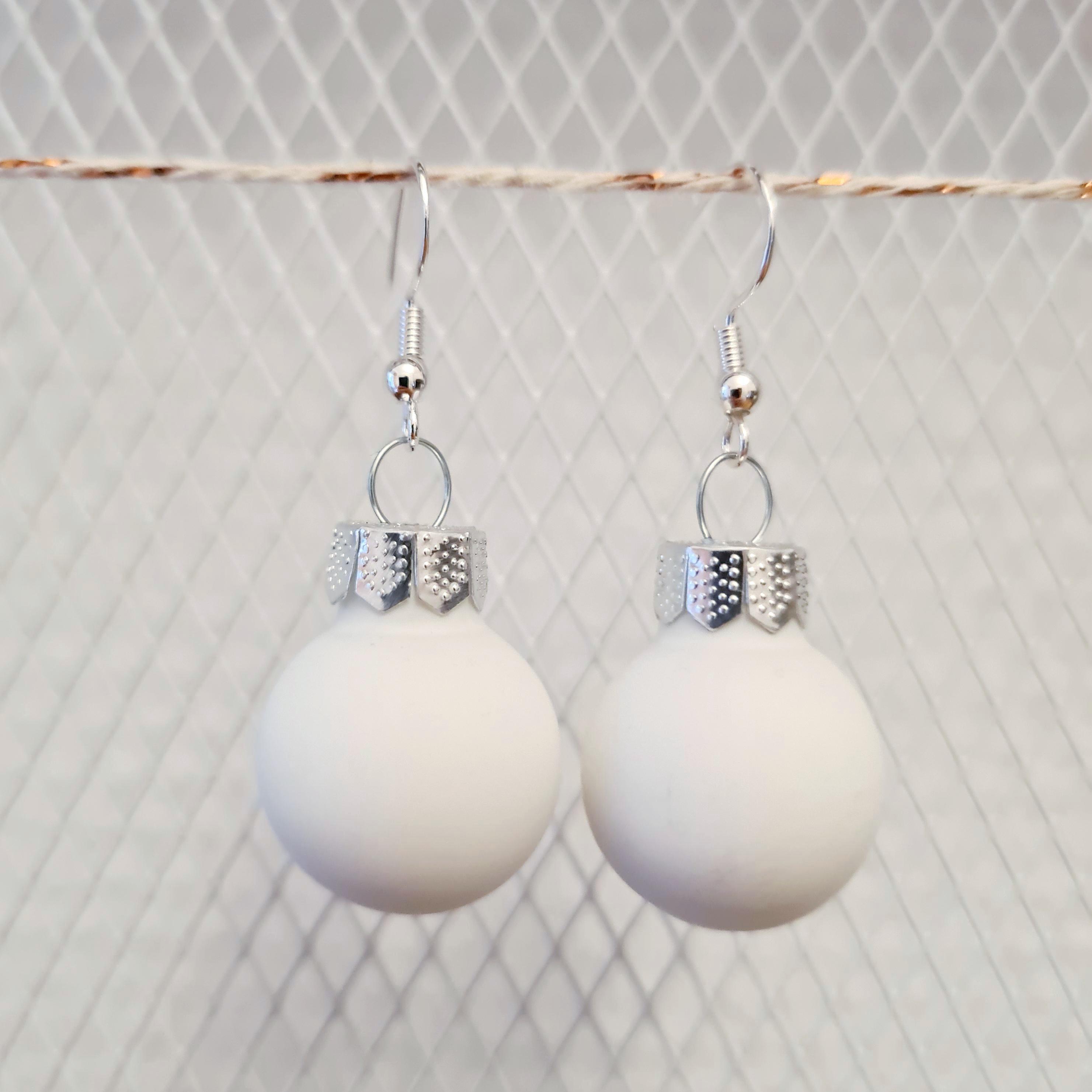 Christmas earrings with white Christmas tree baubles in matte or glossy finish.