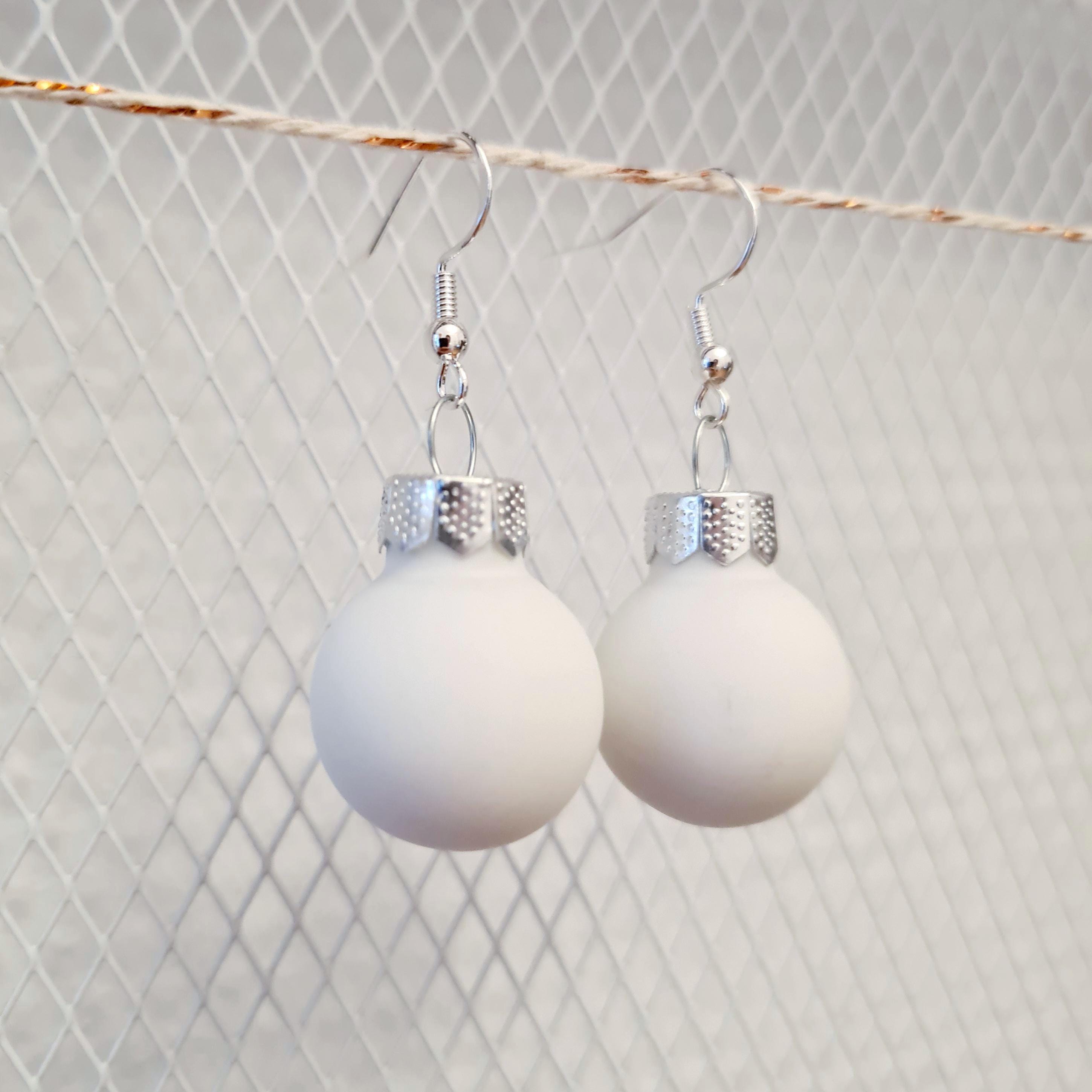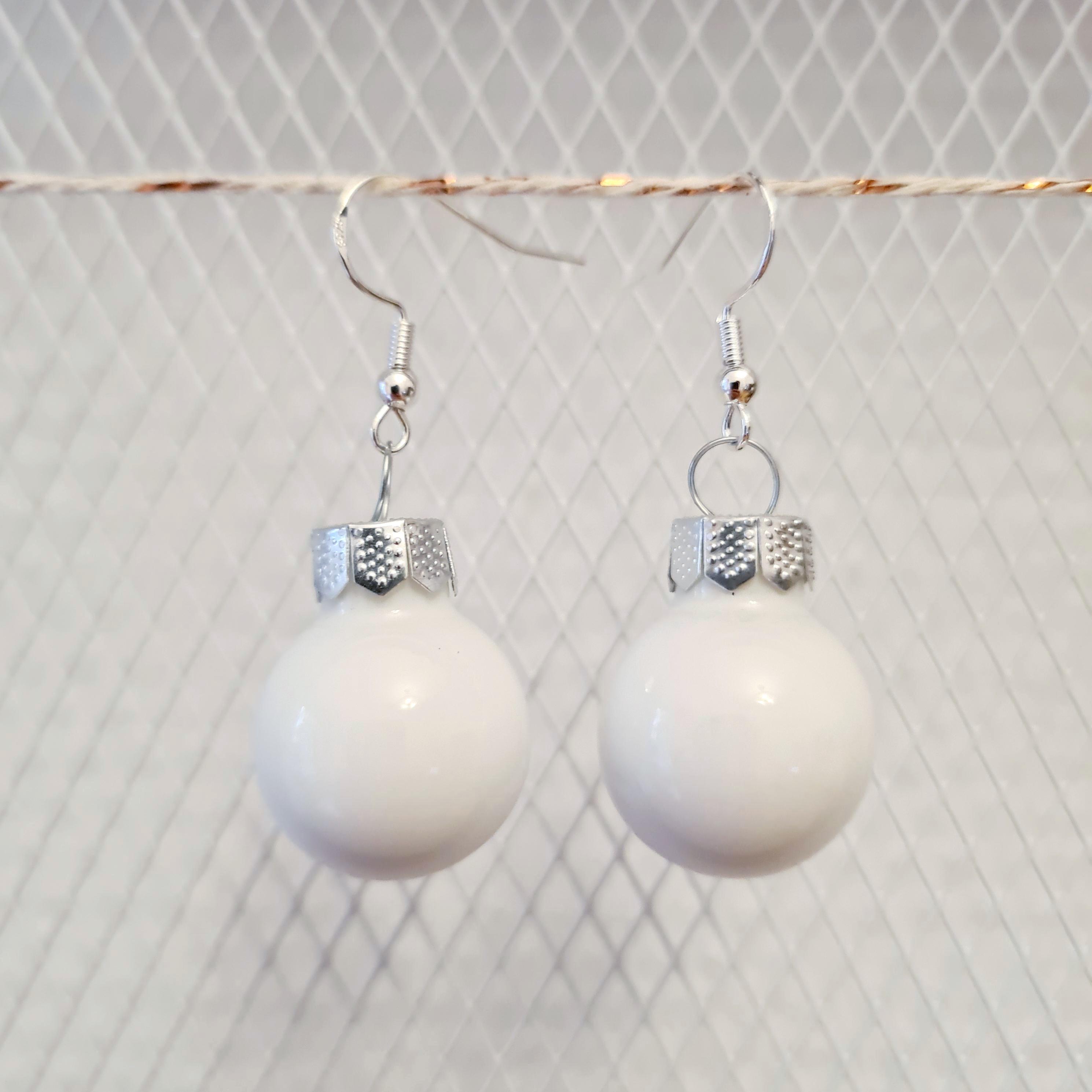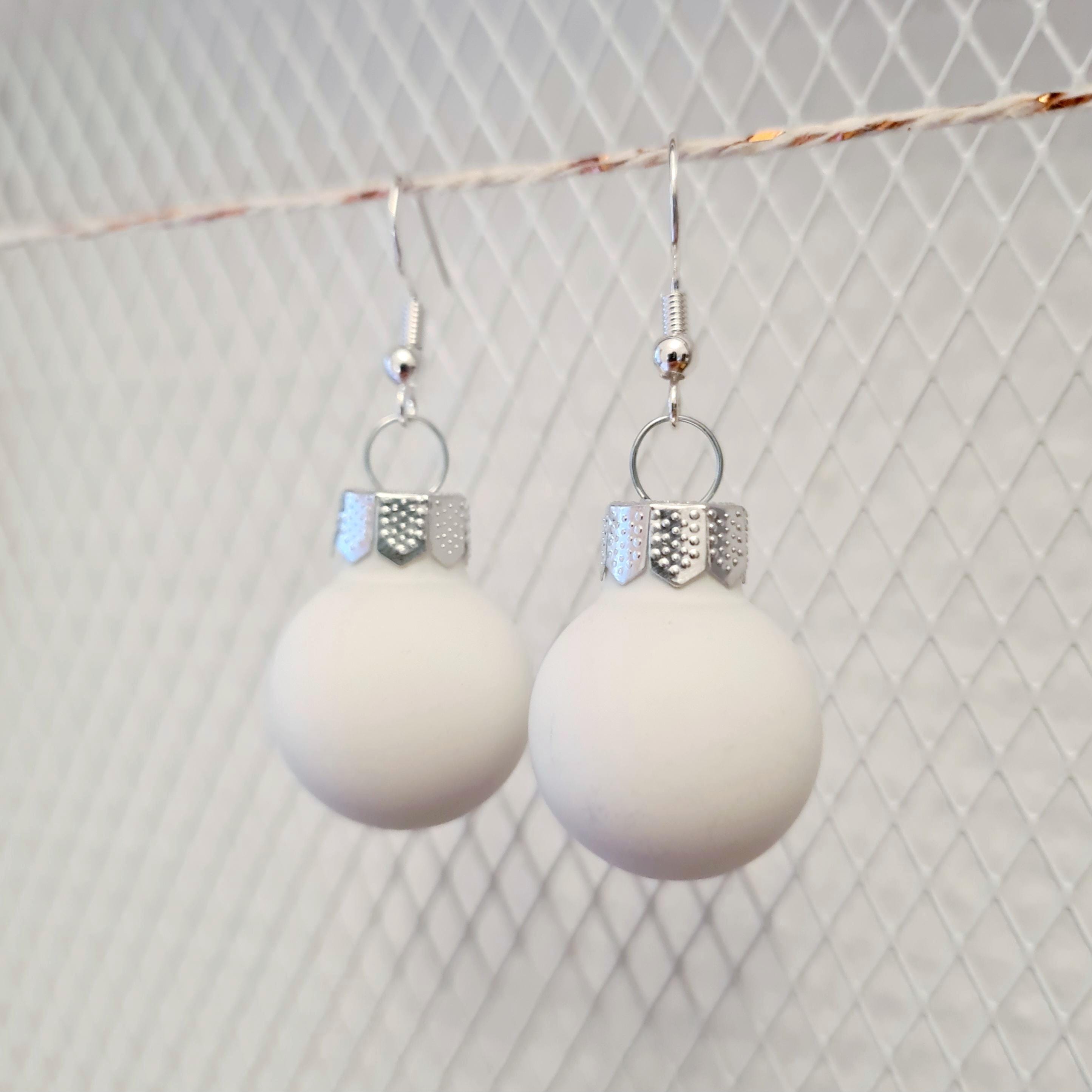 Christmas earrings with white Christmas tree baubles in matte or glossy finish.
