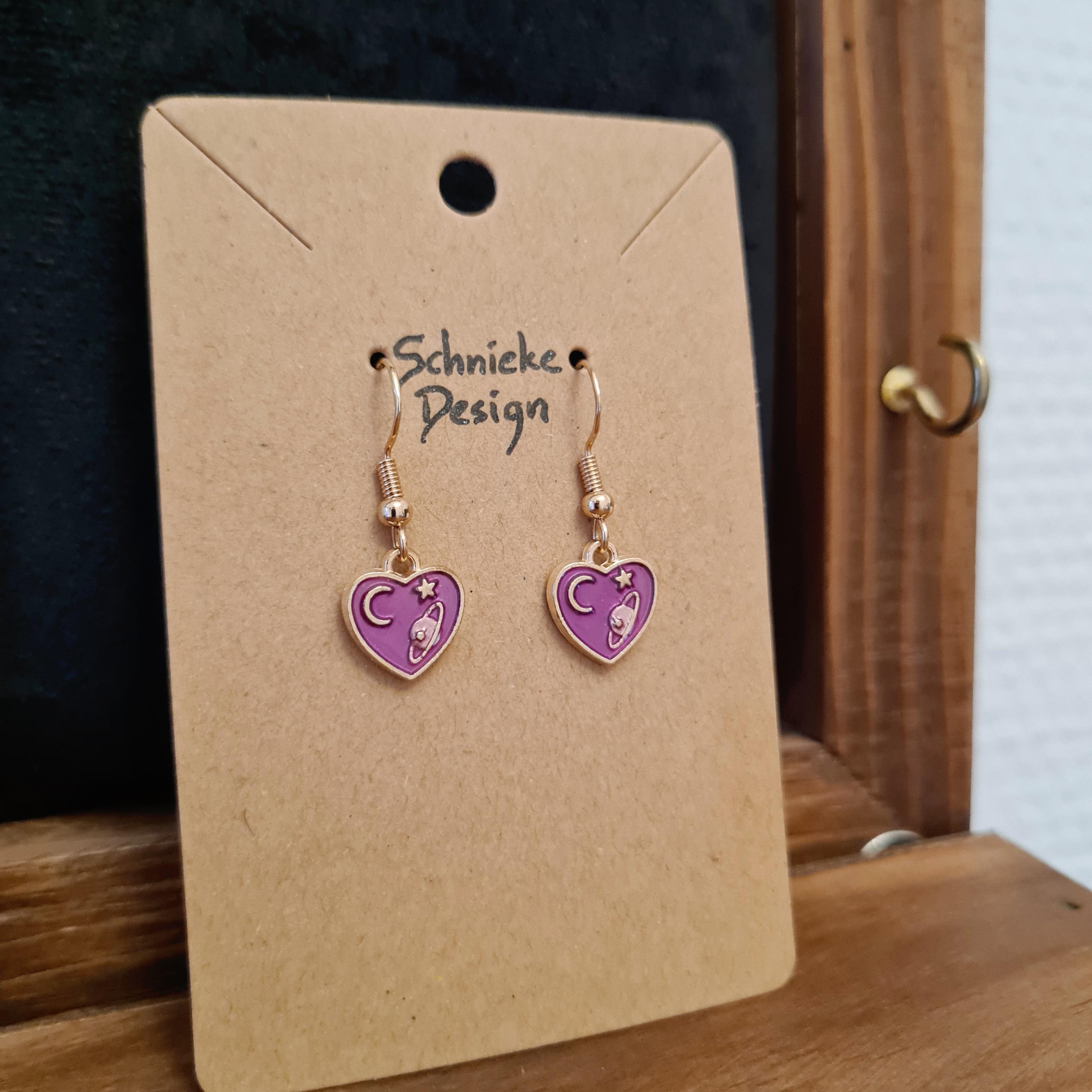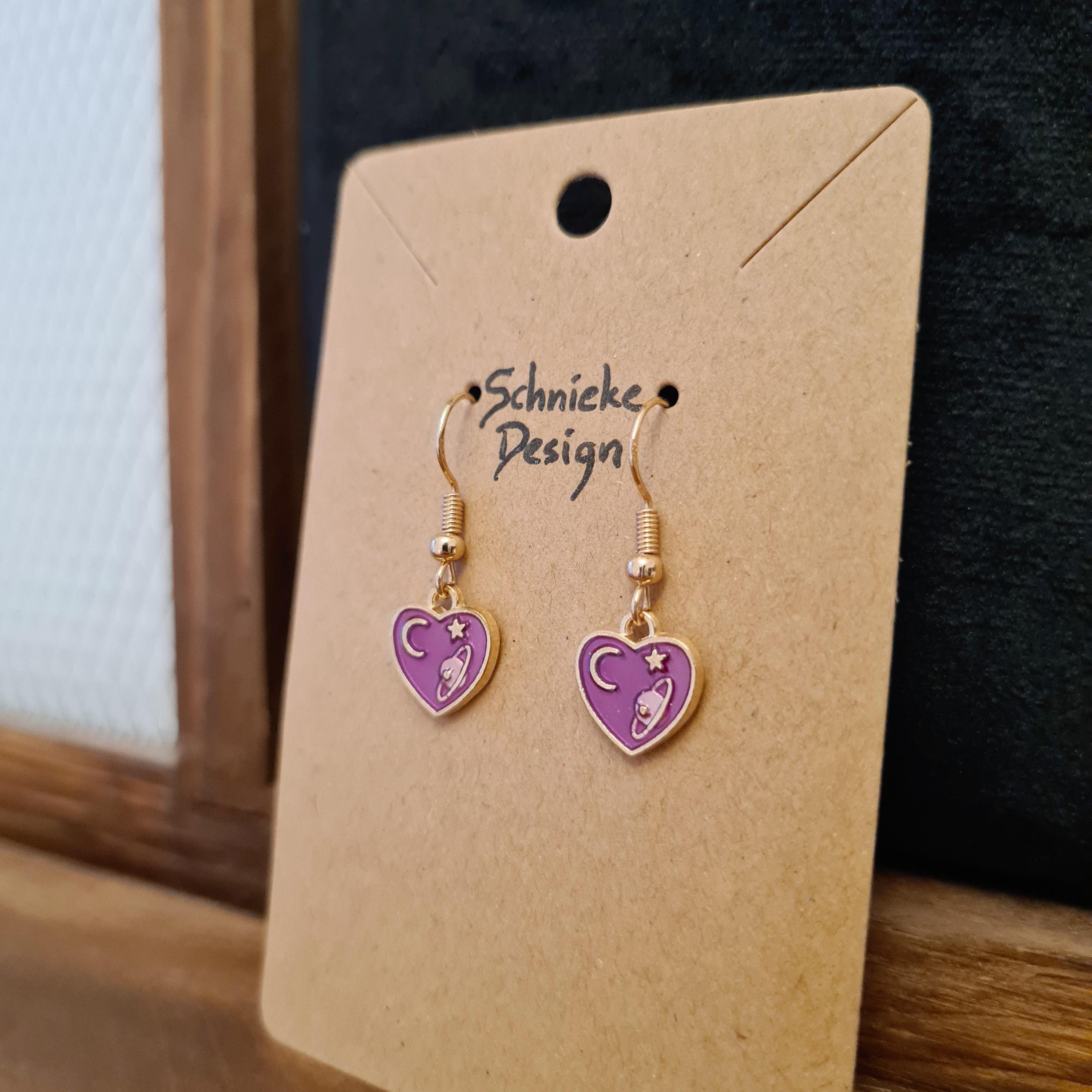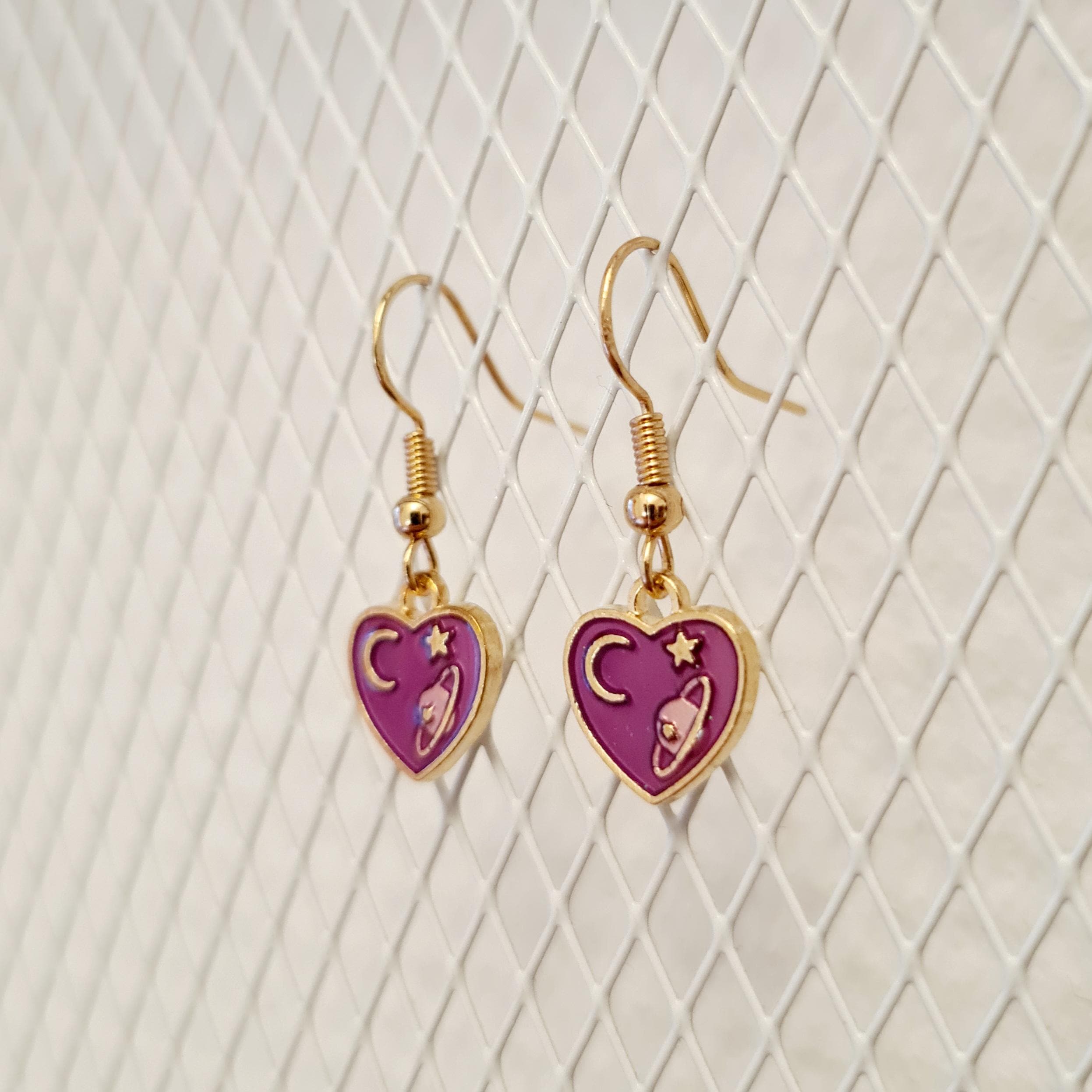 Earrings with purple hearts decorated with a golden moon, planet and star - made of enamel.