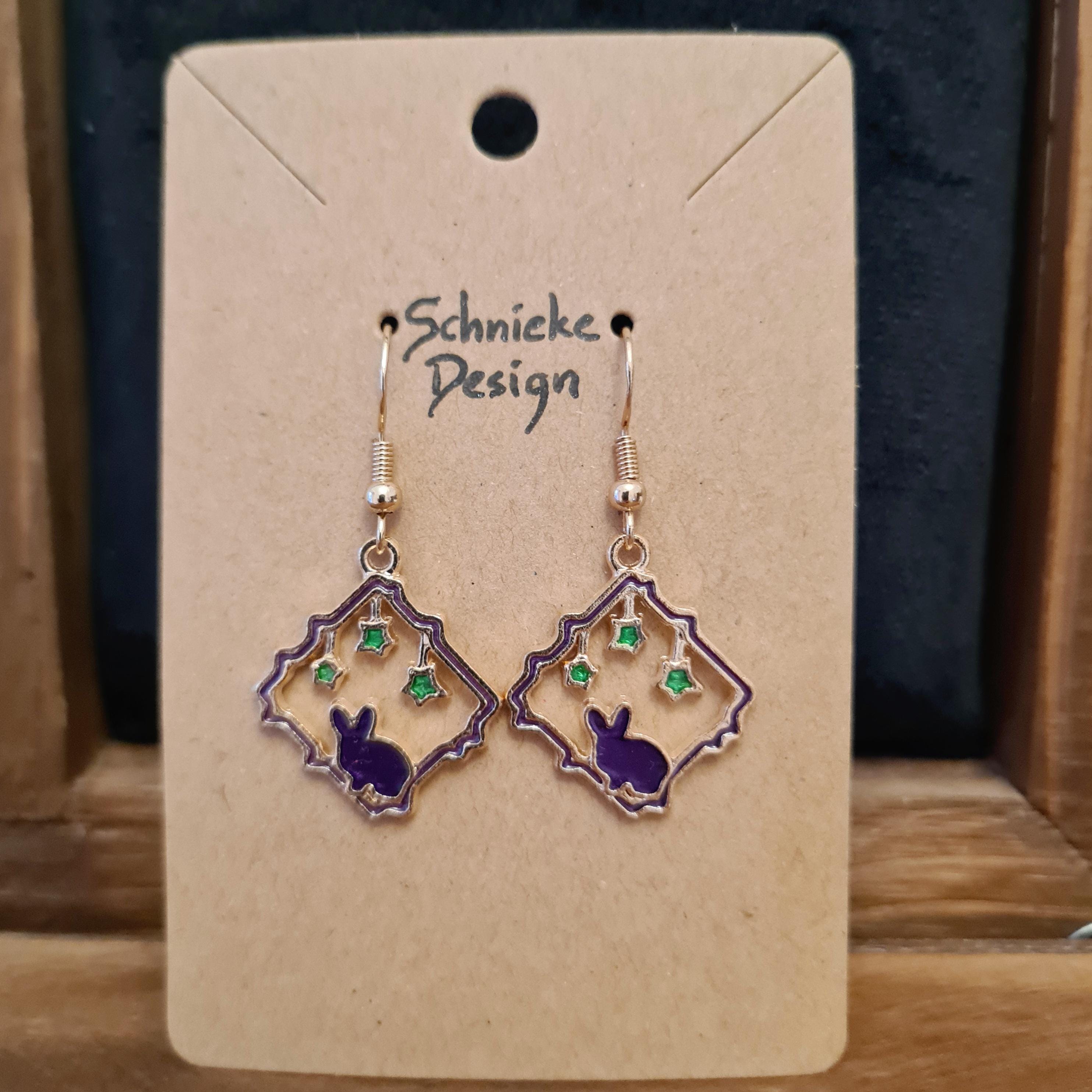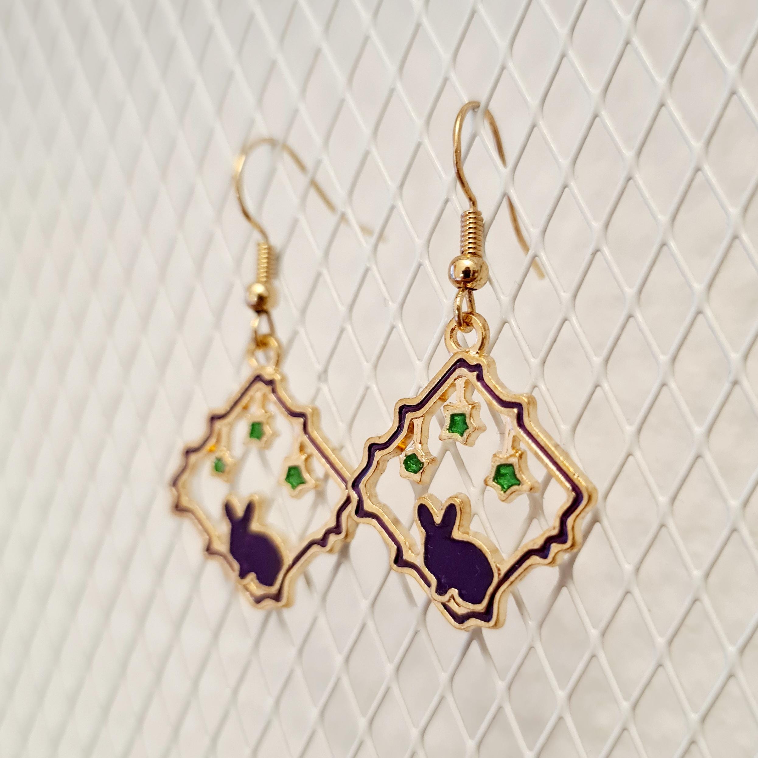 Earrings with purple rabbits and green enamel stars.