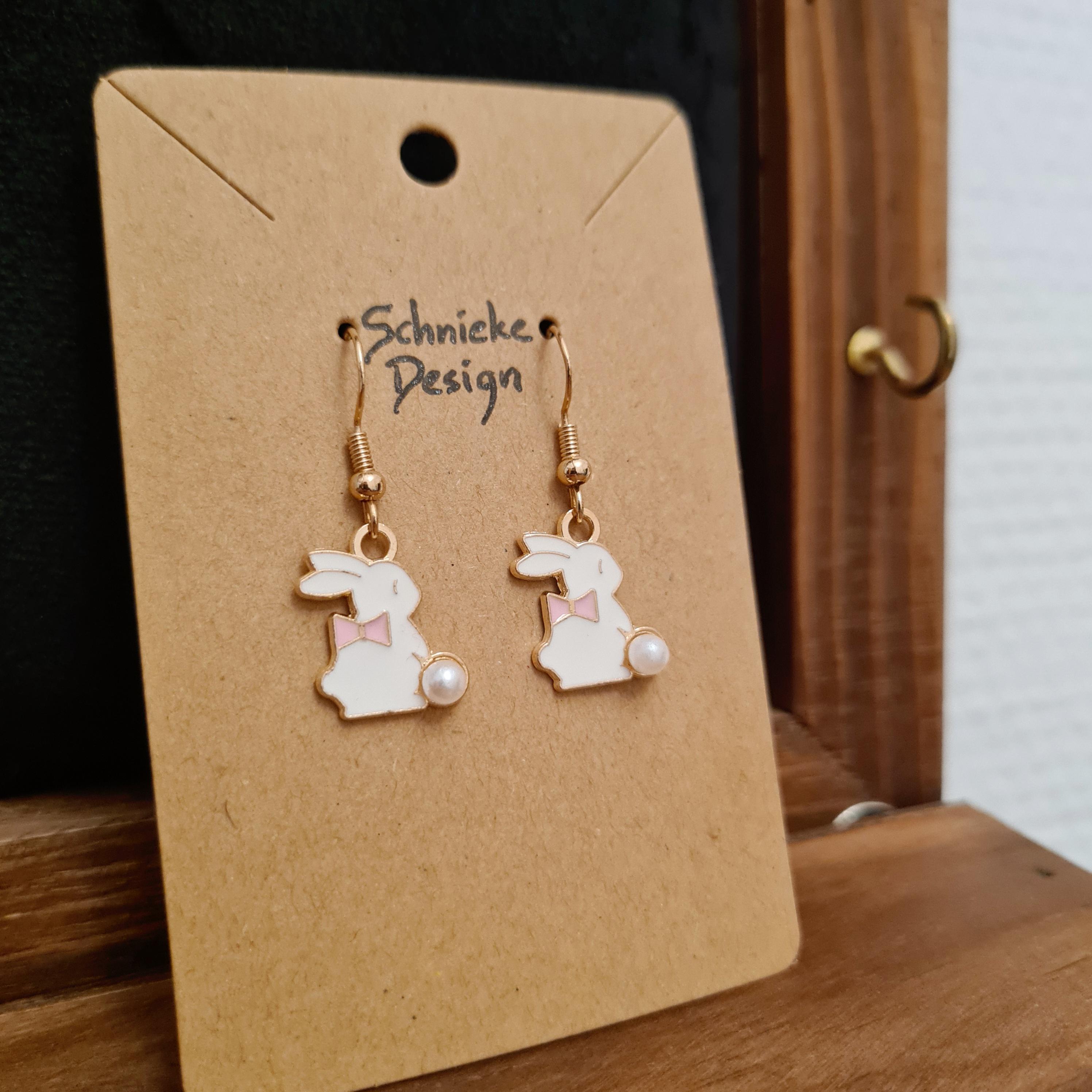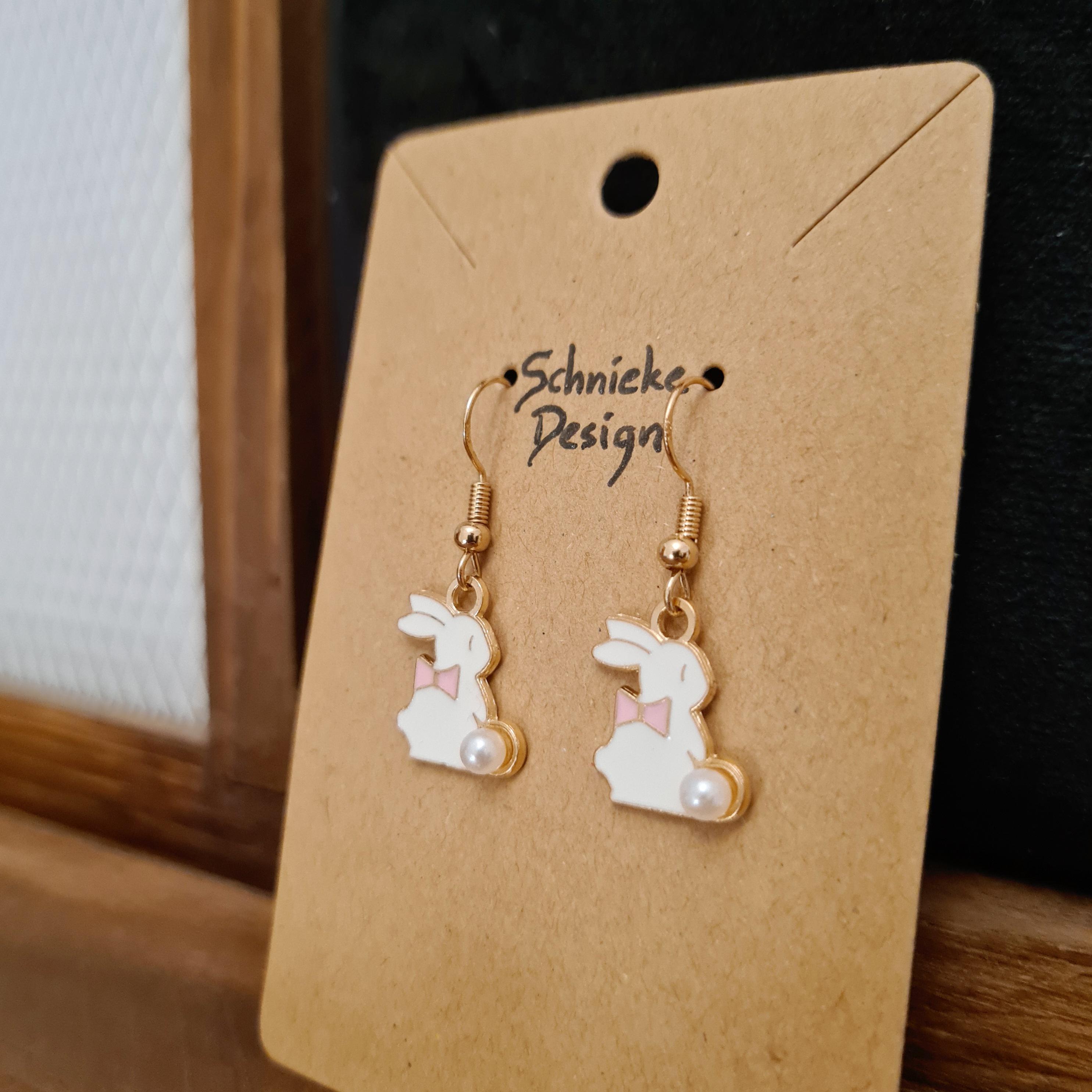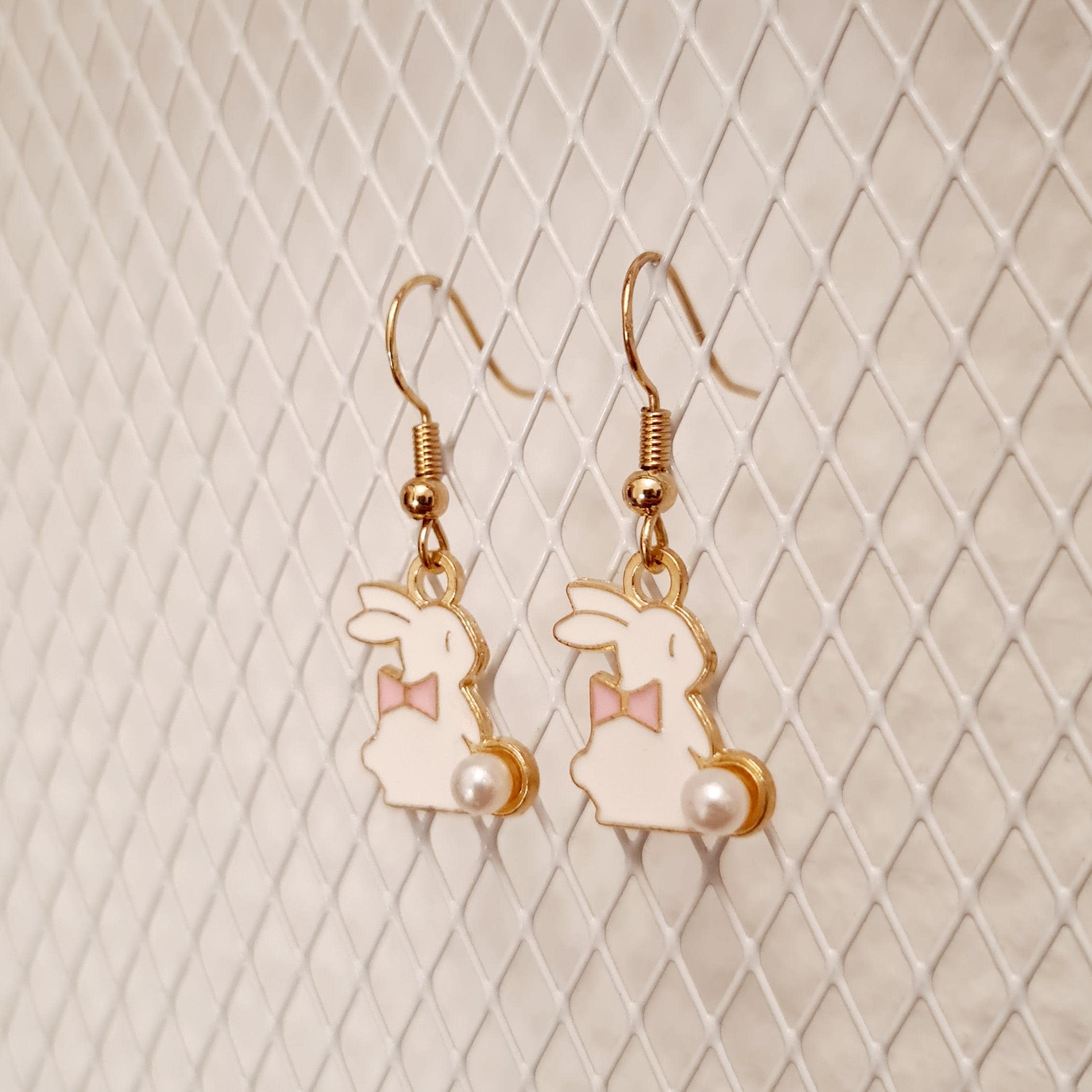Enamel and copper rabbit earrings. With a pearl egg and pink bow.