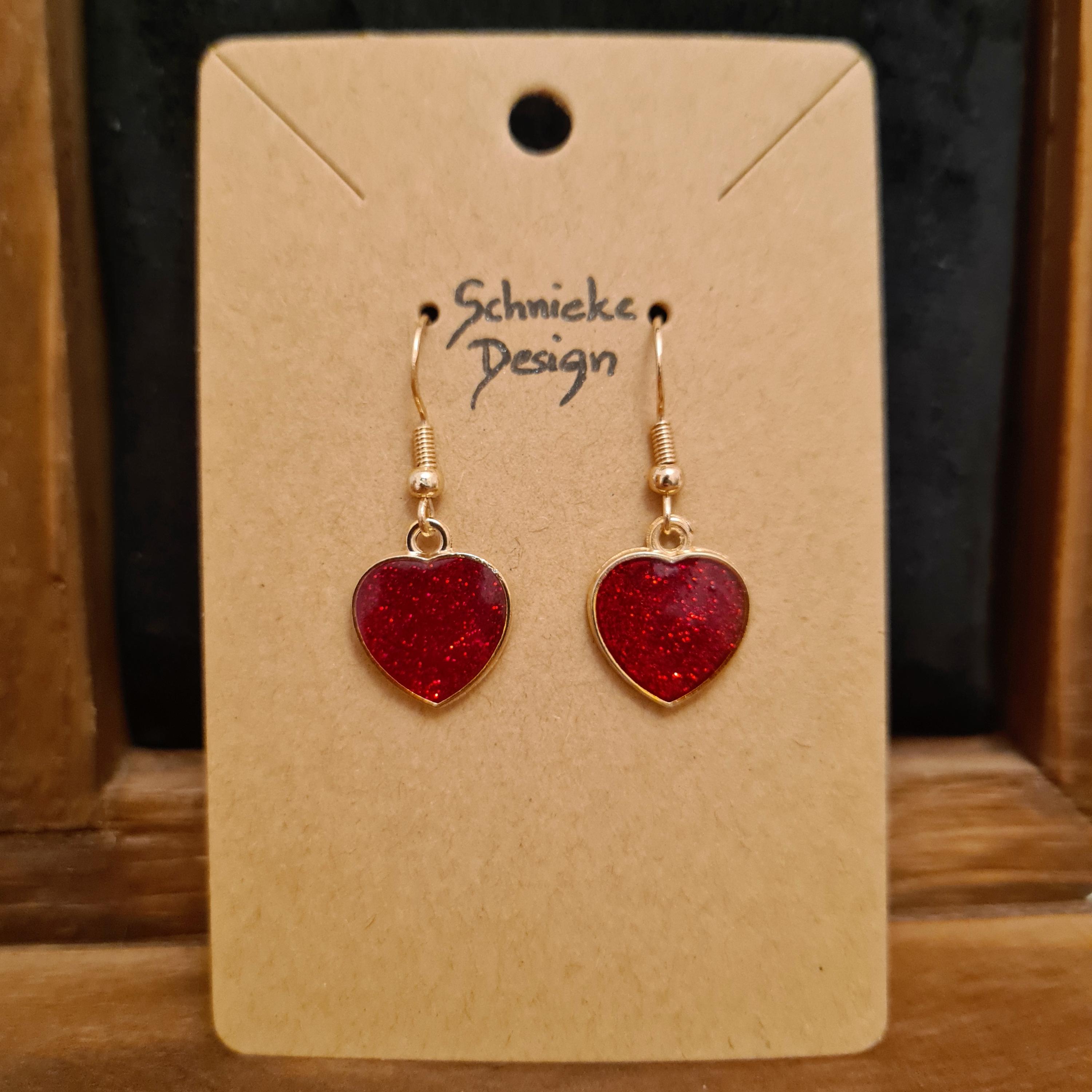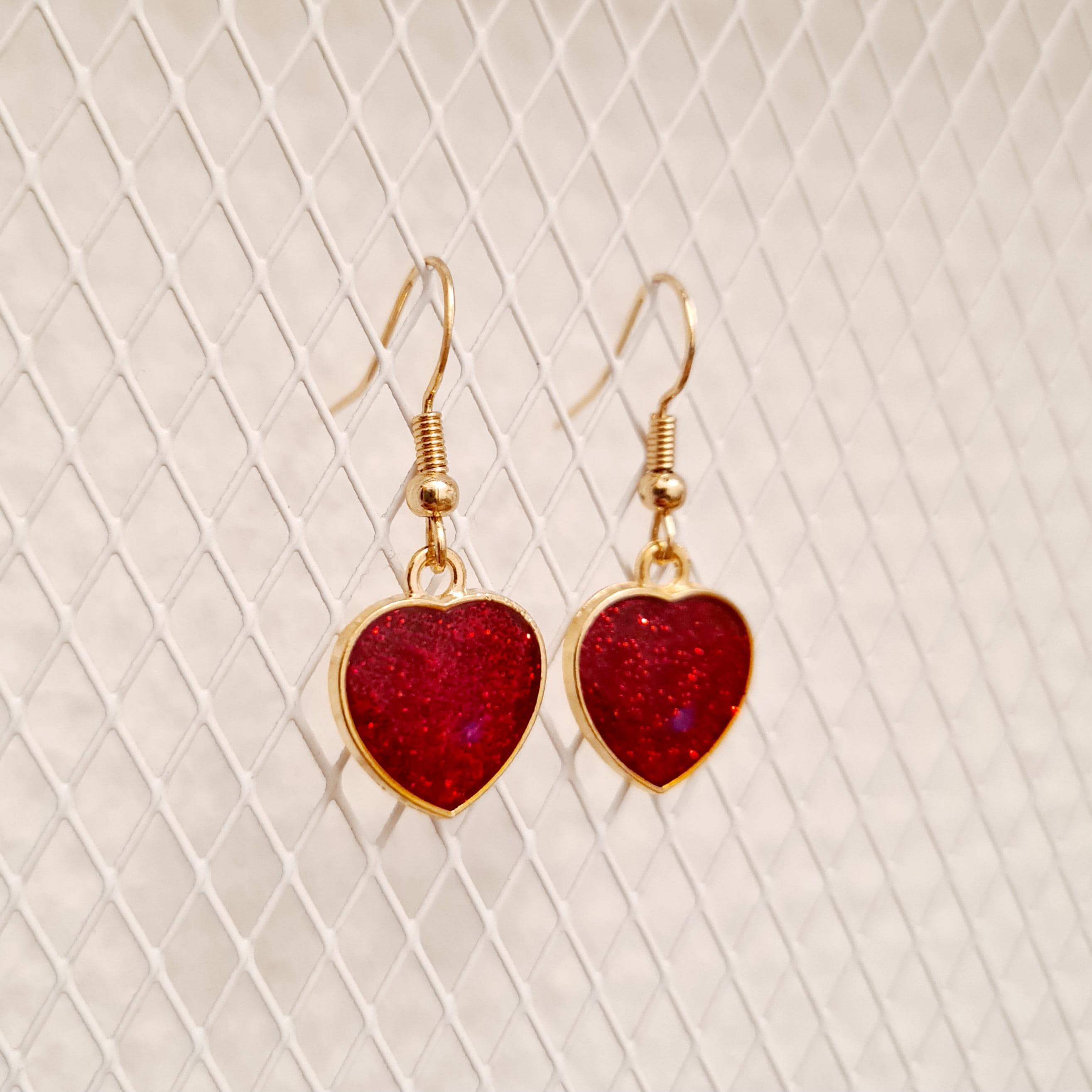 Earrings with glittering hearts in red and gold made of enamel.